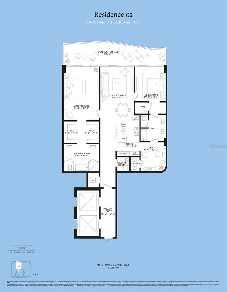 Pre-Construction. To be built. Pre-Construction. To be built. TOWER II. Soaring above the Iconic Bayshore Boulevard on Hillsborough Bay is The Ritz-Carlton Residences, Tampa, an oasis of sophistication that sets a new standard in exemplary design and gracious living. Inspired by the environment and composed for contemporary lifestyles, these breathtaking residences offer modern layouts, generous amenities, and unforgettable unobstructed Eastern views of Hillsborough open bay and downtown Tampa water views from all spacious tower balconies. In the evenings, enjoy gleaming Western sunset views. The Residences will be characterized by striking contemporary architecture by world-class firm Arquitectonica, exquisitely appointed amenity spaces designed by award-winning firm Meyer Davis Studio, and lush landscaping by renowned landscape artist, Enzo Enea. Residence 2302 is situated on the SE corner of the building and offers a well-appointed 1,960 SqFt floorplan featuring 2 bedrooms, 2.5 bathrooms, plus a den with access to a full bath. Completed with generous 10’0” high ceilings, floor-to-ceiling windows offering breathtaking views, private elevator access to your private entry foyer, Sub Zero and Wolf appliances complemented by bespoke Stone or Quartz countertops, custom-designed Italian Cabinetry by ItalKraft, spacious walk-in closets, high-end Kohler plumbing fixtures, and full-size top-of-the-line washers and dryers. Estimated Completion: 2025.