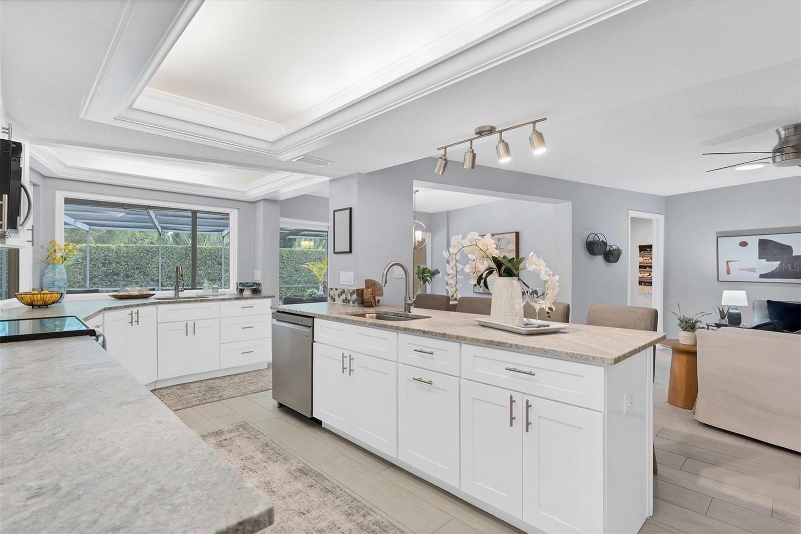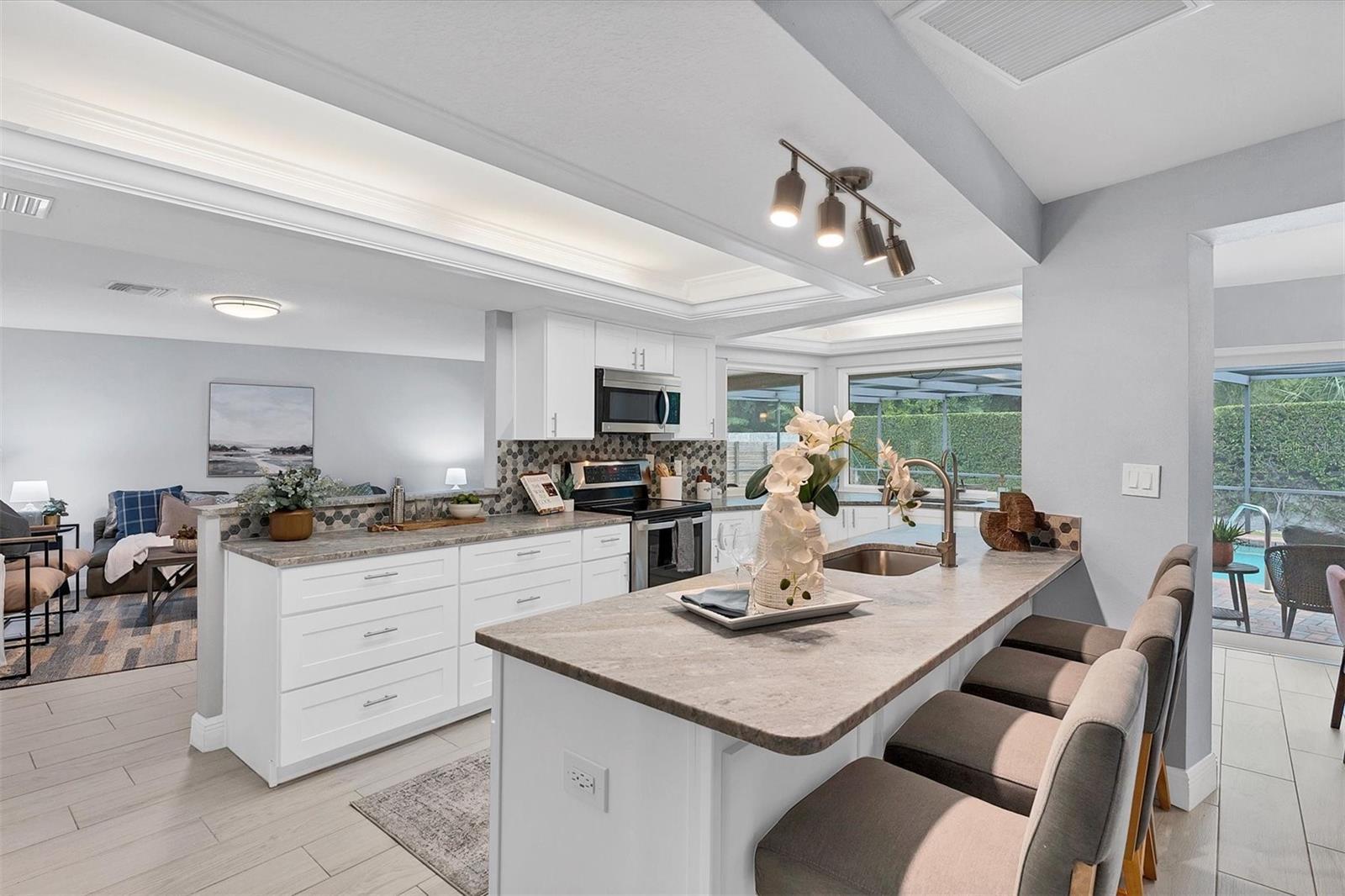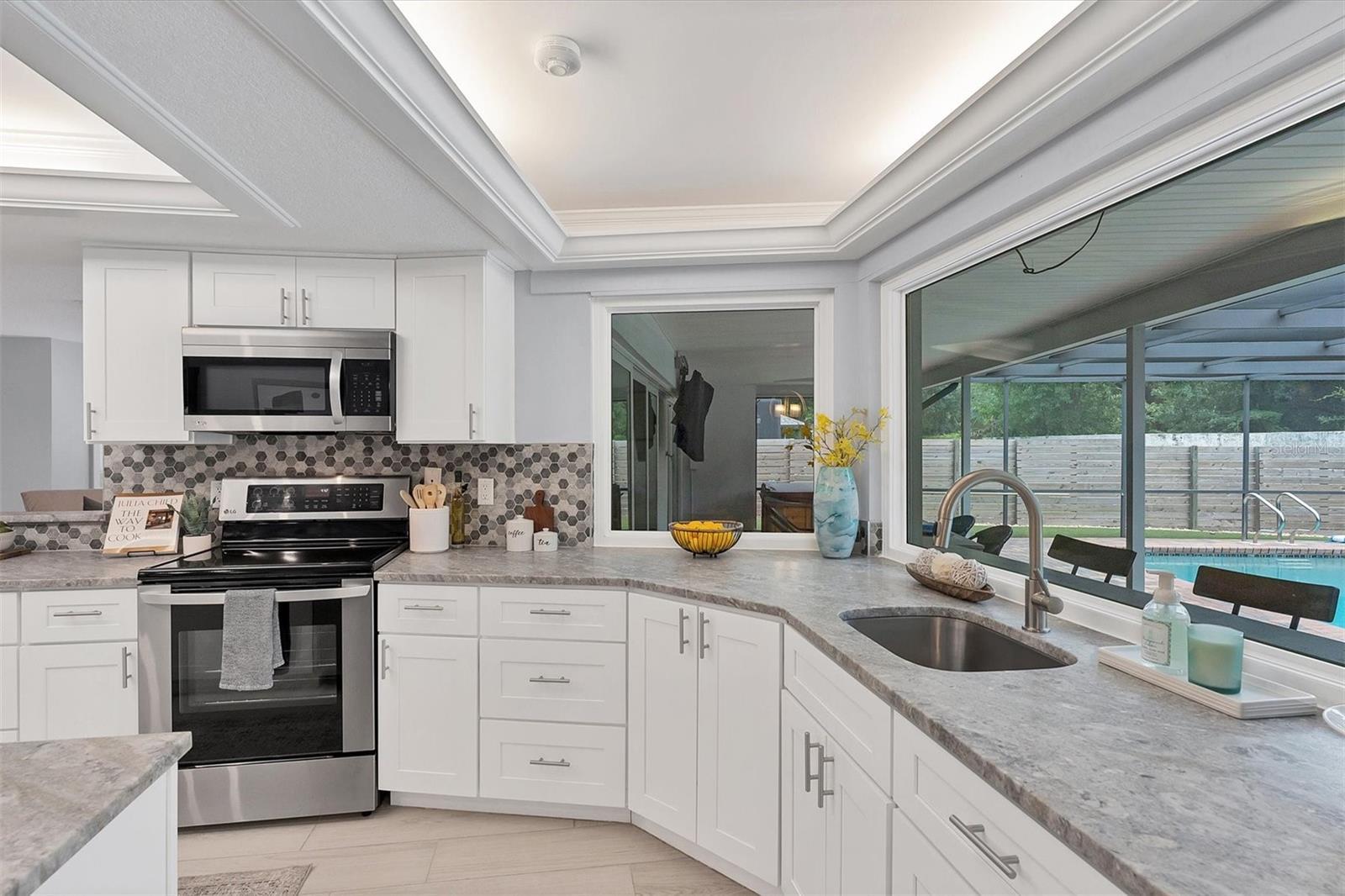 Under contract-accepting backup offers. BACK ON MARKET! PRICE REDUCED, for this incredible opportunity to own a beautiful home in Sweetwater! The Hurricane Helene flooding event in September has been professionally remediated, and this amazing home is like-new and better than ever! The beautifully appointed and spacious 4 BR/2.5 BA home, with 2-car garage and a huge pool, backs up to a wooded preserve. Located in the elegant and gated Sweetwater-Rocky Point. Very convenient to Tampa Airport, MacDill AF Base, and Berkeley Prep. Walk through the double front doors and take in the immediate view through to the private, walled backyard-pool! Lush, newly designed landscaped yards, with $25K spent on landscape design, in addition to backyard regrading and rock borders. The upgraded backyard turf (K9 turf) is constructed of special drainage material. The renovated interior includes: porcelain floor tile in LR, DR, FR, kitchen, dressing area and baths. A working wood-burning fireplace, Eat-in Kitchen with breakfast bar and nook. Brand-new carpeting in all bedrooms. Upgraded cabinets and granite countertops in the kitchen, bathrooms, dressing area, and laundry room. All new light fixtures and fans. New sliders and windows, New water heater. New hurricane rated garage door, a rennovated (2024) solar energy system, and pool heater. A gourmet's kitchen is central to the home, with easy-flowing access to the living room, family room, formal dining and casual dining rooms, as well as the pool. Maximum functionality with tall pantry, giant lazy-Susan, quiet closing drawers, including two dish drawers, 2 sinks, and an outdoor poolside counter. The spacious primary bedroom suite has double sliding doors opening to the poolside heated SPA and lanai, as well as a dressing area with large walk-in closet (with custom built-in closet system) and second closet (8 feet long), double sinks, walk-in Roman bath/shower combo. The 2nd and 3rd BRs share full bath, which has pool access. The fourth BR (easily a home office) has direct exterior access with sliders, and includes its own 1/2 bath. ENERGY UPGRADES: A recently-rennovated 10.2kw solar system is monitored free of charge by SOLAR22 until December 2024. Two solar-tube skylights help to flood the house with abundant natural light. Brand-new main roof (September 2024), 2016 lanai flat-roof, spray-foam insulation in attic greatly reduces your electric bills (TECO buys excess energy); Newer LG kitchen appliances; new A/C duct work, with a brand new HVAC installed in October 2024; New pool pump. New paint and new baseboards throughout. And with many extras, too numerous to list. This amazing home shows like a dream. Book your appointment TODAY before it's gone!