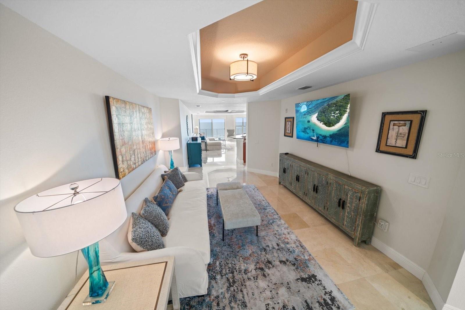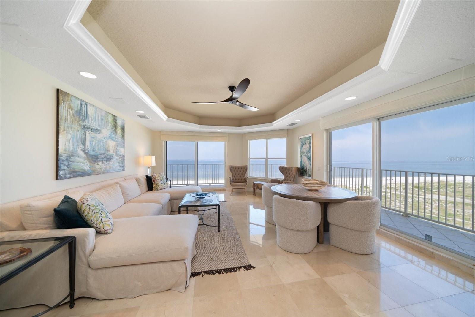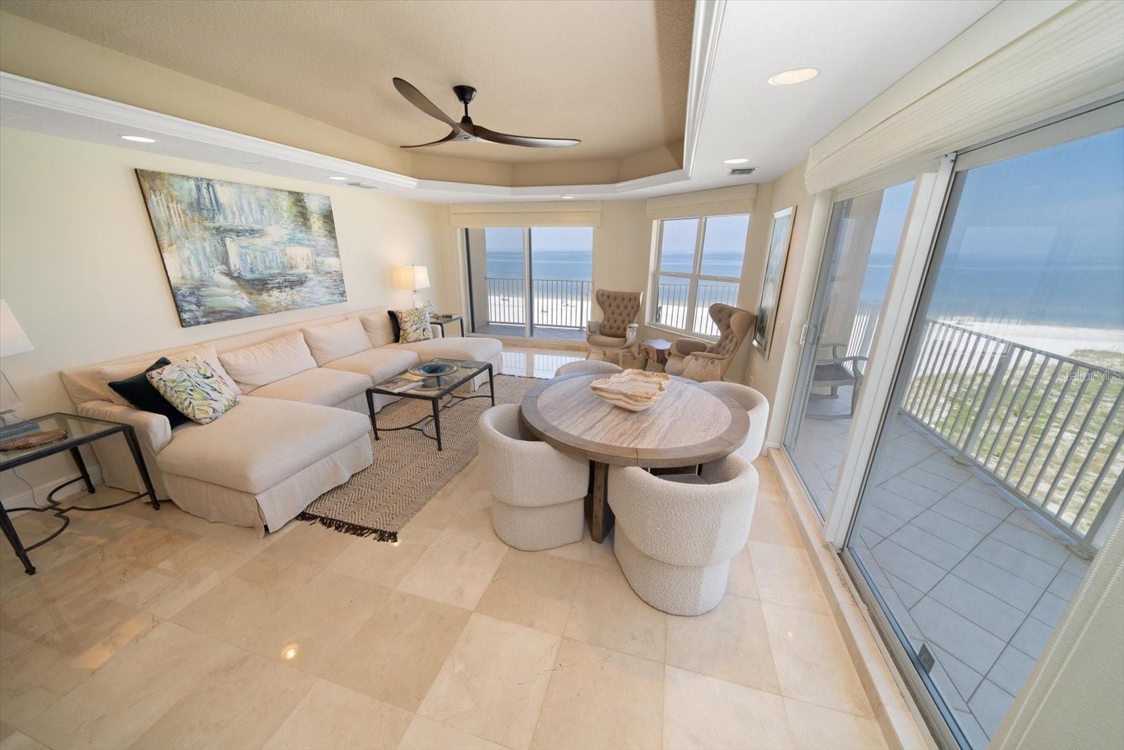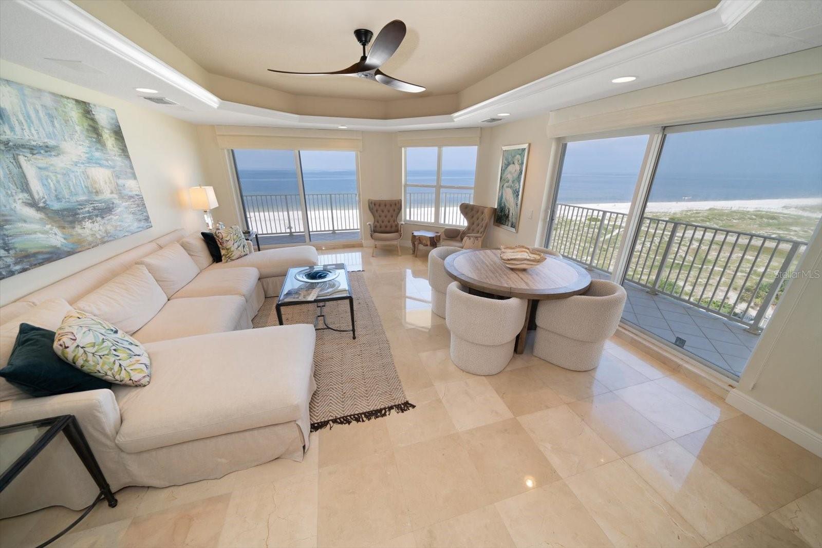 THE DIRECT GULF OF MEXICO, FAR WEST HORIZON, YEAR LONG SUNSET, SHORELINE ALL THE WAY DOWN TO CALADESI ISLAND VIEW IS A GIVEN WITHIN THIS FRONT AND CORNER NORTH CLEARWATER BEACH CONDO HOME SITED WITHIN THE BOUTIQUE BUILDING THAT IS CHATEAUS ON WHITE SANDS- APTLY NAMED FOR THE PRISTINE SUGAR SANDS THAT LAY BEFORE YOU WITHIN THIS RAREFIED & TREASURED GEOGRAPHY. But, now comes the nuance that makes for extraordinary living..IMAGINE BEING TWO BLOCKS AWAY FROM EVERY RESTAURANT, PUB, GELATO BAR, NOT TO MENTION A CONDE NAST RATED RESORT, AND YET BE ON THE MOST SERENE STRETCH OF SUN, SAND & SEA WITHIN THE NORTH BEACH CORRIDOR. Now, enter 6A, a 2,700 plus square foot 3 BEDROOM,3.5 BATH..BUT HERE’S MORE NUANCE, THERE’S A 4th ROOM THAT MAY BECOME: A SLEEPING OPTION, REMAIN THE HOME THEATRE, OR ANYTHING ELSE YOUR FAMILY AND ENTERTAINING DYNAMIC MAY REQUEST. A PRIVATE ELEVATOR VESTIBULE OPENS TO A WHOLLY INTEGRATED GREAT ROOM, DINING AREA, KITCHEN, AND LIVING ROOM. WHILE 3 BEDROOMS ENJOY EN SUITE STATUS W/ THEIR OWN ADJOINING BATHS AND WALK-IN CLOSETS WHICH MAKES FOR SUPERLATIVE AND PRIVATE LIVING. THE PRIMARY HOUSES A SPA BATH, TWO SIDE BY SIDE VOLUME WALK-INS, A GENEROUS SITTING AREA AND BALCONY WITH GULF & INTRACOASTAL VISTAS. ALL BUT ONE BEDROOM HAS BALCONY/TERRACE ACCESS. As for the interiors? Imagine warm, neutral paint treatments, custom all wood kitchen cabinetry, stone counters, HIGHLINE appliances inclusive of Thermador and Sub zero, stone counters, marble flooring, and stone and tile encased baths belying a transitional aesthetic. THE RESORT DRIVEN AMENITIES INCLUDE A SEASIDE POOL, SOCIAL ROOM FOR ENTERTAINING, AND FITNESS. TWO UNDER THE BUILDING PARKING SPACES CONVEY IN THE SALE OF THIS REMARKABLE RESIDENCE. I await your impressions..