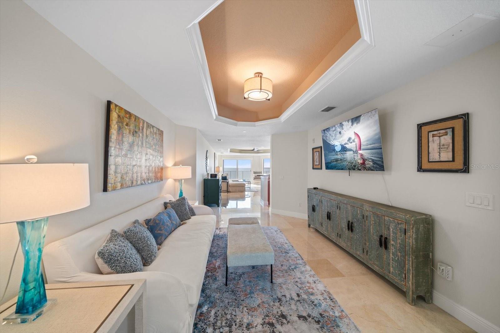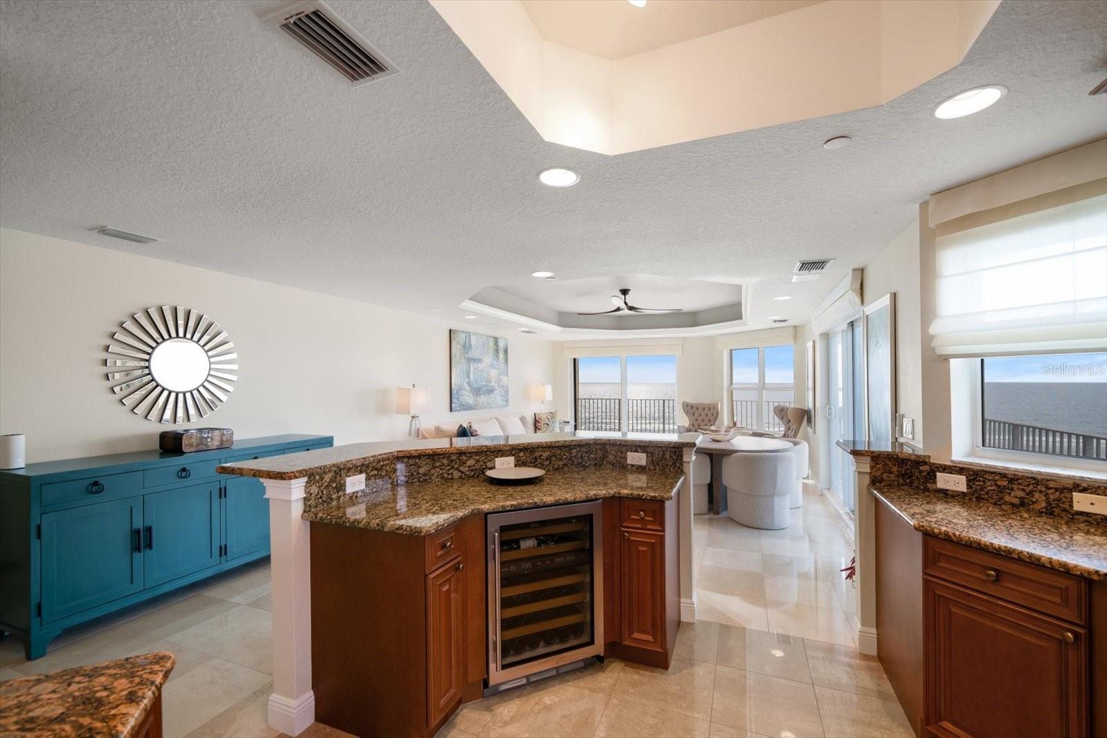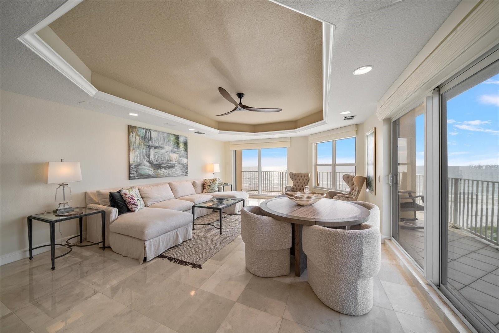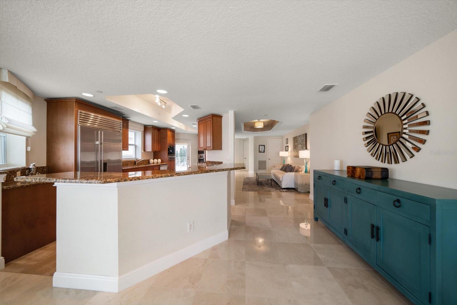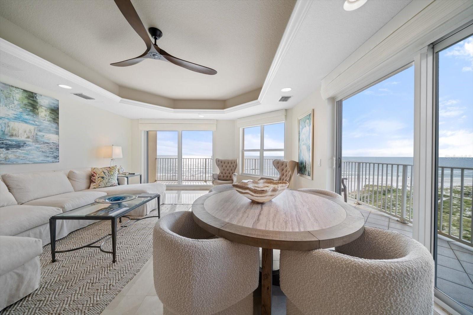 THE DIRECT GULF OF MEXICO, FAR WEST HORIZON, YEAR LONG SUNSET, SHORELINE ALL THE WAY DOWN TO CALADESI ISLAND VIEW IS A GIVEN WITHIN THIS FRONT AND CORNER NORTH CLEARWATER BEACH CONDO HOME SITED WITHIN THE BOUTIQUE BUILDING THAT IS CHATEAUS ON WHITE SANDS- APTLY NAMED FOR THE PRISTINE SUGAR SANDS THAT LAY BEFORE YOU WITHIN THIS RAREFIED & TREASURED GEOGRAPHY. But, now comes the nuance that makes for extraordinary living..IMAGINE BEING TWO BLOCKS AWAY FROM EVERY RESTAURANT, PUB, GELATO BAR, NOT TO MENTION A CONDE NAST RATED RESORT, AND YET BE ON THE MOST SERENE STRETCH OF SUN, SAND & SEA WITHIN THE NORTH BEACH CORRIDOR. Now, enter 6A, a 2,700 plus square foot 3 BEDROOM,3.5 BATH..BUT HERE’S MORE NUANCE, THERE’S A 4th ROOM THAT MAY BECOME: A SLEEPING OPTION, REMAIN THE HOME THEATRE, OR ANYTHING ELSE YOUR FAMILY AND ENTERTAINING DYNAMIC MAY REQUEST. A PRIVATE ELEVATOR VESTIBULE OPENS TO A WHOLLY INTEGRATED GREAT ROOM, DINING AREA, KITCHEN, AND LIVING ROOM. WHILE 3 BEDROOMS ENJOY EN SUITE STATUS W/ THEIR OWN ADJOINING BATHS AND WALK-IN CLOSETS WHICH MAKES FOR SUPERLATIVE AND PRIVATE LIVING. THE PRIMARY HOUSES A SPA BATH, TWO SIDE BY SIDE VOLUME WALK-INS, A GENEROUS SITTING AREA AND BALCONY WITH GULF & INTRACOASTAL VISTAS. ALL BUT ONE BEDROOM HAS BALCONY/TERRACE ACCESS. As for the interiors? Imagine warm, neutral paint treatments, custom all wood kitchen cabinetry, stone counters, HIGHLINE appliances inclusive of Thermador and Sub zero, stone counters, marble flooring, and stone and tile encased baths belying a transitional aesthetic. THE RESORT DRIVEN AMENITIES INCLUDE A SEASIDE POOL, SOCIAL ROOM FOR ENTERTAINING, AND FITNESS. TWO UNDER THE BUILDING PARKING SPACES CONVEY IN THE SALE OF THIS REMARKABLE RESIDENCE. I await your impressions..