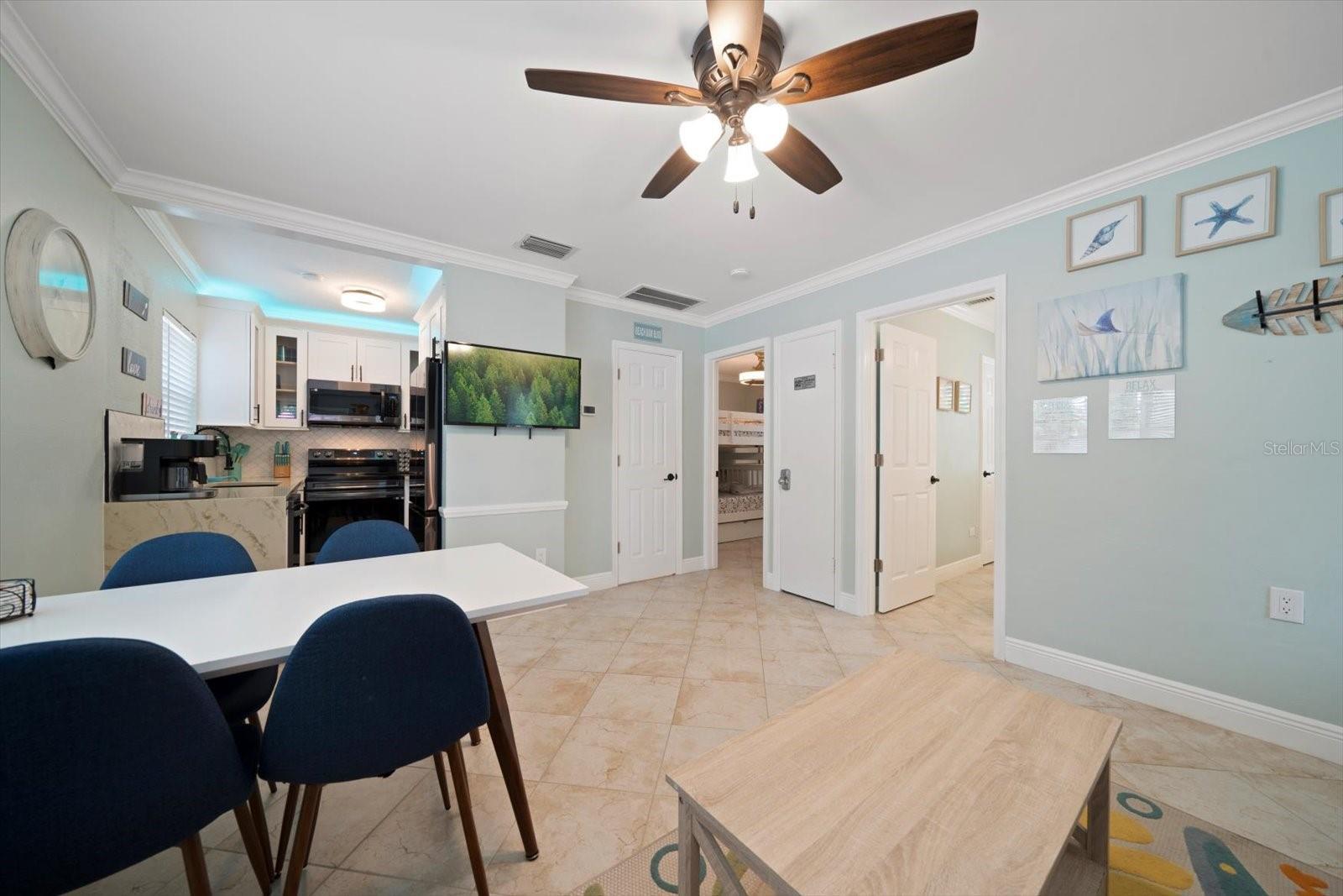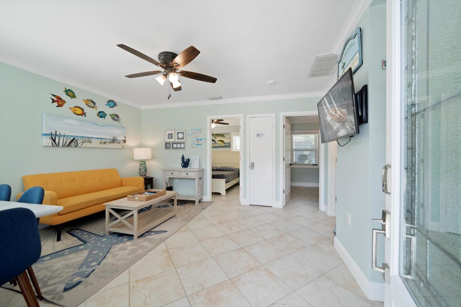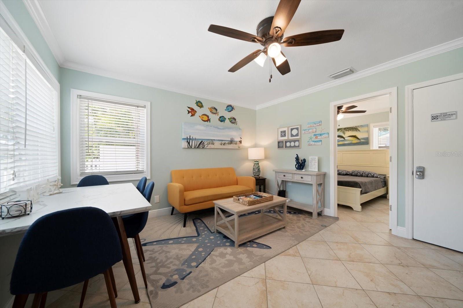 - Ceiling Fans(s), Crown Molding, Living Room/Dining Room Combo, Open Floorplan, Primary Bedroom Main Floor, Solid Surface Counters, Stone Counters, Window Treatments