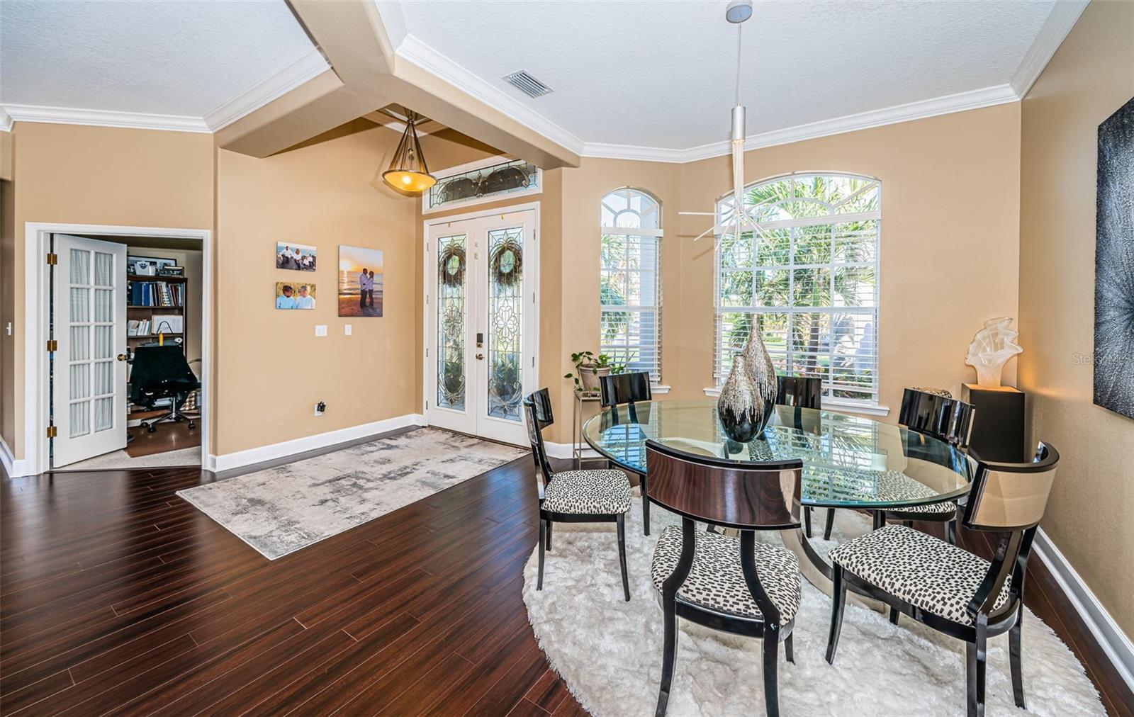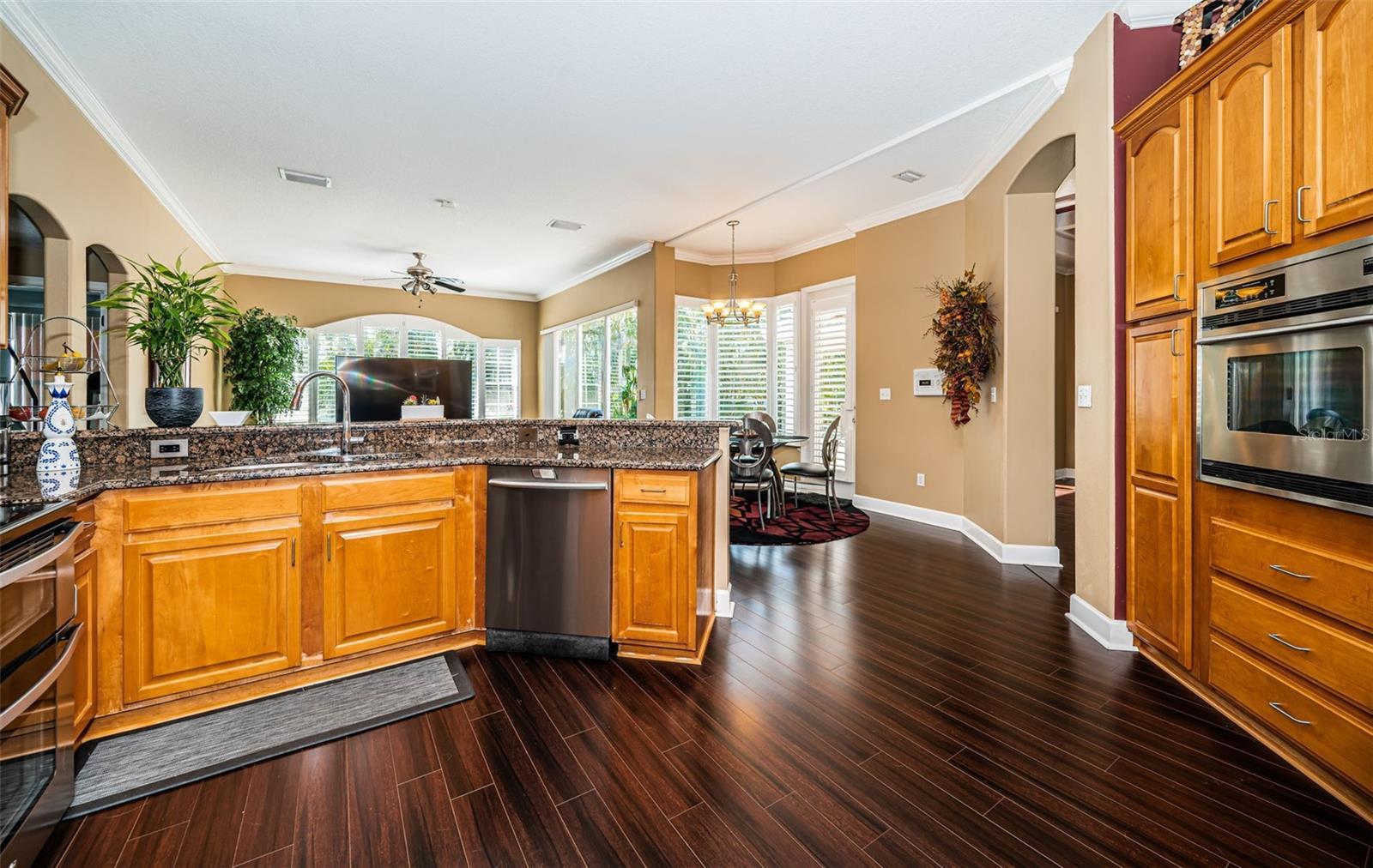 - Cathedral Ceiling(s), Ceiling Fans(s), Crown Molding, Eat-in Kitchen, High Ceilings, Kitchen/Family Room Combo, Living Room/Dining Room Combo, Open Floorplan, Primary Bedroom Main Floor, Solid Surface Counters, Solid Wood Cabinets, Split Bedroom, Stone Counters, Thermostat, Vaulted Ceiling(s), Walk-In Closet(s), Window Treatments
