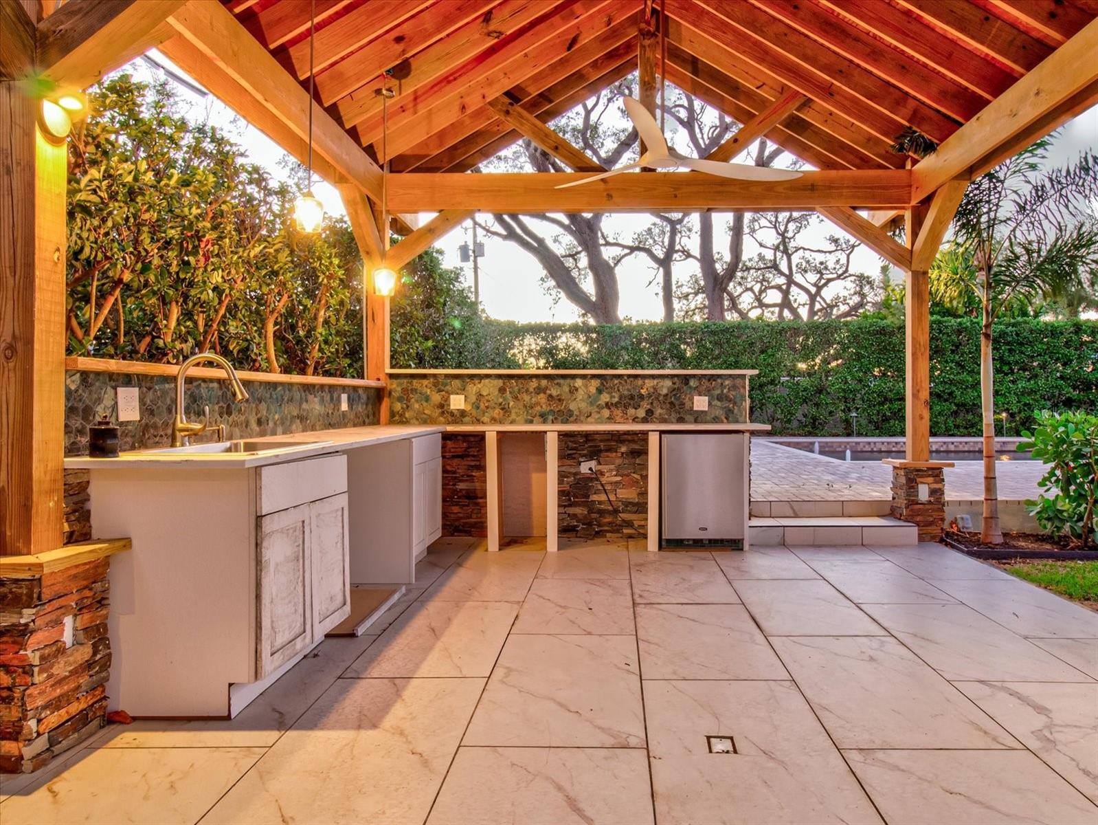 - Courtyard, Garden, Hurricane Shutters, Lighting, Outdoor Grill, Outdoor Kitchen, Rain Gutters, Storage