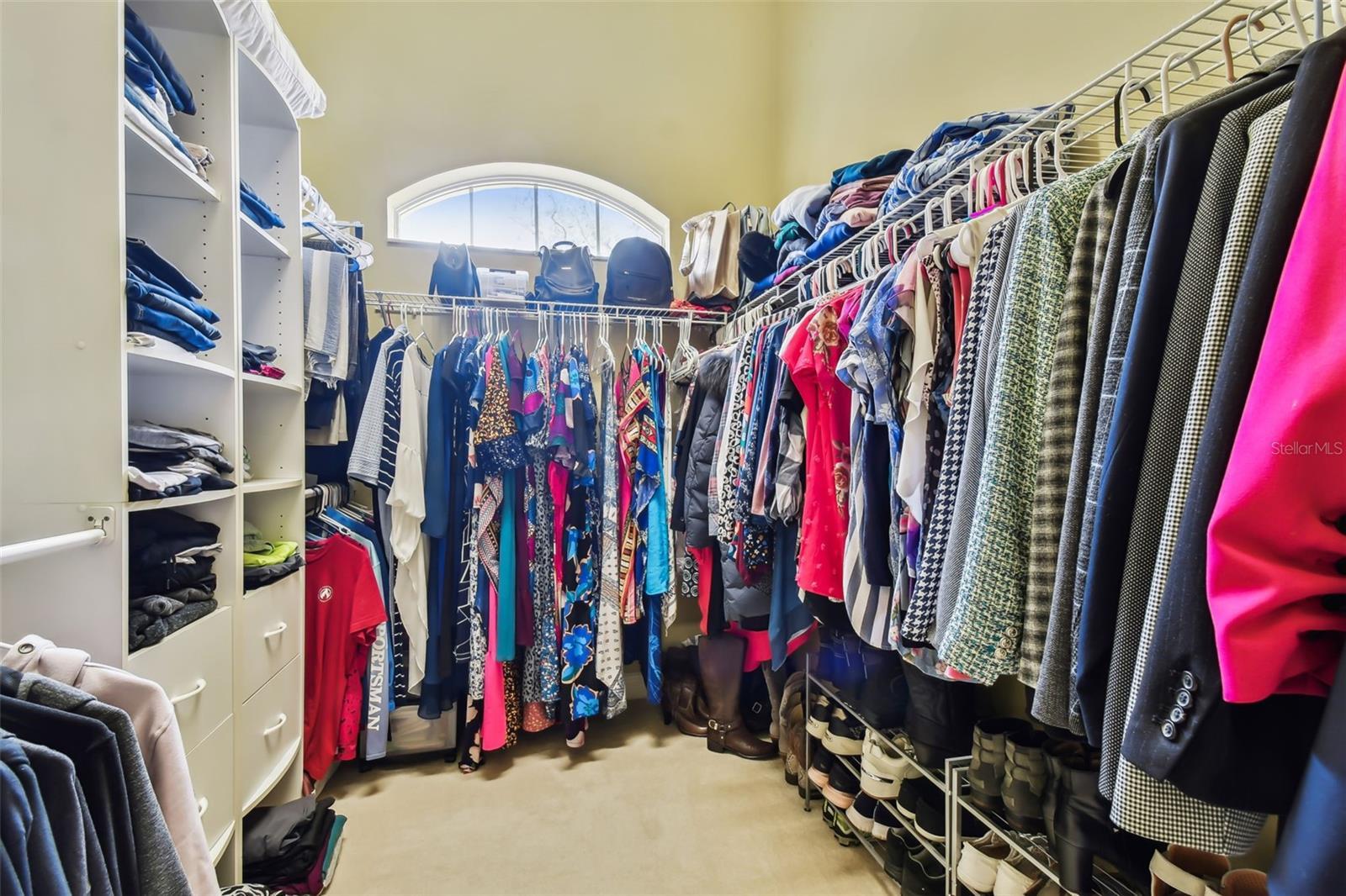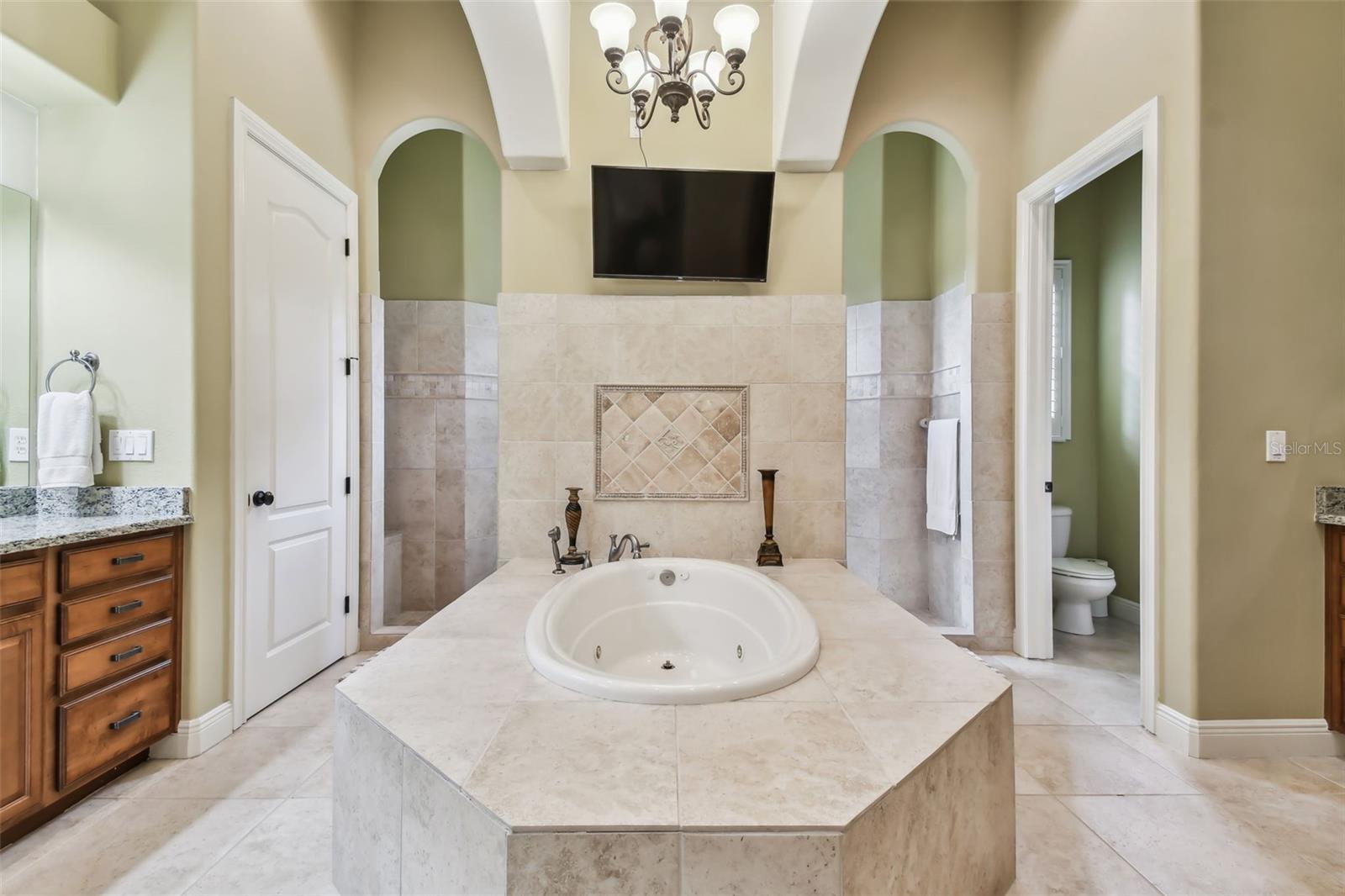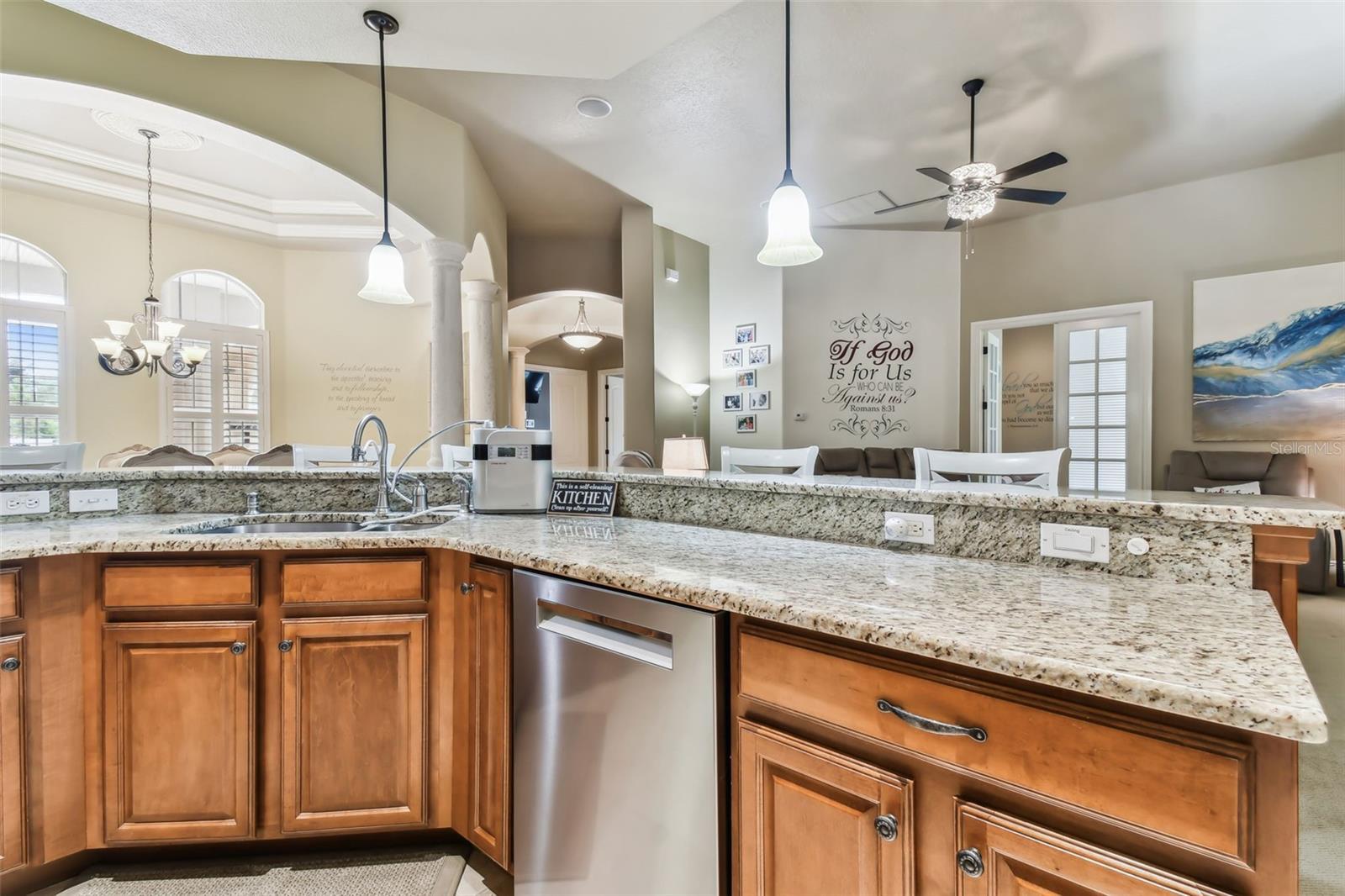 - Built-in Features, Ceiling Fans(s), Crown Molding, Eat-in Kitchen, High Ceilings, Open Floorplan, Primary Bedroom Main Floor, Solid Wood Cabinets, Split Bedroom, Stone Counters, Thermostat, Tray Ceiling(s), Walk-In Closet(s), Window Treatments