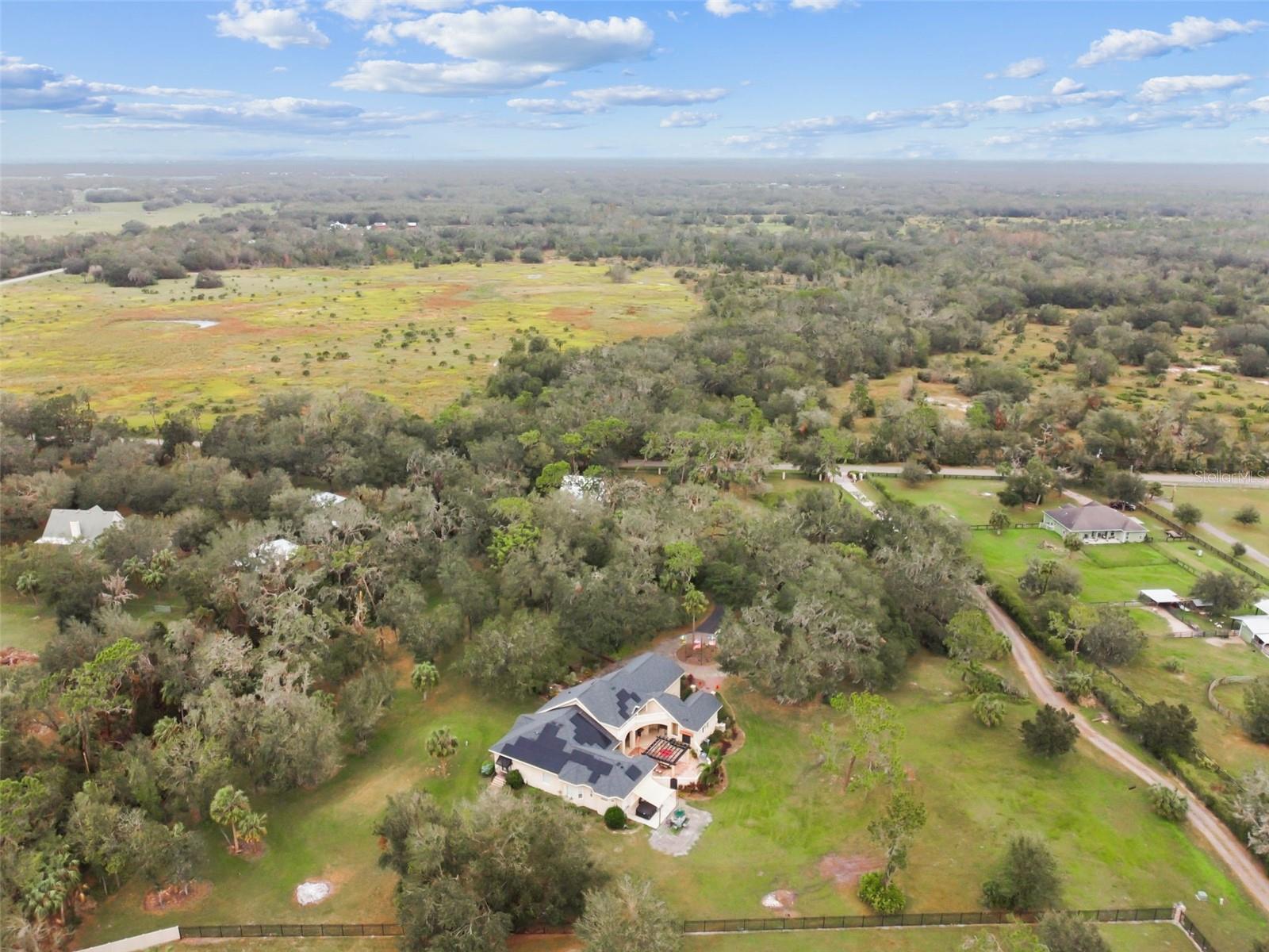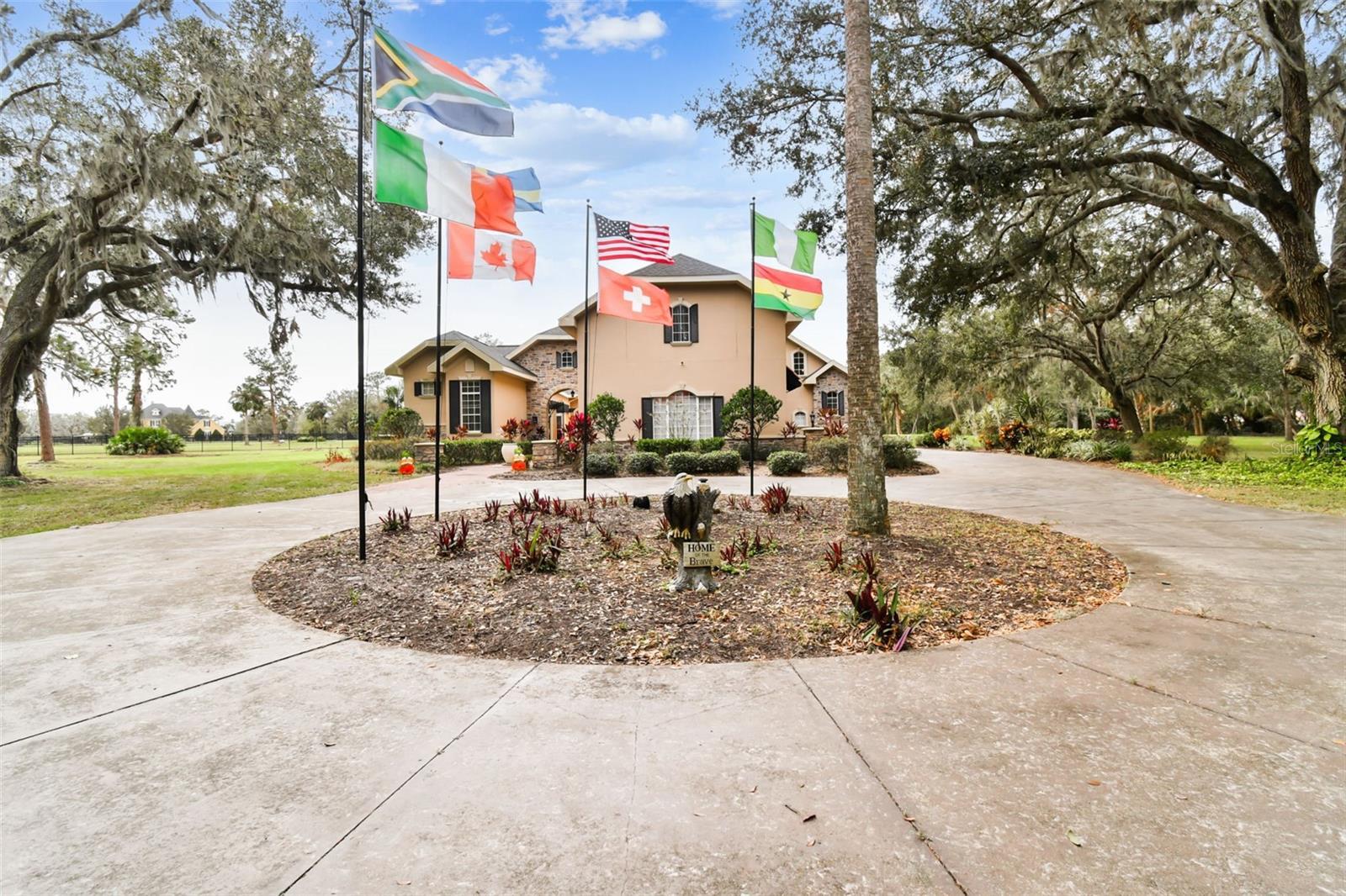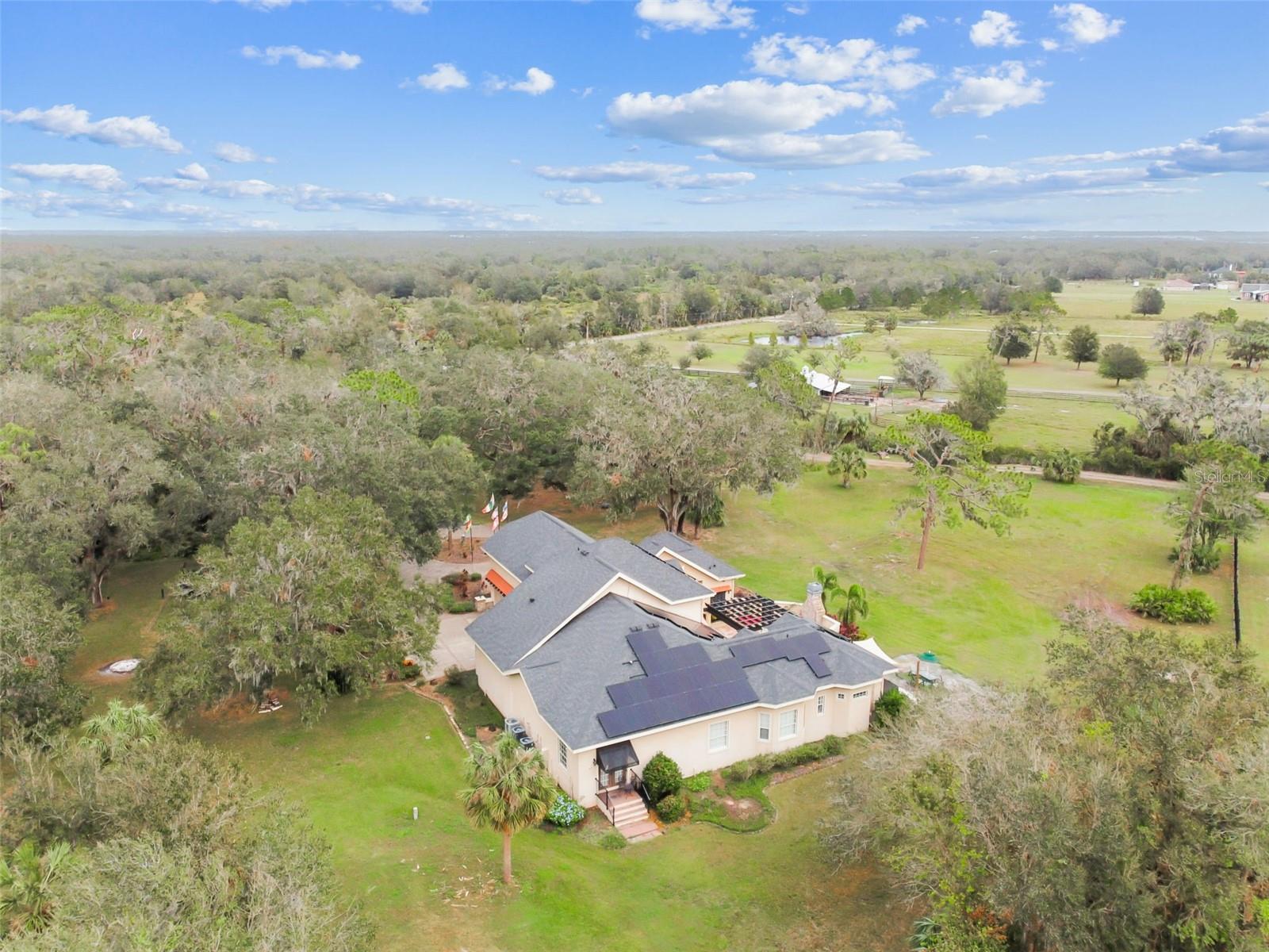 Welcome to your custom-built estate, where elegance, luxury, and attention to detail meet the charm and peace of rural living. Set on over 6 acres and surrounded by majestic 100-year-old oak trees, this Mediterranean inspired paradise offers both privacy and sophistication. Pass through the iron security gate and follow the winding 500-foot paved driveway to reach the home. Step inside through the impressive 10-foot mahogany archway entry, where you’ll be greeted by 12-foot ceilings and beautifully designed and inspired spaces. This expansive residence includes 6 bedrooms and 4 full bathrooms that can come fully furnished if you desired. The attached but separate in-law suite, accessed through the courtyard, provides privacy for guests or multi-generational living. The gourmet kitchen is a chef’s dream featuring: granite countertops, built-in range, oven, and microwave, two sinks, dual islands, a planning desk, 8X10 walk-in pantry, and a wine cellar. The executive master suite is a luxurious retreat with double doors, high ceilings, private sitting area, wet bar, doorless double walk-in shower, jacuzzi tub, dual vanities, and spacious his-and-hers closets. Outside the master suite you will find an office that has been converted to a nursery. Just off the spacious living room, there is an additional bedroom with direct access to the exterior. Upstairs, you’ll find two more bedrooms with a Jack-and-Jill bath, plus an outdoor balcony overlooking the courtyard. The 39-foot theater room, equipped with a 110-inch screen, high-definition projector, wet bar, wine chiller, and refrigerator, is ideal for movie nights and gatherings. The stunning courtyard is the heart of this home, featuring an outdoor kitchen, custom cedar pergola, and wood-burning stone fireplace. The 36x36 two-story barn has enough space for six horse stalls and comes with a finished, carpeted, and air-conditioned upper level. Additional highlights include a hot tub, pickleball court, greenhouse, and endless opportunities for entertaining and relaxing. In addition to being zoned for horses, this property is literally seconds away from the Alafia State Park Equestrian Trail with 20 miles of horse trails and 7,000 acres of state park land. With no HOA, no CDD, newer roof, and solar panels, this property is just as practical as it is stunning. Call today for your private tour.