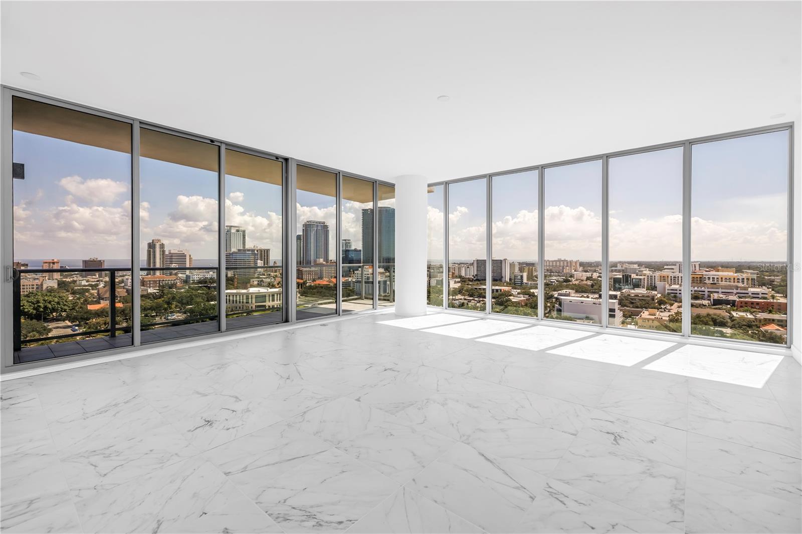 REFLECTION St. Pete introduces the Lapis residence—a stunning 16th-floor premier corner home that captures the essence of elevated downtown living. Spanning nearly 2,300 square feet, this 2-bedroom plus den, 2-bath residence showcases expansive floor-to-ceiling glass and a private terrace with sweeping, protected views of the city skyline, Mirror Lake, and Tampa Bay. With historic properties surrounding the building, the eastern lake views will remain unobstructed for years to come. Inside, the Lapis features 10-foot ceilings, upgraded porcelain tile floors, and a modern kitchen with quartz countertops, panel-ready Bosch appliances, and a Thermador wine fridge built into the kitchen island. A window over the sink frames tranquil lake and skyline views, while the open layout creates a seamless flow between living, dining, and outdoor spaces. The primary suite includes a European-style wet room, upgraded fixtures, and both reach-in and walk-in closets. The second bedroom is generously sized, and the den provides flexible space for a home office or guest room. Two assigned parking spaces are included. Residents enjoy exclusive access to a 12,000-sq-ft rooftop oasis with a heated saltwater pool and spa, glass-walled fitness center, social club, fire pit lounge, and outdoor kitchen—all set against panoramic city and bay views. Designed for both luxury and longevity, REFLECTION features REME Halo air filtration, a water softening system, and touchless entry. Its resilience through recent hurricanes showcases the building’s superior construction and lasting quality. Developer incentives available - Make your appointment today!