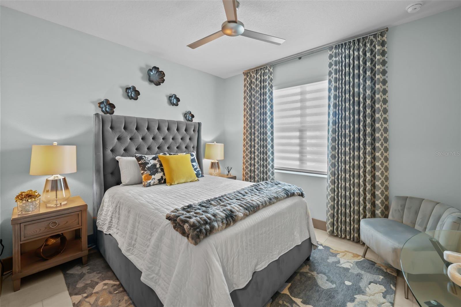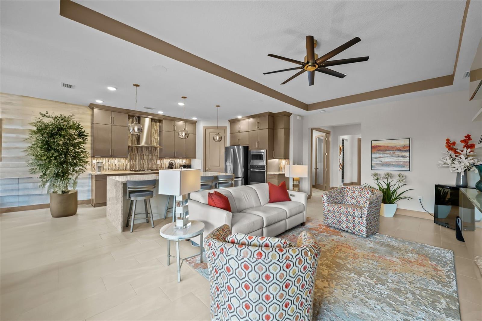 - Built-in Features, Ceiling Fans(s), High Ceilings, Kitchen/Family Room Combo, Open Floorplan, Pest Guard System, Primary Bedroom Main Floor, Split Bedroom, Stone Counters, Thermostat, Tray Ceiling(s), Walk-In Closet(s)