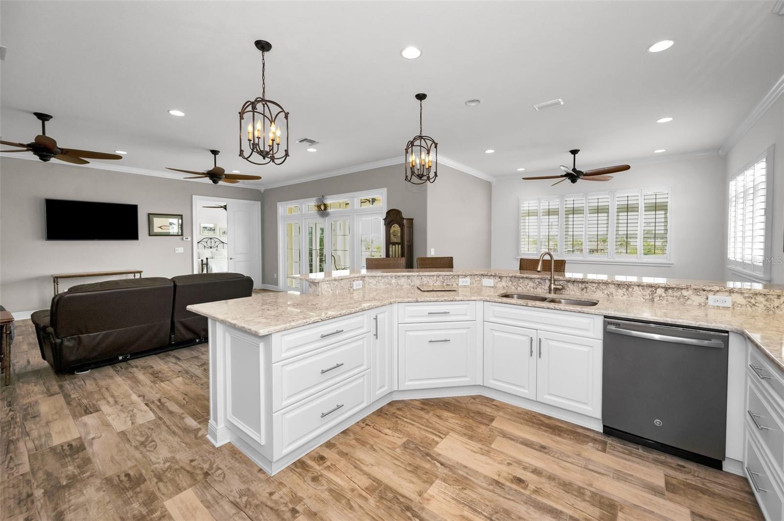 - Ceiling Fans(s), Crown Molding, Dry Bar, Eat-in Kitchen, Elevator, High Ceilings, Kitchen/Family Room Combo, Open Floorplan, Primary Bedroom Main Floor, Solid Surface Counters, Split Bedroom, Stone Counters, Thermostat, Walk-In Closet(s), Window Treatments