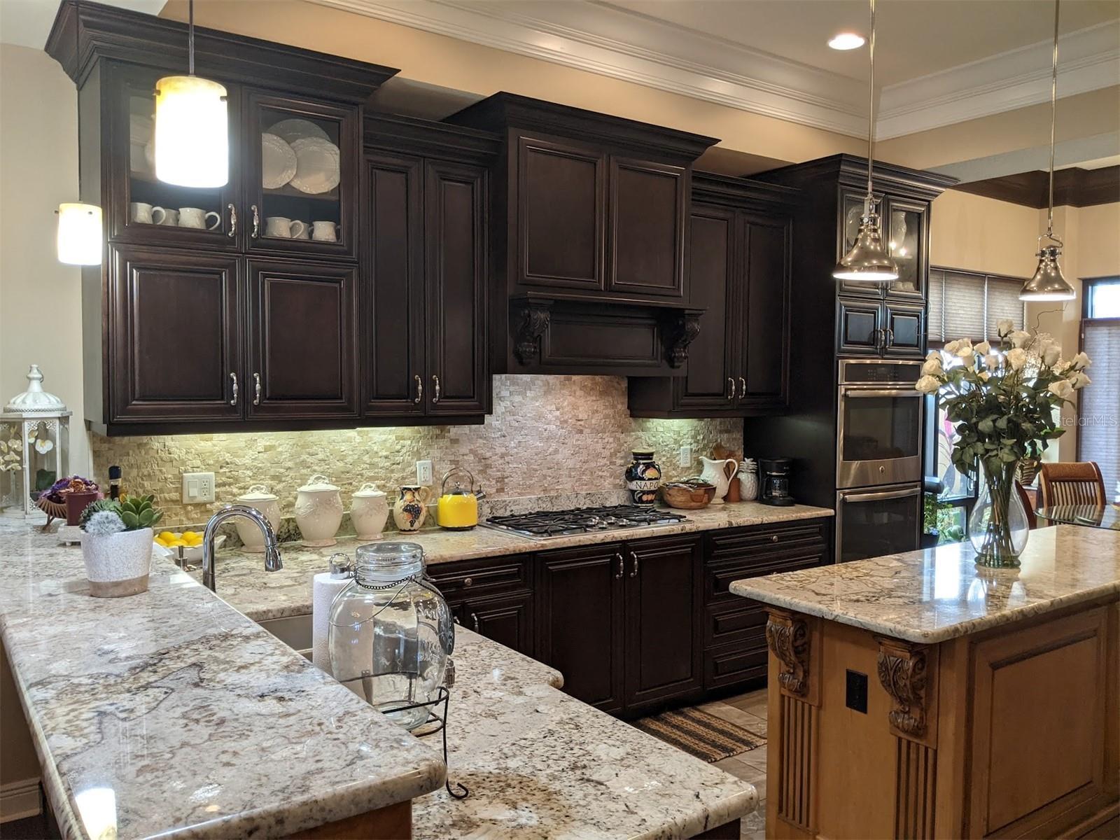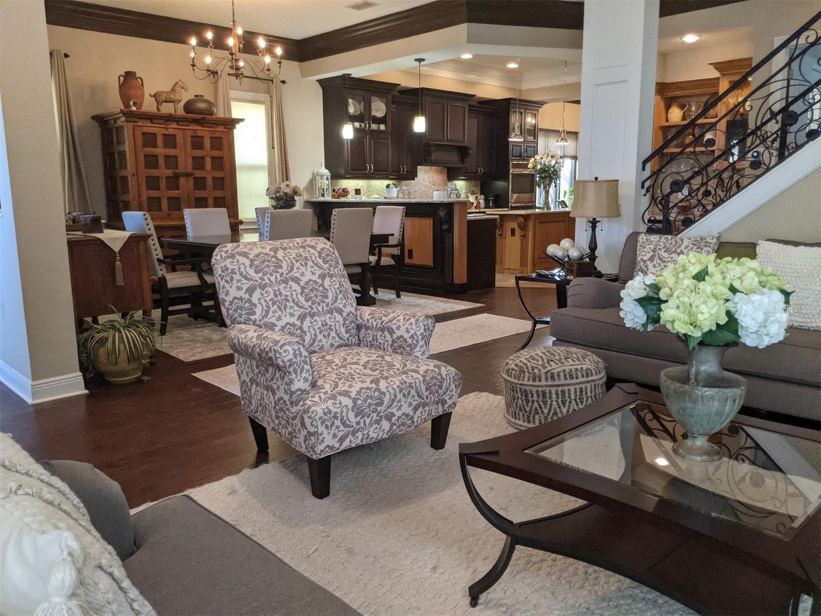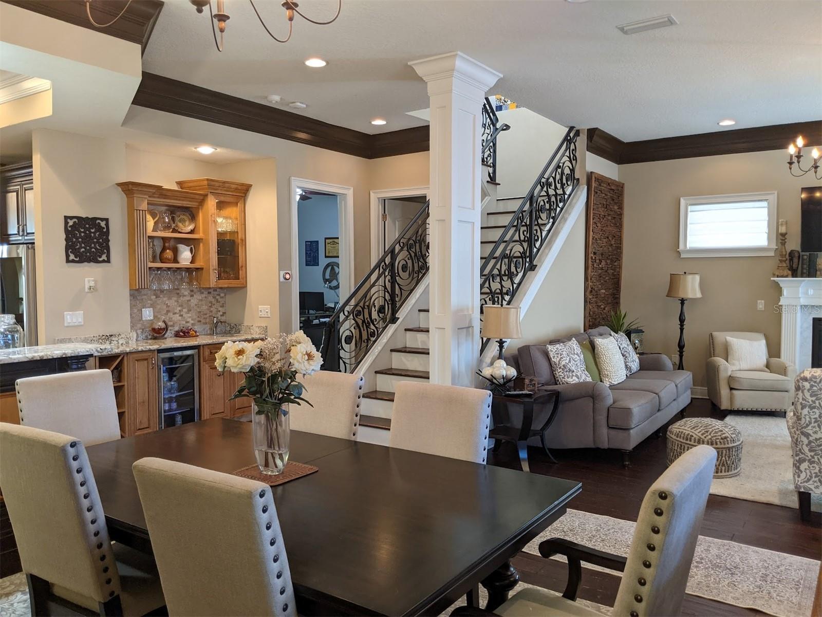 - Ceiling Fans(s), Crown Molding, Eat-in Kitchen, Kitchen/Family Room Combo, Living Room/Dining Room Combo, Open Floorplan, PrimaryBedroom Upstairs, Solid Surface Counters, Solid Wood Cabinets, Stone Counters, Thermostat, Walk-In Closet(s), Wet Bar