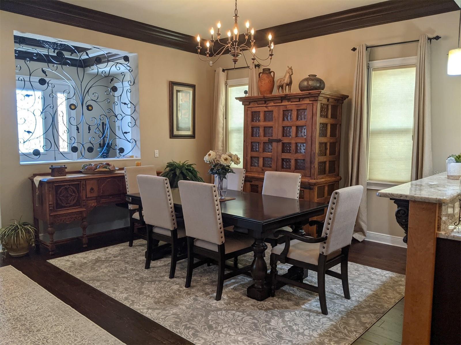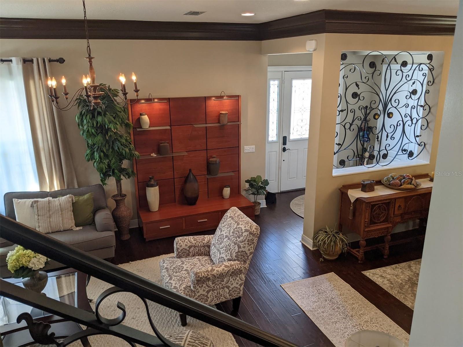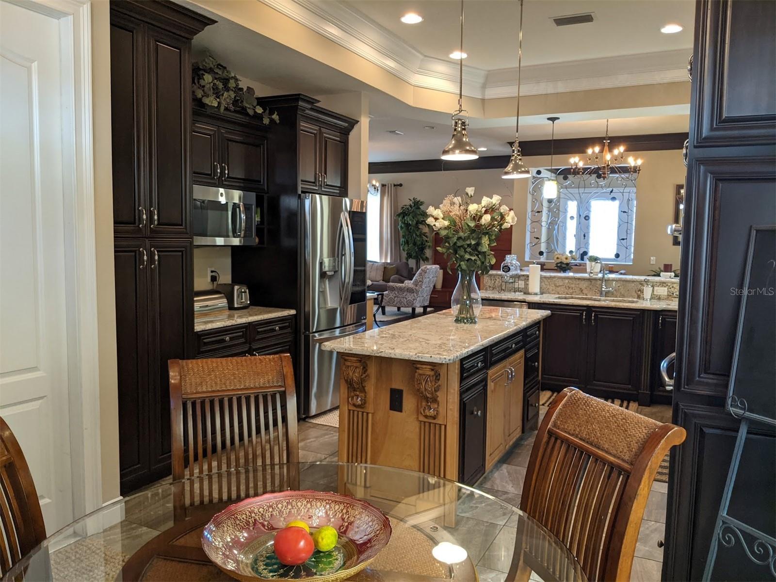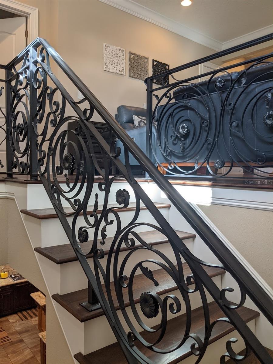 - Ceiling Fans(s), Crown Molding, Eat-in Kitchen, Kitchen/Family Room Combo, Living Room/Dining Room Combo, Open Floorplan, PrimaryBedroom Upstairs, Solid Surface Counters, Solid Wood Cabinets, Stone Counters, Thermostat, Walk-In Closet(s), Wet Bar