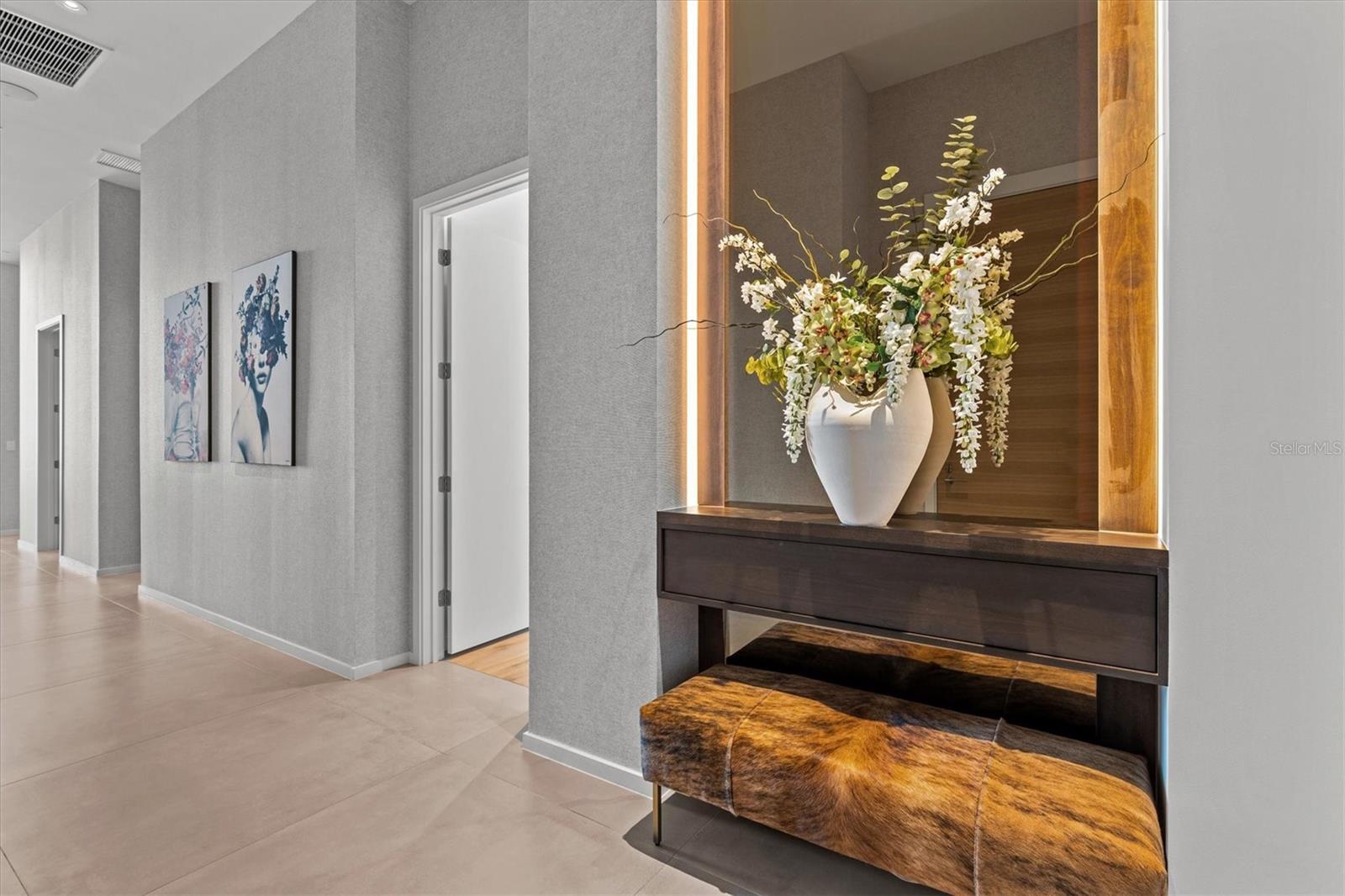 One or more photo(s) has been virtually staged. Recent independent appraisal (Aug 2025) supports $4.8M value. Sky Penthouse 703 at Serena by the Sea delivers rare 16’+ ceilings, floor-to-ceiling glass, and unobstructed Gulf-to-Intracoastal panoramas. Retractable sliders open to colossal west facing terrace with no adjacent balconies for true privacy. 3 ensuite bedrooms + office + theater room. Italian kitchen with waterfall stone and full Gaggenau suite appliances. Whole-home automation wiring, integrated audio, and electric blackout shades. Spa-style primary bath with soaking tub; large laundry; climate-controlled storage; three parking spaces next to the private elevator lobby. 23,000± SQFT resident-only amenities: zero-edge heated saltwater pool with cabanas, outdoor kitchen & sunset fire pit; modern fitness center; European-style spa with sauna, cold-plunge bucket, massage suites, jacuzzi & relaxation lounge. Exclusive access to concierge wellness services via a preferred provider. Marina in progress with priority slip rights for PH703. Furniture and electronics do not convey.
