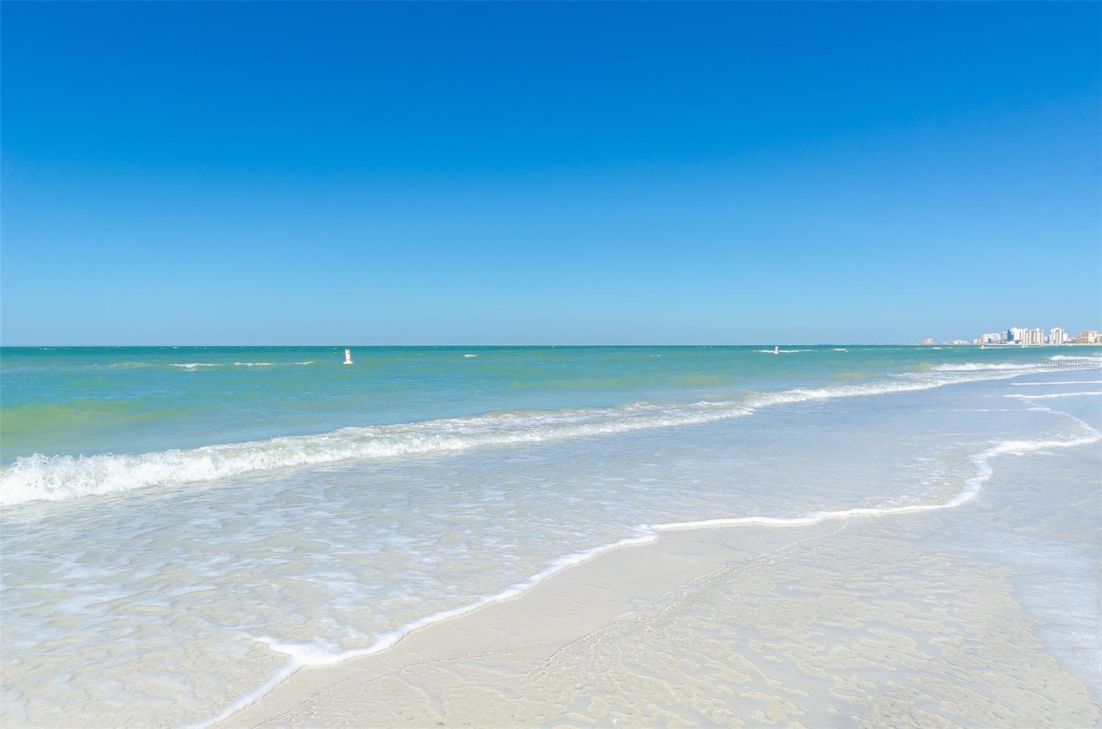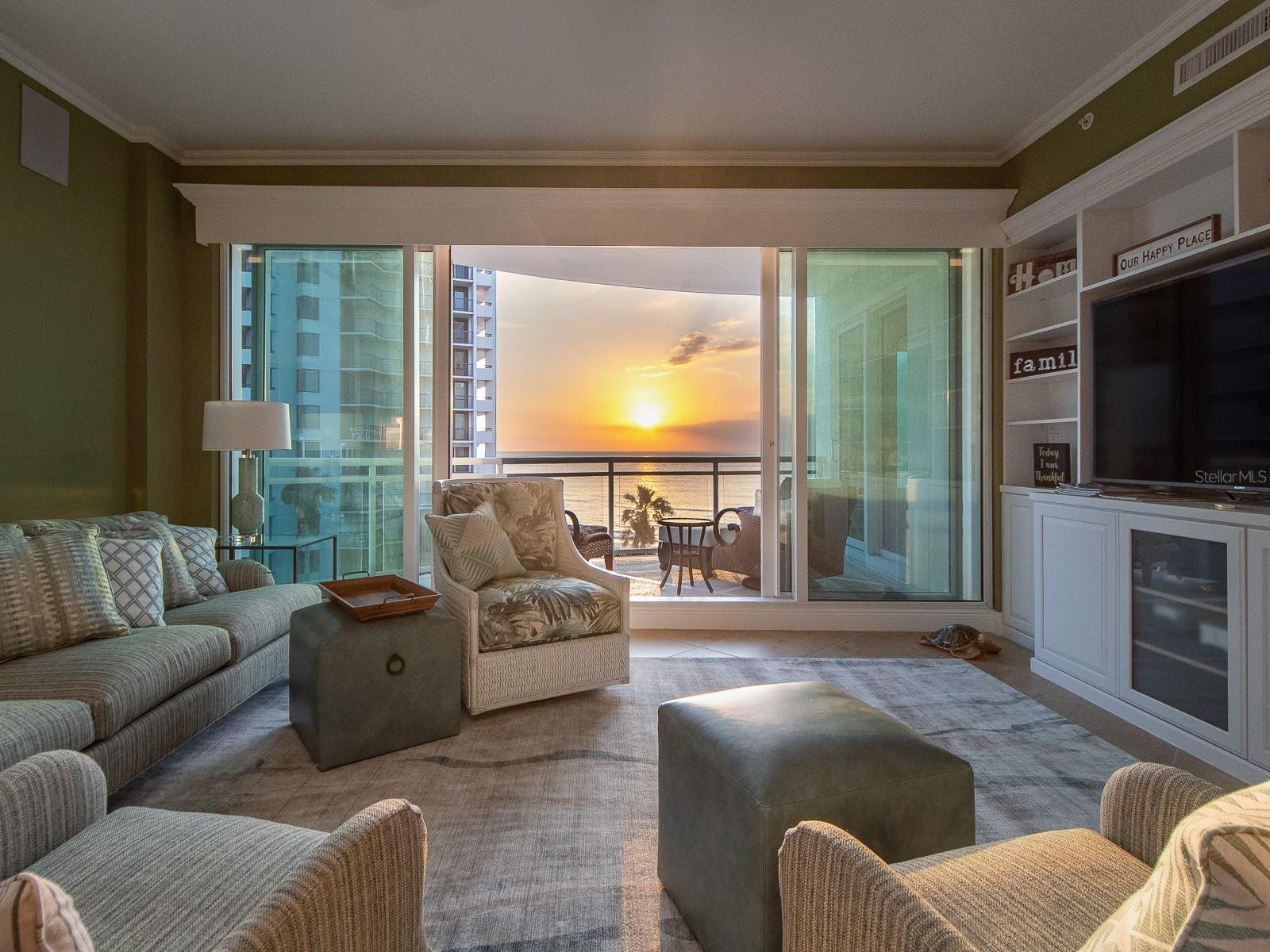 Sunsational splendor at Finale! First public offering in more than 3 years in this newer (2014) luxury Sand Key condominium consisting of 23 units. Truly Turnkey – start living the Florida Dream! Semi-private elevator entry into private foyer, then enter your oasis by the Sea! You’ll love the contemporary floor plan of this fifth floor residence! Eighteen-inch continuous Porcelain tile flooring, custom built-in media wall, surround sound, designer décor throughout and water views from every room beckon you to seaside living. Enjoy the beach, dolphins, boats, amazing sunsets and more from the curved balcony with aquamarine glass balustrades. Also view the Gulf from Kitchen, Dining, and Primary bedroom; with views of the Intracoastal from Living room, Kitchen, Dining, and 2nd/3rd bedrooms! Chef equipped kitchen includes a full suite of Samsung stainless appliances, including a Smart fridge, cherry cabinetry with granite counter tops, a breakfast bar, and amazing views of the Intracoastal (occasionally manatees!) from the custom built-in window seat (with storage). Generous Primary bedroom suite with Gulf views, balcony access, walk-in closet; an oversized 2nd closet with custom shelving provides ample storage. The ensuite bath is your private spa – soaking tub, glass shower enclosure, dual sinks and vanity area, plus plenty of storage for linens. Second and third bedrooms feature eye-catching views of the Intracoastal and all beds provide additional drawer storage underneath. Across from the guest powder room in the main hall is the laundry room, equipped with full-size Samsung appliances and an exit door into the semi-private stairwell/trash chute and mechanical room area. Brand new AC installed June 2025 - 3.5 ton American Standard. Amenities include well-equipped fitness room, heated swimming pool and spa, private beach access, secure building entry, secure garage entry, one assigned garage parking space, assigned climate-controlled storage ground level, and property manager onsite daily. Pets permitted and 90-day rental minimum. The building and grounds of Finale at Sand Key are impeccably maintained and managed. This prime location is just minutes from the hub of world-famous Clearwater Beach, 45 minute drive to TIA, 30 minute drive to St. Pete-Clearwater Intl, and convenient to all restaurants, retail establishments and medical facilities of nearby Clearwater and Belleair Bluffs. Your Gulf front Sanctuary is waiting!