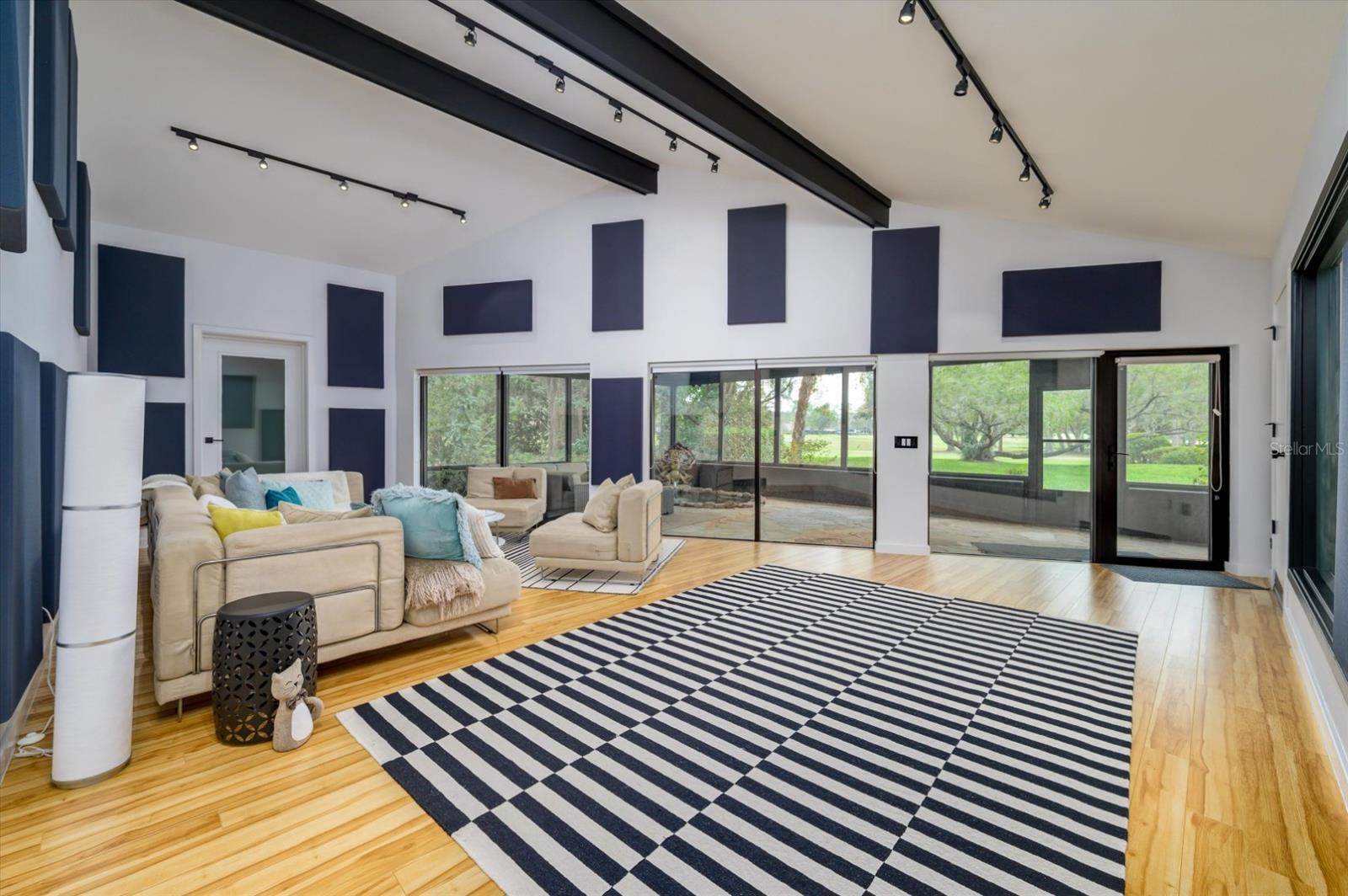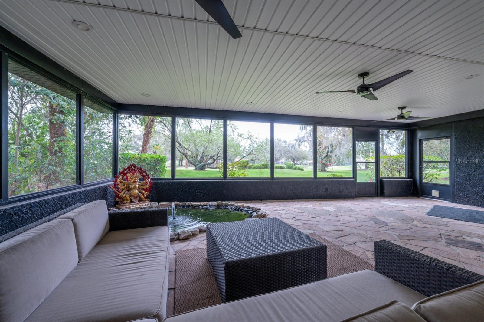 One-of-a-kind, private golf course retreat where modern elegance meets unparalleled privacy in the renowned Saddlebrook community. This fully remodeled 3 (could be 4) bedroom sanctuary is set on an expansive, wooded lot, offering stunning golf course and lake views. With 2,324 square feet of living space, this home feels even more spacious thanks to thoughtful design and abundant natural light. Originally designed as a professional recording studio, this home boasts state-of-the-art sound insulation, making it the perfect retreat for privacy and tranquility. The former control room offers incredible versatility - as a home office, game room, or an additional bedroom. Exceptionally well-insulated walls soundproof doors, and custom thresholds ensure peace and quiet throughout. The high-ceiling former live room is a showstopper, featuring double-paned, hurricane-rated, 6' windows that flood the space with natural light. Step outside to the covered, screened patio, where you'll find a serene in-ground pond and fountain, a perfect backdrop for stunning sunset views. The spacious primary suite is a retreat in itself, complete with a walk-in closet, private en suite bathroom, and exceptional soundproofing for added tranquility. With its original design as an additional live and control room, this space offers the ultimate privacy and comfort. Two additional generously sized bedrooms share a full bathroom. One comfortably fits its king bed, while the other is perfect with two twin beds. Designed with charm and functionality in mind, the European-style eat-in kitchen is a dream. An elegant inset fireplace near the oversized dining table creates a cozy atmosphere. Every detail is crafted for both beauty and practicality. This turnkey home comes fully furnished with designer-brand furniture, vintage rugs, fine linens, and complete kitchenware. As an added bonus, a low-mileage 2009 Lincoln Navigator is included, making this an effortless move-in experience. Saddlebrook is a prestigious gated community offering 24-hour security and world-class amenities, including: 27 holes of championship golf, tiki bar, outdoor café, sports bar, and a restaurant. Optional membership affords unlimited golf & amenities that include over 40 multi-surface tennis courts, resort-style pools (3), fitness center, volleyball, basketball, pickleball courts, and discounts at the pro shops and restaurants. Enjoy low HOA fees of only $312 per quarter, making this luxury lifestyle even more accessible. Situated just minutes from top-rated schools, premier shopping, and dining. Nearby highlights include: The Grove, Wiregrass Mall, Tampa Premium Outlets, AdventHealth Wesley Chapel, BayCare Wesley Chapel, and is only a 35-minute drive to Tampa International Airport This is a rare opportunity to own a luxury golf course home in one of Florida's most sought-after communities. Schedule your private showing today! The instruments and recording equipment shown in photos or present in the home DO NOT convey with the purchase.