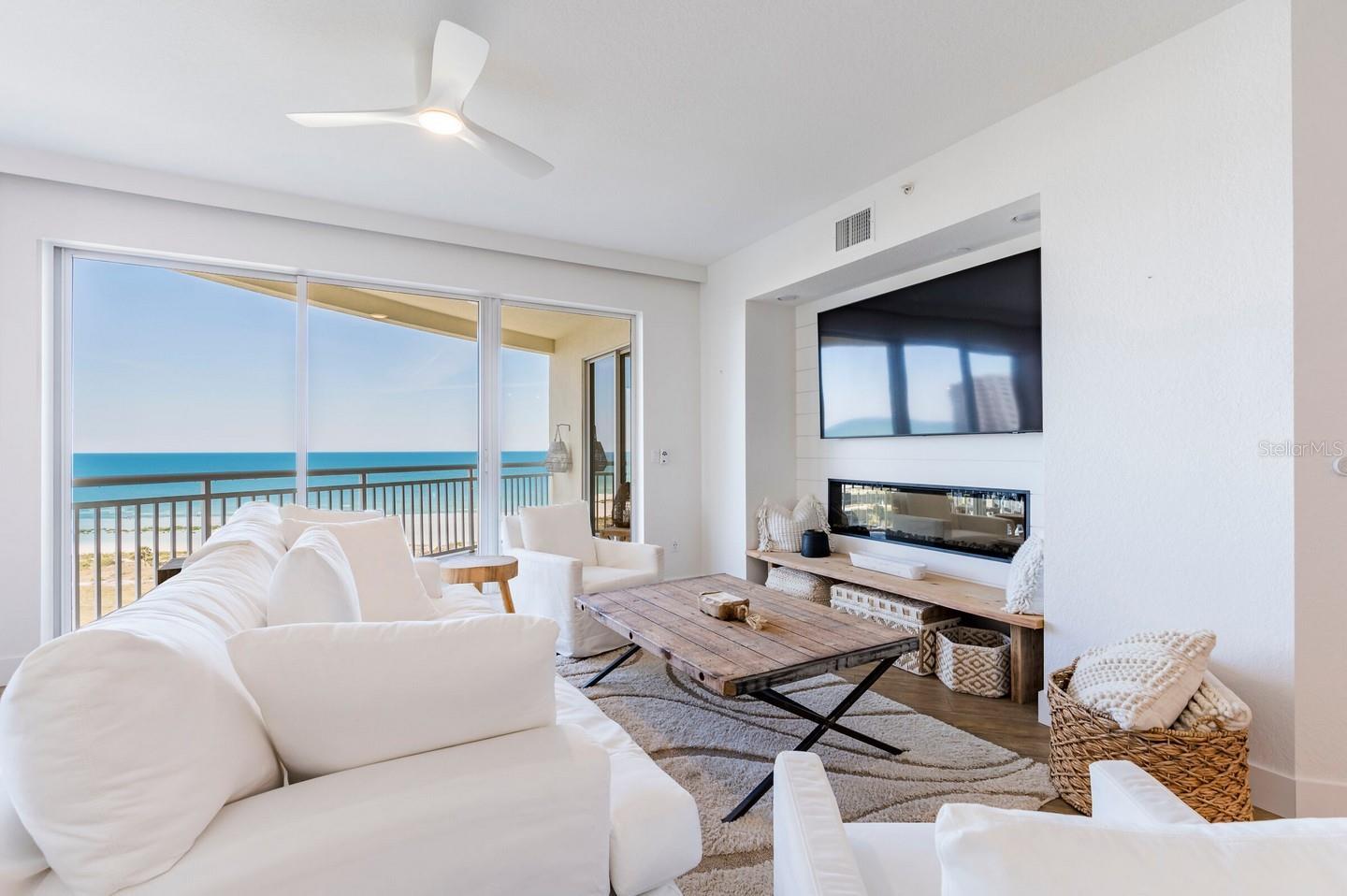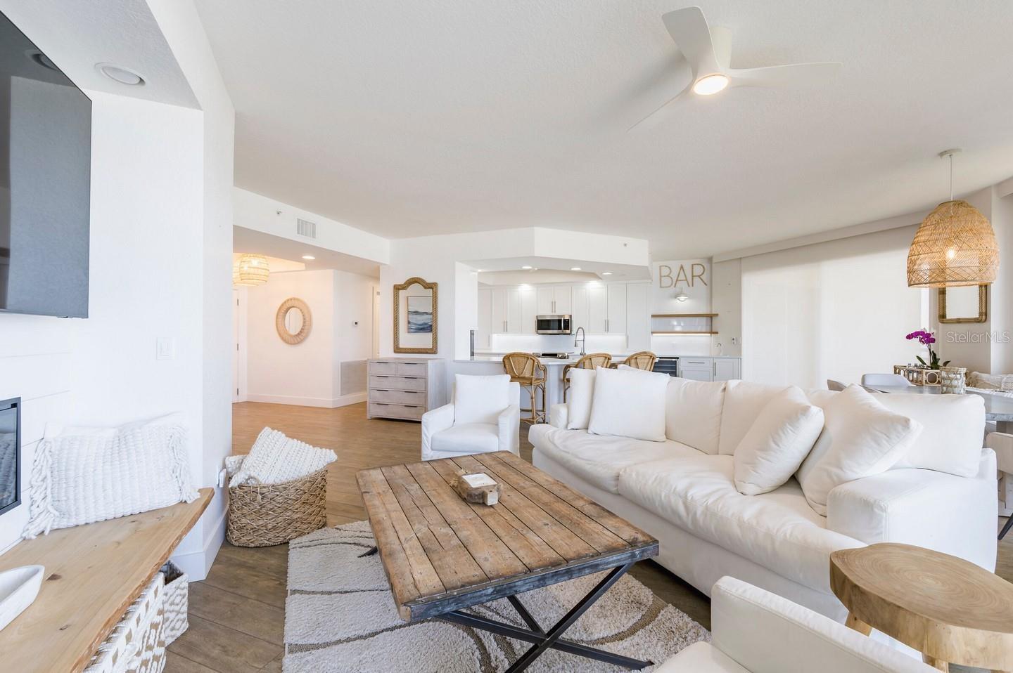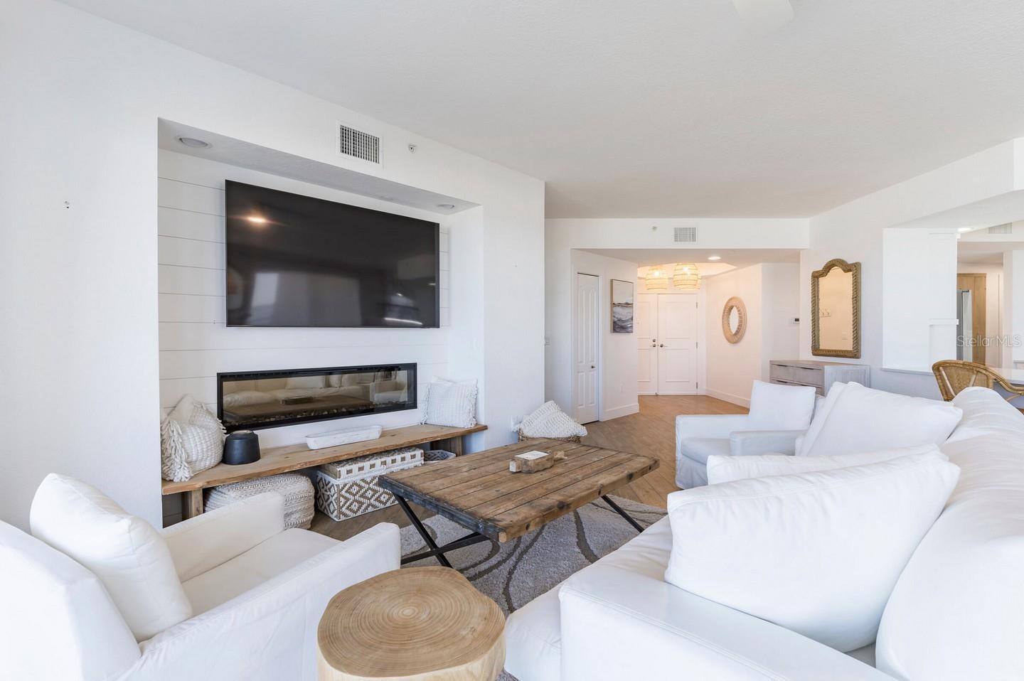 Fully remodeled, this stunning luxury residence features soaring 10-FT CEILINGS, luxury plank flooring, and FLOOR-TO-CEILING WINDOWS with remote black-out shades. The open-concept kitchen is a chef’s dream with CUSTOM CABINETRY, quartz counters, a PENINSULA CONVERSATION BAR, a drink station, and all new stainless appliances. The spacious PRIMARY SUITE boasts a CUSTOM WALK-IN CLOSET, a garden tub, a separate shower, and a double-sink cypress-top vanity. The GUEST SUITE is equally impressive with a built-out closet. The laundry room includes CUSTOM CABINETS, a quartz counter, and a tile backsplash. Additional upgrades include a BUILT-IN SAFE in the primary bedroom, outside wiring for an ELECTRIC BBQ GRILL on the balcony, electric fireplace wiring in the living room, new bathroom cabinets, added upper kitchen cabinets, and a new water heater. The building features a SOFT WATER SYSTEM and a newer AC (2019) with a WATER LEAK DETECTION SYSTEM. Enjoy RESORT-STYLE AMENITIES including a HEATED POOL & SPA, shade cabanas, grilling areas, a two-story social room, library, billiards, a FITNESS CENTER WITH SAUNA & STEAM ROOM, tennis courts, and more. Additional perks include STORAGE SPACE, manicured tropical grounds, a FULL-TIME CONCIERGE, an on-site manager, and 24-HOUR SECURITY with a manned entrance gate. Luxury living at its finest!