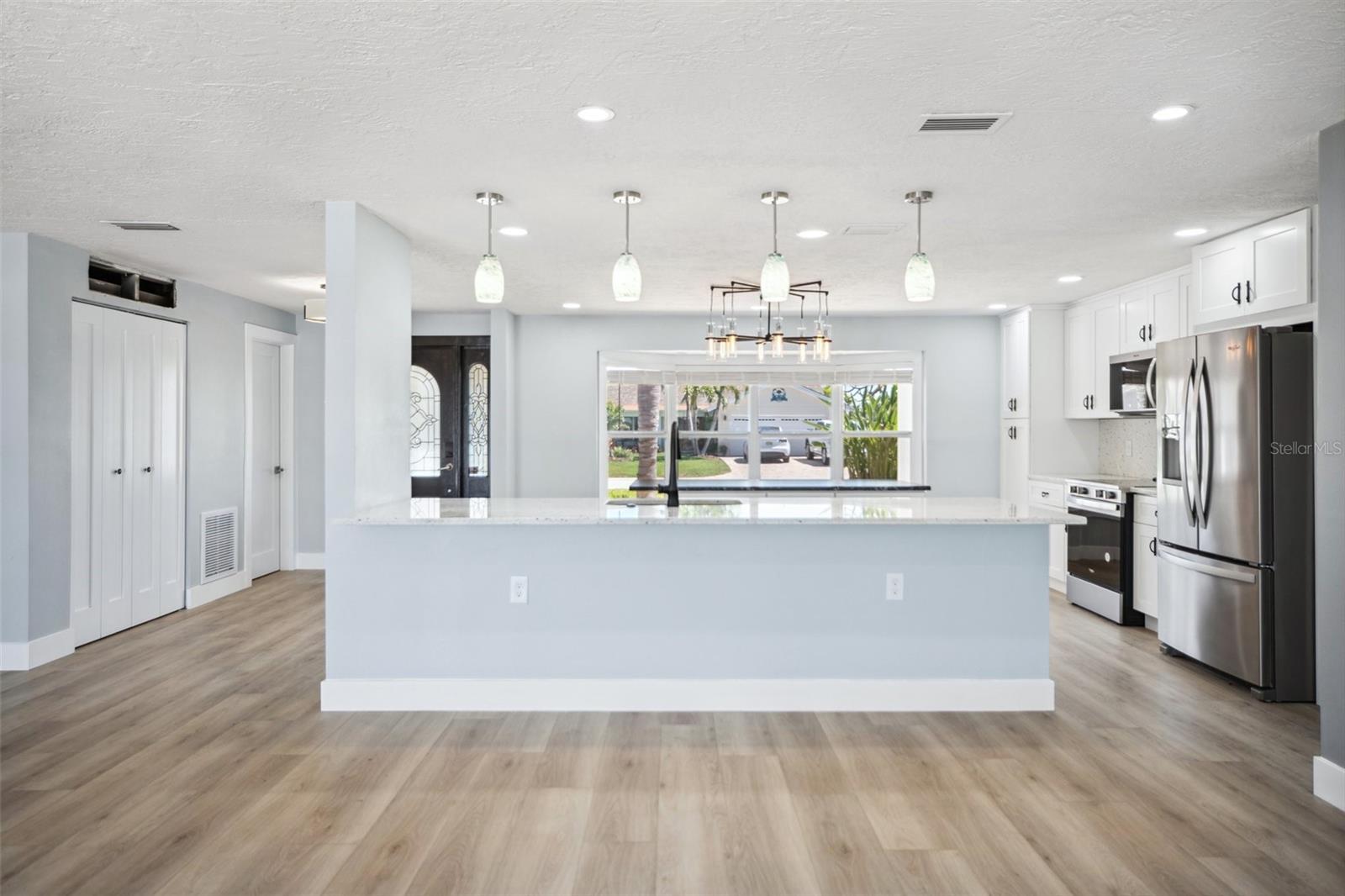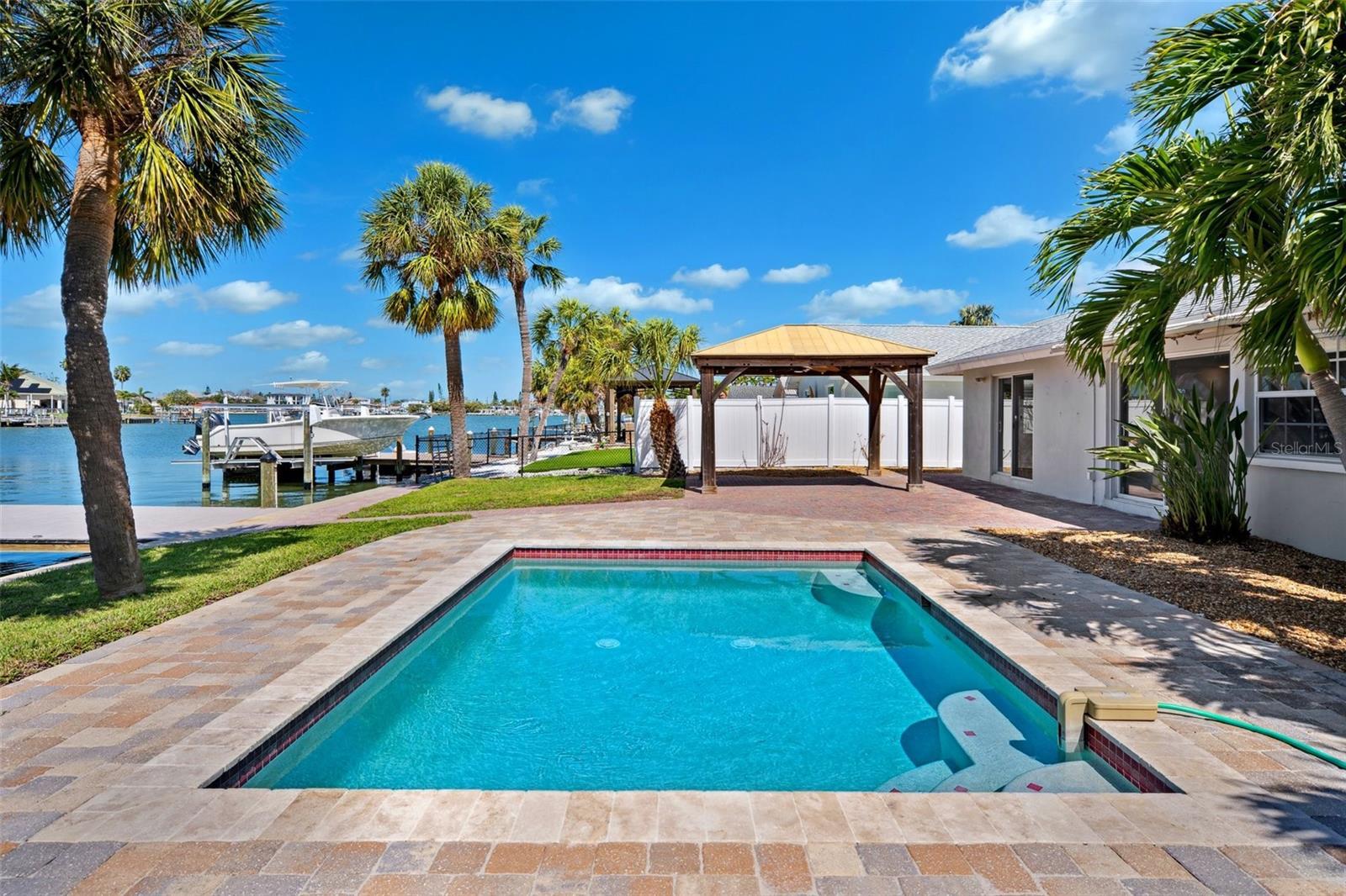 Completely remodeled and redesigned waterfront beach home in the highly sought after Third Palm Point neighborhood on beautiful St Pete Beach This meticulously remodeled single level, easy living Florida beach home captivates one with water views from the moment you enter and offers a harmonious blend of luxury and functionality with its open great room design and split-bedroom floor plan! At the heart of the home lies a stunning brand new kitchen, crafted for the culinary enthusiast and entertaining in mind, the kitchen features gleaming granite countertops, sleek stainless steel appliances, and timeless coastal white solid wood white shaker cabinetry. Two expansive islands with breakfast bars create a seamless flow into the spacious great room creating an ideal space for flexibility. The outdoor area is your private escape, designed to capture the essence of Florida's iconic sunsets. Enjoy the waterfront pool, paver patio, a charming cabana area, and enclosed with white vinyl fencing for added privacy. Boating enthusiasts will appreciate the large composite dock outfitted with a 10,000 lb boat lift, providing easy access to Boca Ciega Bay and the intracoastal waterway. Additional highlights include a two car garage with epoxied garage floor with additional parking for three cars in the extended driveway. Modern updates such as all-new luxury vinyl flooring, an all new A/C system, hurricane-resistant windows, and a tankless water heater ensure comfort and efficiency. This fabulous waterfront retreat is your chance to embrace luxury living in a coastal paradise. St Pete Beach offers boutique shopping, gourmet restaurants and is conveniently located with no draw bridges to the easy interstate access and within 12 minutes of Downtown St Petersburg, 40 minutes of Tampa International airport. It's time to live on vacation year round!