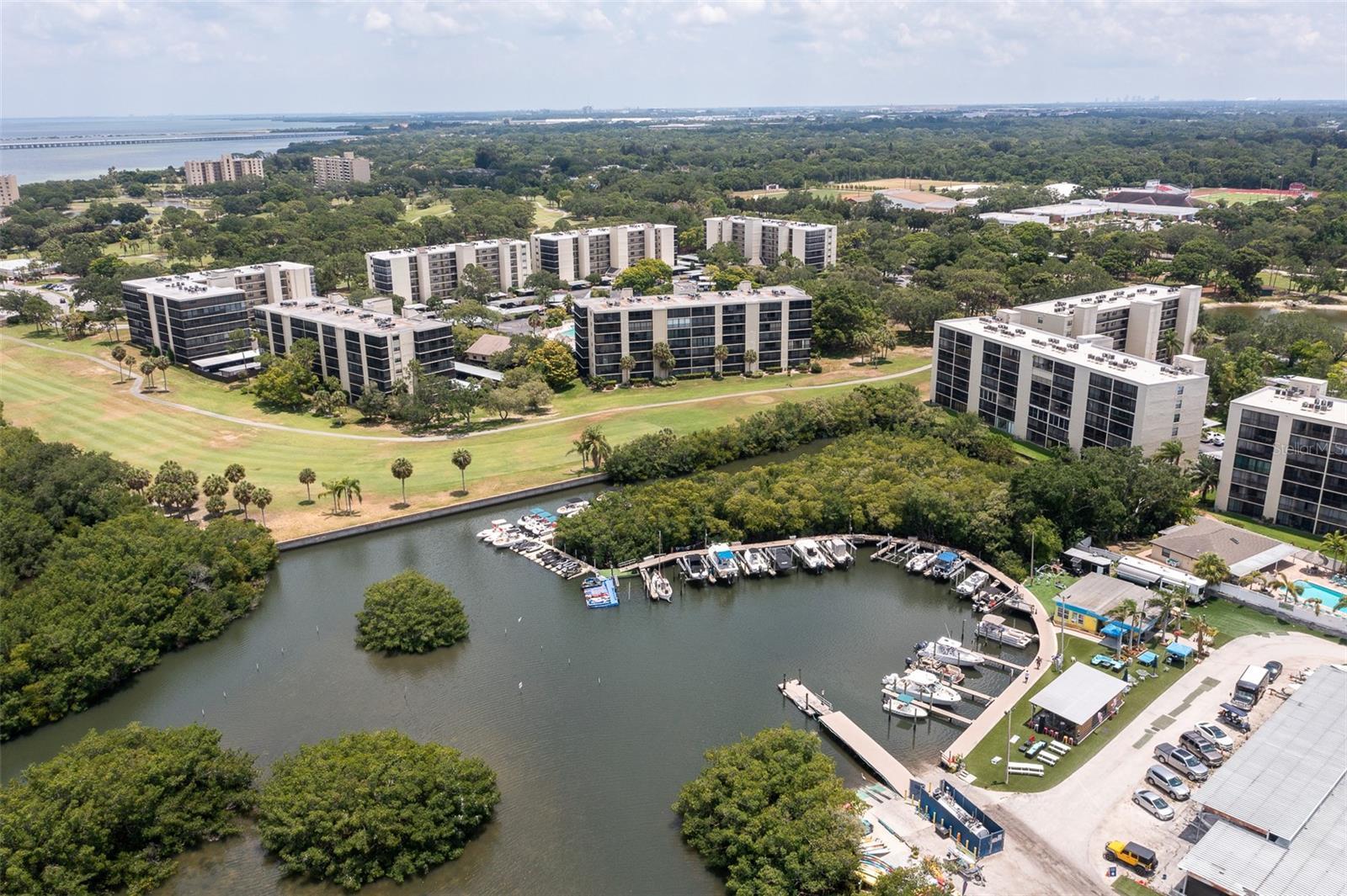 2 bedroom, 2 bath 4th floor condo in building 2800 at Cove Cay Village IV. Laminate floors throughout for ease of cleaning. Kitchen has an extended counter that serves as a bar or extra serving space. This includes extra cabinet space. Screen balcony is protected from the sun by shade trees and provides access to the private laundry. The 3rd hole of the golf course is right across the street. One bath has tub and the other has a shower. The building has 2 elevators and one covered parking spot. Cove Cay is a gated golf course community with 24 hour security. Restaurant/pub and marina on site but are separate business entities. Each of the four communities has it's own clubhouse with heated pool and hot tubs.