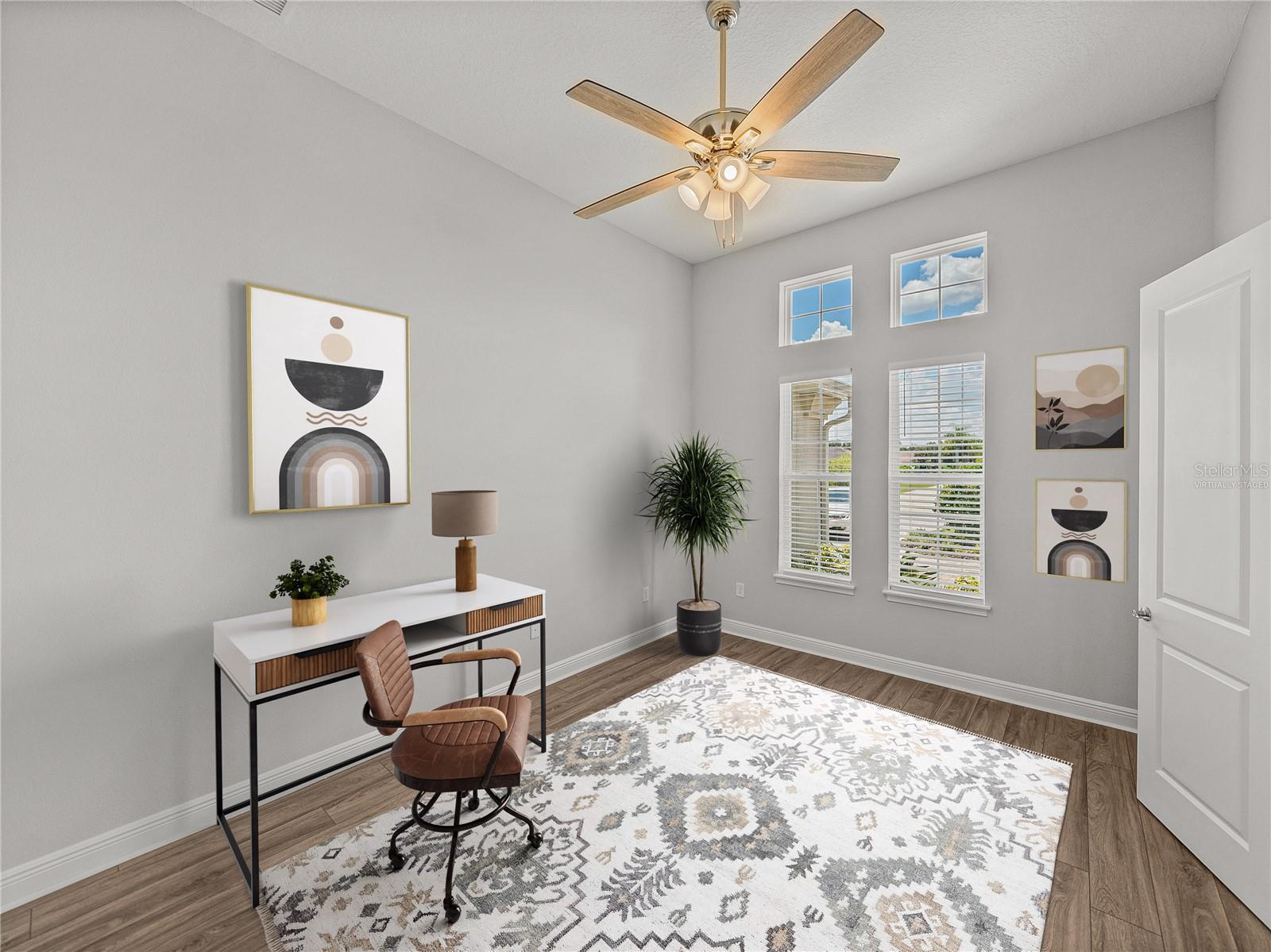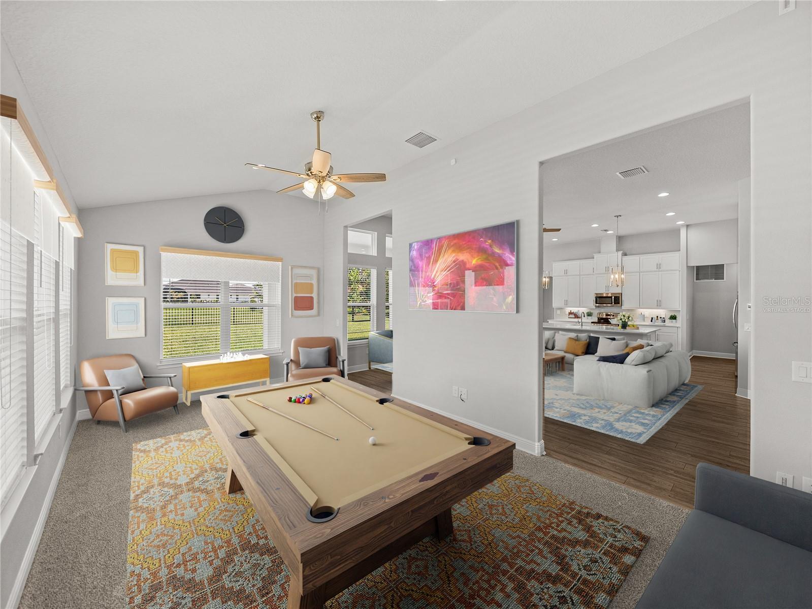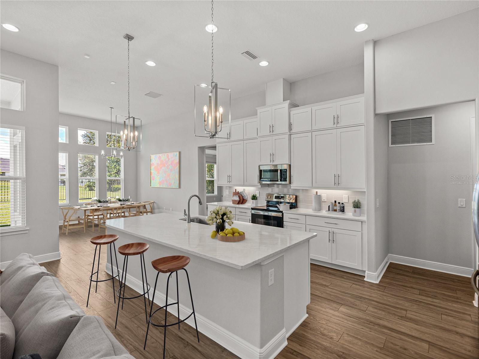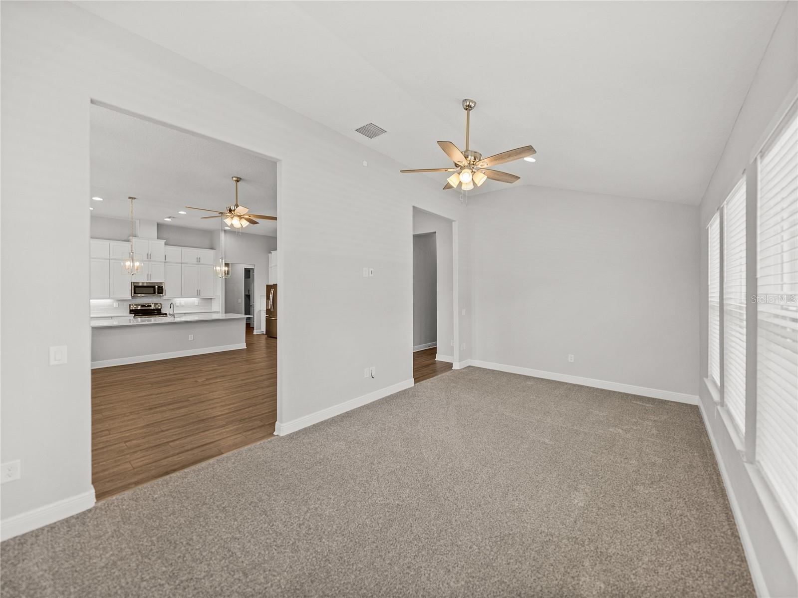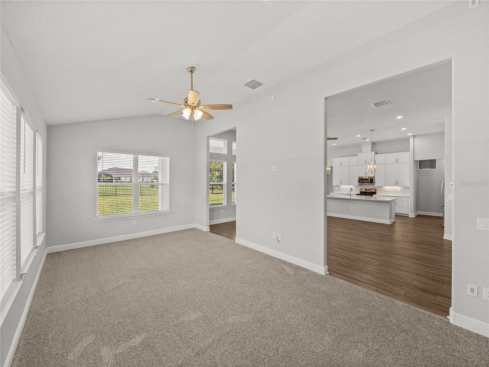 - Ceiling Fans(s), Crown Molding, Eat-in Kitchen, High Ceilings, Kitchen/Family Room Combo, Open Floorplan, Primary Bedroom Main Floor, Solid Wood Cabinets, Split Bedroom, Stone Counters, Vaulted Ceiling(s), Walk-In Closet(s)