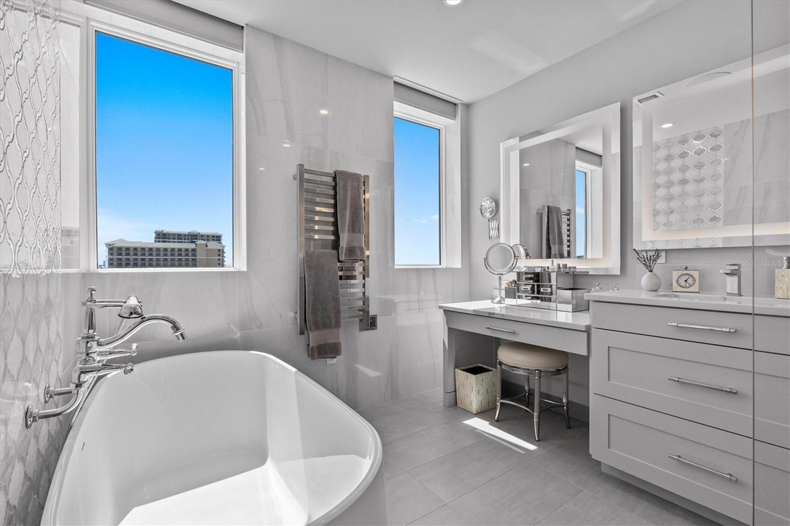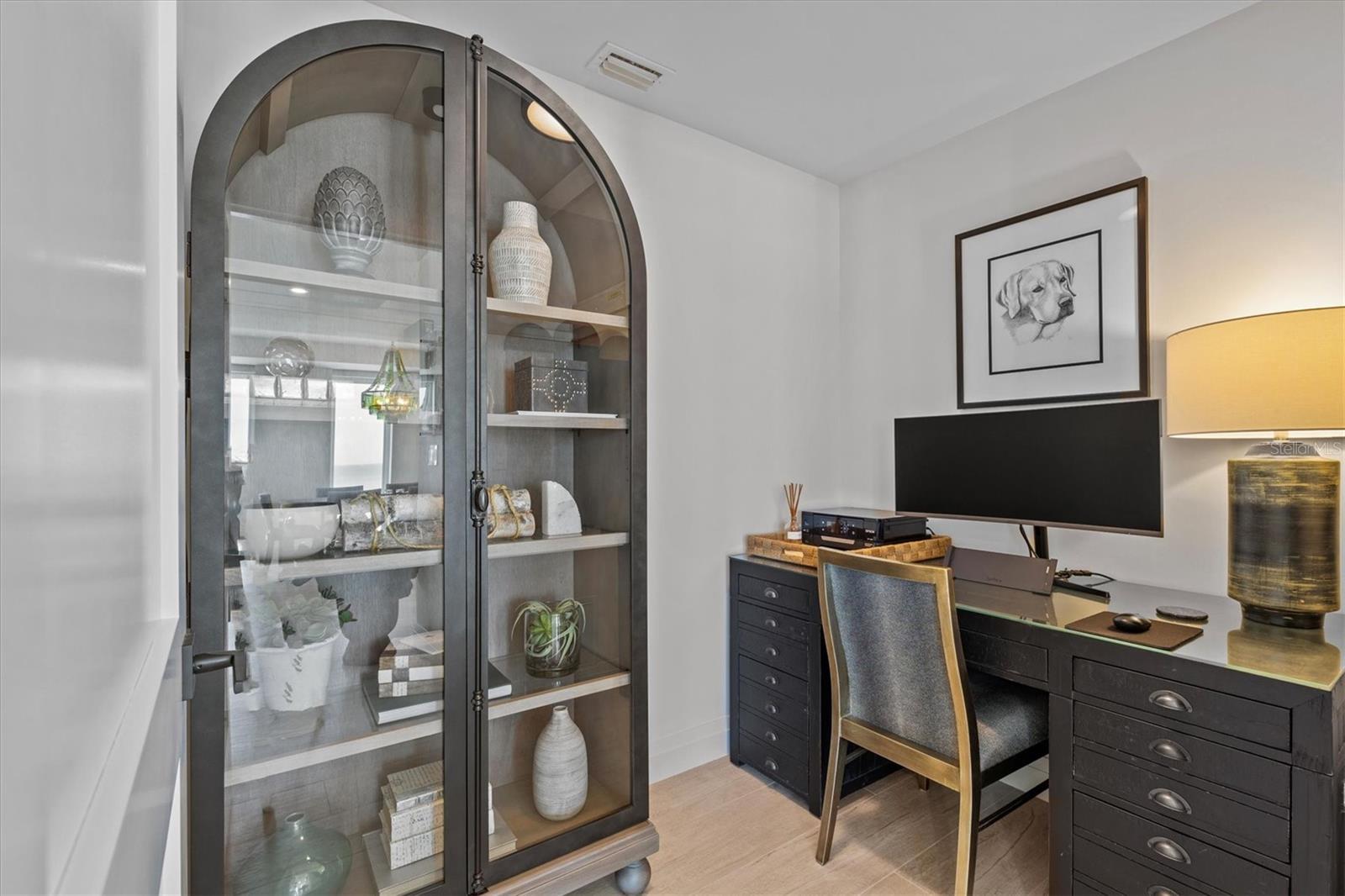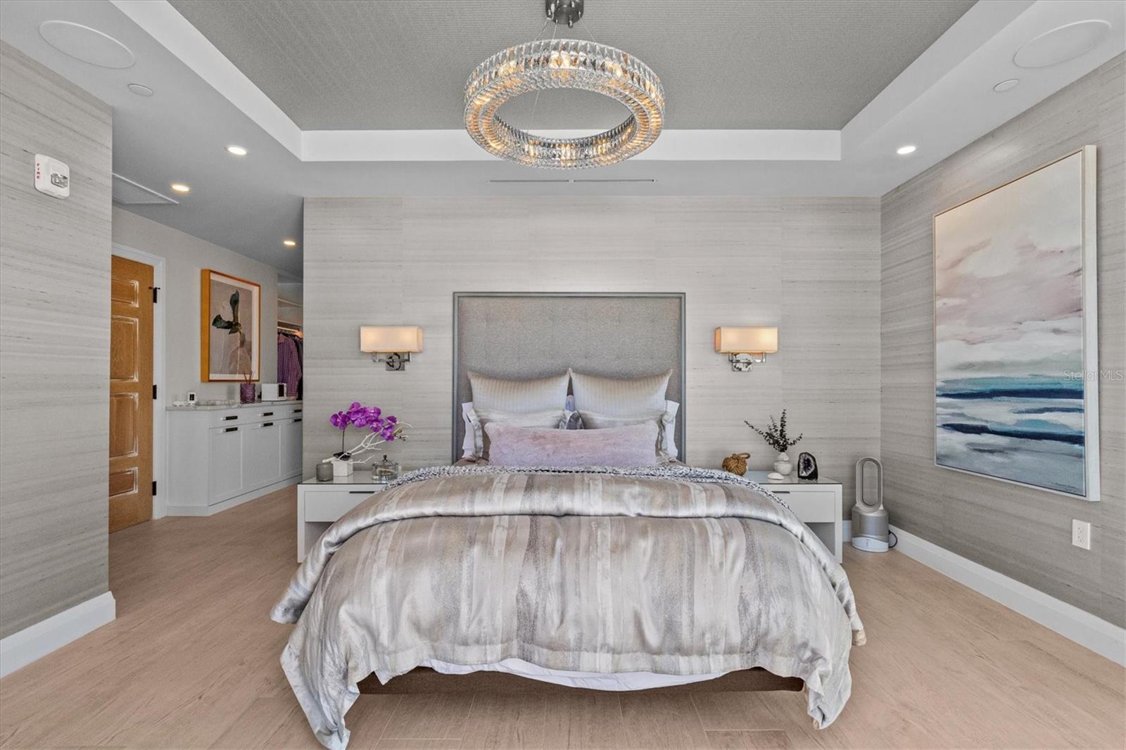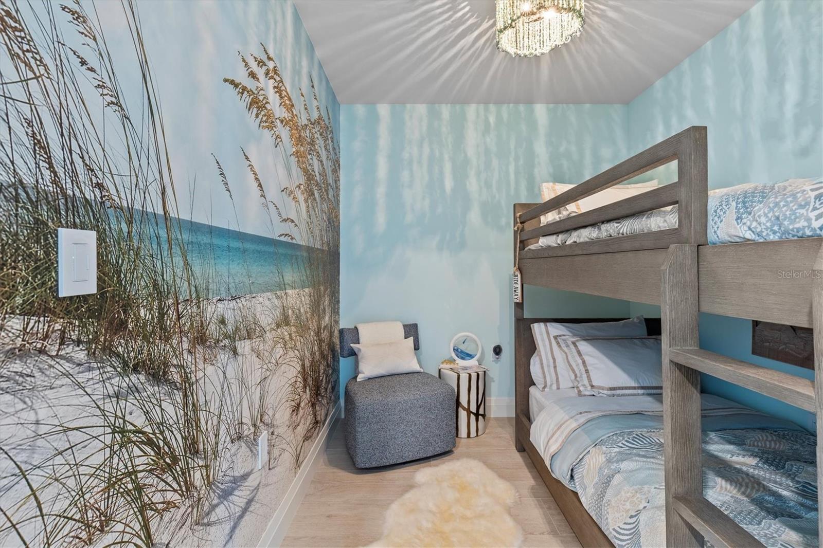 Experience the ultimate in luxury beachfront living at Pura Vida Clearwater Beach, where sophistication blends seamlessly with elegance. This exceptional 2,240-square-foot condominium features two bedrooms, a bonus room, an office, and two and a half bathrooms, designed with an open-concept layout that invites natural light and maximizes ocean views. The living, dining, and kitchen areas flow effortlessly into private glass-paneled balconies, providing the perfect setting for both entertaining and everyday relaxation. A harmonious mix of modern and traditional furnishings creates a transitional aesthetic that exudes livable luxury, while custom finishes and designer fixtures by Franco A. Pasquale Design Associates elevate the home's refined ambiance. The chef-inspired gourmet kitchen is a masterpiece, featuring top-of-the-line Miele and Sub-Zero appliances, sleek quartz countertops, custom cabinetry, a wine fridge, a gas stovetop, and a discreetly integrated dishwasher and refrigerator. The centerpiece is a striking waterfall quartz island with integrated deep sink, ideal for preparing meals while enjoying sweeping oceanfront views. After dinner, the primary bedroom provides a serene retreat with generous proportions, floor-to-ceiling windows, and a private balcony which is perfect for sunset gazing. Its en-suite spa-like bathroom boasts dual sinks, a separate water closet, a dedicated vanity, a soaking tub, and a glass-enclosed shower, all enhanced by a luxurious towel warmer. The walk-in closet is nothing short of a boutique-inspired haven, complete with illuminated wardrobe, chandelier, spacious jewelry cabinet, and a hidden washer and dryer with water filtration system, for ultimate convenience. For your out-of-town guests, the guest bedroom offers privacy and comfort with ocean views and its own en-suite bathroom. The oversized walk-in closet has been thoughtfully reimagined into a charming sleeping nook, featuring bunk beds and a custom mural of Clearwater Beach, ensuring every guest has a memorable stay. This property offers secure, gated access with two designated parking spaces that pre-wired for charging stations. A secure private elevator opens directly into the foyer, with an additional secure entry for added peace of mind. Practical features include a bike storage room, a designated beach locker, and a spacious air-conditioned storage unit. Situated in the heart of Clearwater Beach, this prime location offers easy access to pristine sands, vibrant dining experiences, boutique shopping, and recreational activities such as pickleball and a nearby playground. After a day exploring the best of Florida's renowned coastline, unwind by the oversized heated pool and spa, stay active in the well-appointed fitness center, or gather with friends in the inviting club room. Combining luxurious design, thoughtful functionality, and a prime beachfront location, this exceptional property is the ultimate coastal retreat. Contact us today to schedule your private showing and discover the unparalleled lifestyle awaiting you at Pura Vida Clearwater Beach.