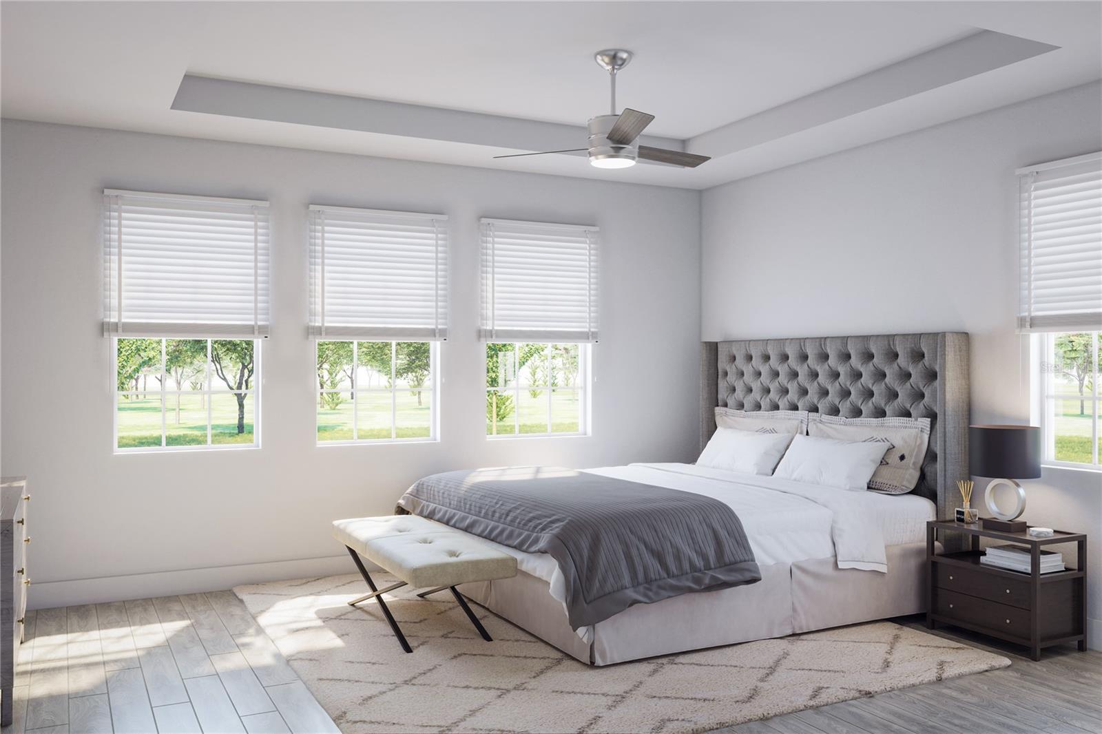 - Attic Ventilator, Ceiling Fans(s), High Ceilings, In Wall Pest System, Living Room/Dining Room Combo, Open Floorplan, Pest Guard System, Primary Bedroom Main Floor, Solid Surface Counters, Stone Counters, Thermostat, Tray Ceiling(s), Vaulted Ceiling(s), Walk-In Closet(s)