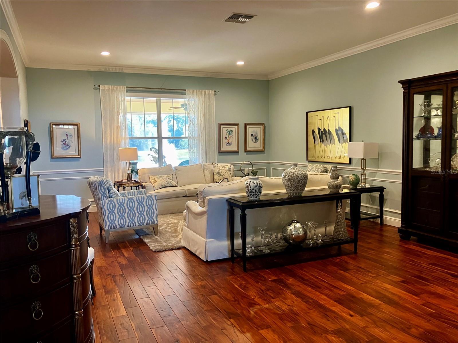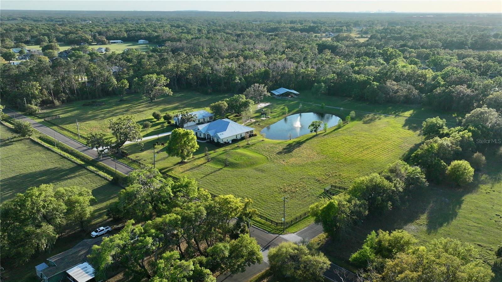 Under contract-accepting backup offers. Enjoy the best of Florida living on an estate with over 24 acres of lush land featuring a custom home plus guest cottage, a pond, a meandering creek, mature trees and the option for agricultural endeavors or subdividing. The spacious custom built 3709 sq.ft. home features a split bedroom plan with 3 bedrooms, 3 full baths and has all the finest amenities including an electric security entrance gate, a 676 sq.ft. garage, metal roof, 10' high ceilings, crown moulding, wood floors, custom cabinetry and granite counters throughout. A foyer welcomes you into the home with an executive office on the right, a formal dining room on the left and into the living room ahead with views out to the pond. The kitchen is oversized with stainless appliances, a gas stove, and the island overlooks the breakfast nook and family room with gas fireplace. A large walk-in pantry, butler's pantry and utility room with cabinets and closet provide ample bonus storage space. The primary bedroom has a view of the pond and sunset, a large split closet area with built-in storage that leads to a spacious en-suite bathroom featuring separate vanity sinks with cabinets, a claw foot tub, shower and water closet. The split floorplan includes two additional bedrooms, one with an en-suite full bath and an additional full bath in the hall. The large enclosed screened porch has a finished wood ceiling, ceiling fans, a wet bar, pavers, and overlooks the pond with a sunset view. Just off the pond is a paved area with fire pit, seating and swing. The estate also has a lovely guest cottage with 868 sq.ft. featuring a full kitchen, living room, 2 bedrooms, 1 full bath, stackable washer/dryer, a large enclosed screened porch and a 924 sq.ft. garage. Property systems include three AC units, tankless on demand water heaters, a generator, a covered well, two septic tanks, and a large pole barn. Both homes were built in 2015. The property perimeter is fenced and has multiple gate entrances. The southwest corner of the property is separate, located on the other side of Pierce Harwell Loop. Campbell Branch creek meanders along the southern edge of the property. The property is approximately 23 miles to Tampa International Airport, 20 miles to Tampa General Hospital, and 26 miles to MacDill Air Force Base.