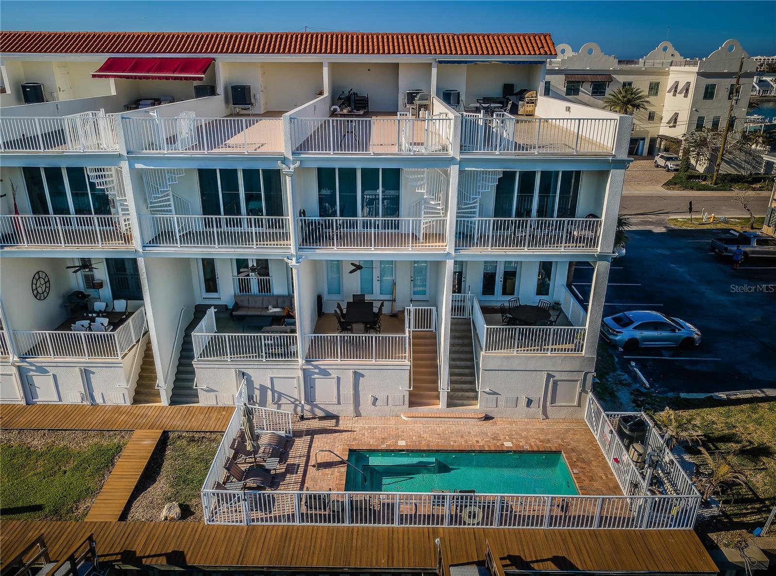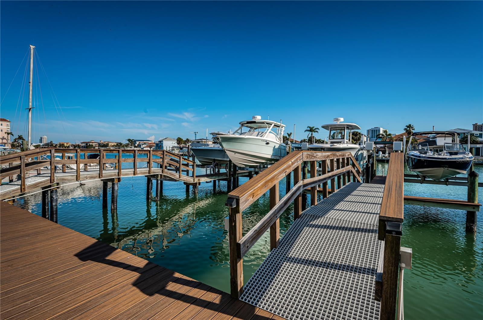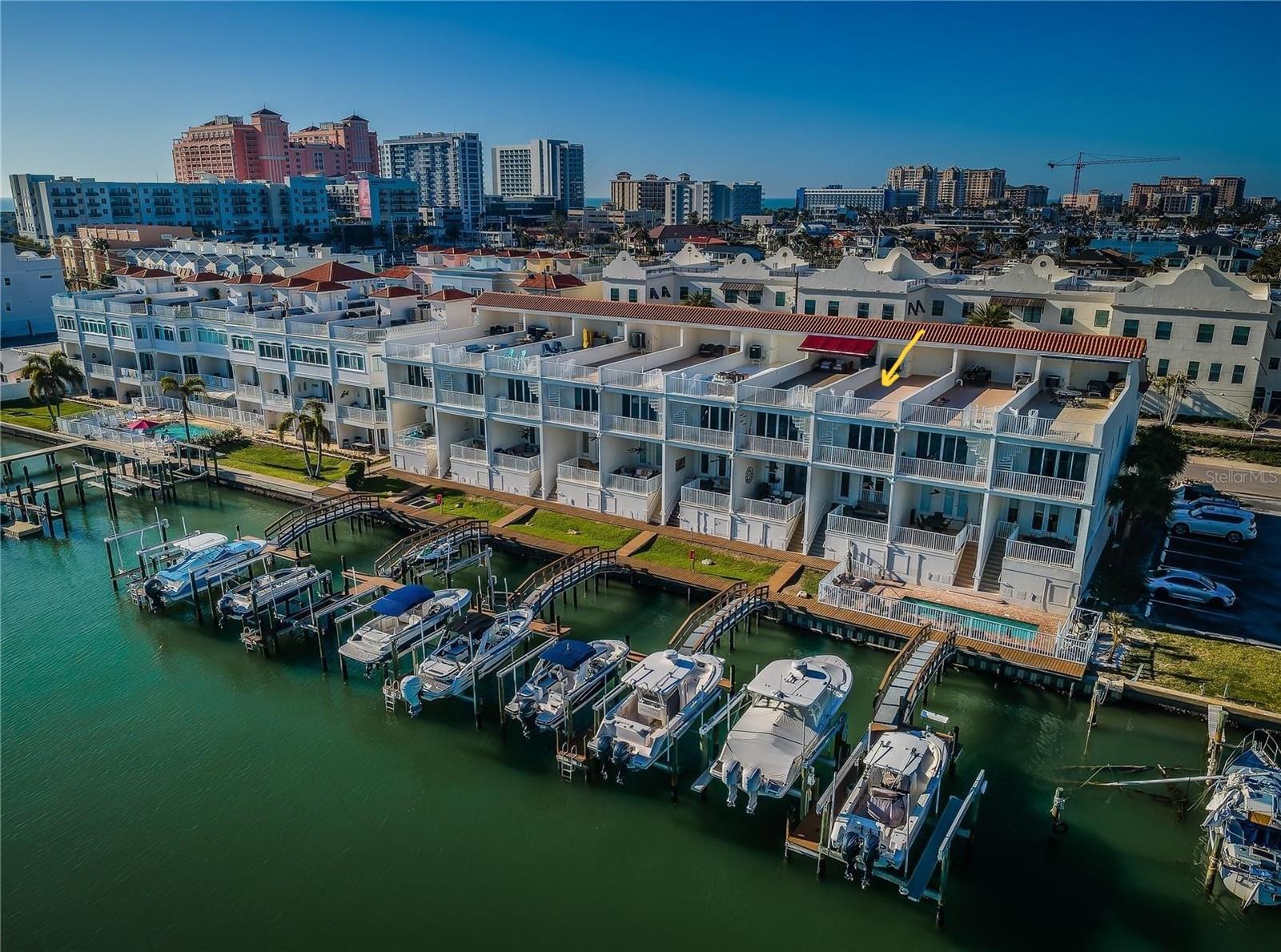 Under contract-accepting backup offers. Exceptional New Pricing! Sellers are motivated and open to reasonable offers on this stunning waterfront townhome featuring a private dock and boat lift with direct Gulf access — an opportunity not to be missed. This completely remodeled elevated residence is move-in ready and offers the perfect blend of luxury and convenience. The gourmet kitchen features custom cabinetry, quartz countertops, and stainless-steel appliances, while the spacious master suite boasts a spa-like bathroom with dual vanities, a walk-in shower, and elegant designer finishes. Additional upgrades include new flooring throughout, updated lighting, stylishly renovated guest baths, a recently coated roof, and an upgraded A/C system. Enjoy the ease of a private elevator to all levels including the roof top patio, a rebuilt balcony ideal for entertaining, and your own private boat dock with a 10,000 lb. boat lift and direct Gulf access. The home’s crown jewel is the private rooftop patio, perfect for relaxing or entertaining while taking in sweeping views. A tandem 3-car garage with separate storage access provides plenty of space for vehicles, water toys, and more. The pool is just steps away, and all of this is within a short walk to world-renowned Clearwater Beach, vibrant entertainment, shopping, and fine dining.