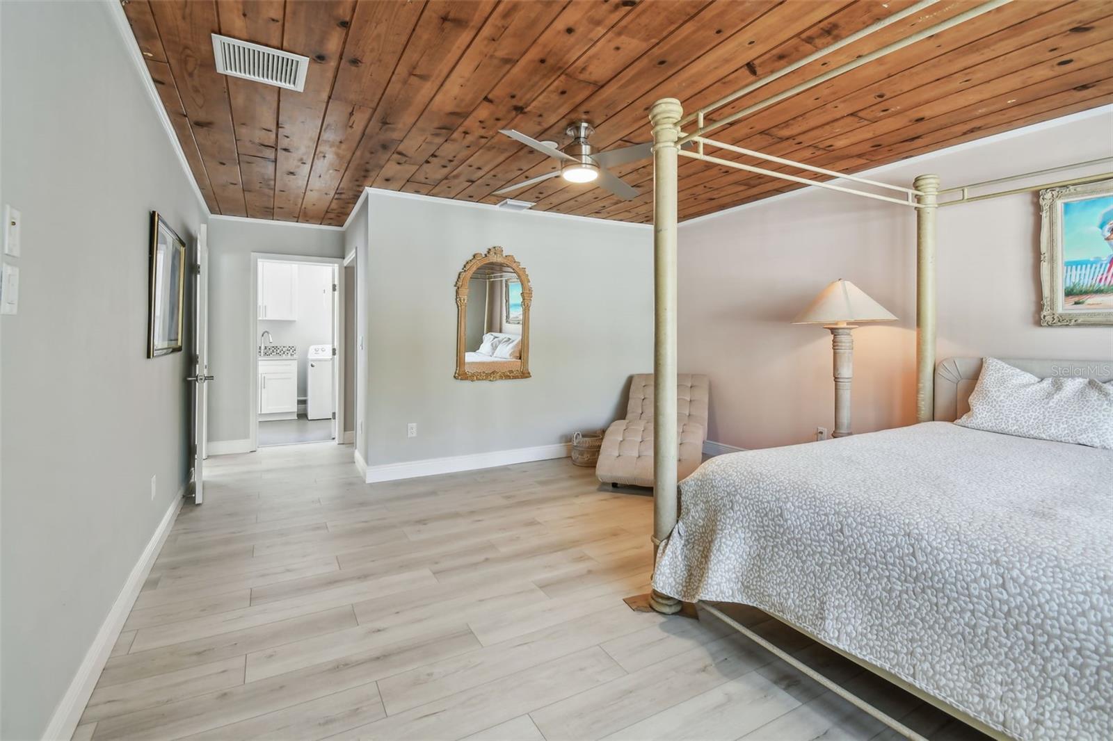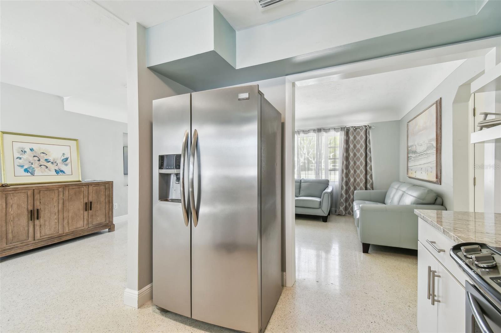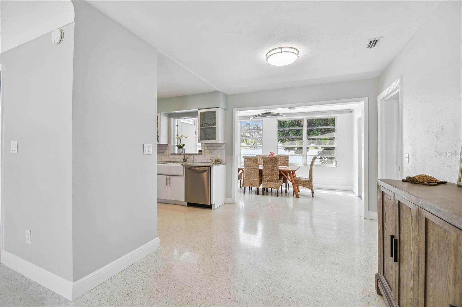 Just blocks from Main Street and in Dunedin’s Golf Cart Zone, this fully renovated solid-block home offers timeless design, exceptional outdoor living and walkable access to the city’s most beloved attractions. Positioned in a non-flood, non-evacuation zone, the residence includes four bedrooms, two baths, 1,872 square feet of heated living space and 2,196 total square feet under roof, which includes a spacious screened lanai. A comprehensive renovation completed in 2020 and 2021 introduced elevated functionality and refined finishes throughout. A new primary suite was created, featuring hurricane-certified windows and a custom walk-in closet. Interior upgrades include all new electrical, plumbing, ductwork and insulation, along with porcelain tile in both baths, laundry and lanai. Restored terrazzo anchors the main living areas, while all bedrooms received new flooring in 2024. The kitchen is outfitted with KraftMaid soft-close cabinetry, granite countertops, a farmhouse sink and new appliances. The baths feature solid surface countertops and new plumbing fixtures, with the primary bath enhanced by a designer German Duravit soaking tub and wall-mounted Duravit vanity with integrated drawers. Additional updates include installation of new gutters and downspouts, as well as new aluminum-covered framing for the screened lanai. Further enhancements include a circular driveway with pavers in the front yard, a designer front door, new interior doors and hardware, detailed moldings, and a deep laundry sink with storage cabinetry. Outdoors, the fully fenced backyard offers a renovated gunite pool with a custom mosaic tile finish, a large pool deck, green space and dual-gate vinyl fencing for convenient access. A new pool pump, irrigation system, and Deck-o-Drain at the front and rear ensure optimal outdoor functionality. Enjoy a short walk or bike ride to the Pinellas Trail, Edgewater Park, the Intracoastal Waterway or the Dunedin Downtown Market, offering a dynamic and connected lifestyle in one of Florida’s most walkable coastal communities.