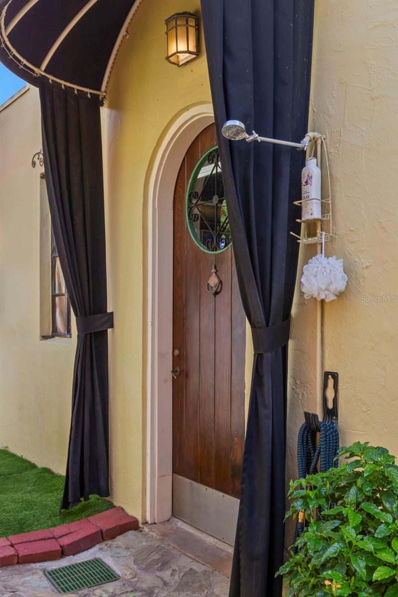 - Awning(s), Courtyard, French Doors, Lighting, Outdoor Shower, Private Mailbox, Rain Gutters, Sidewalk