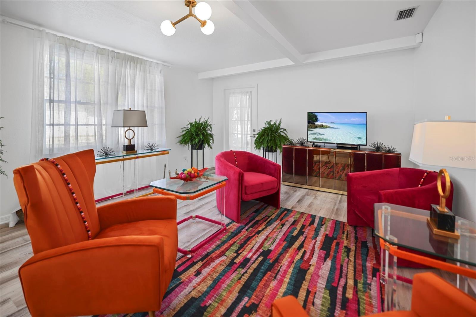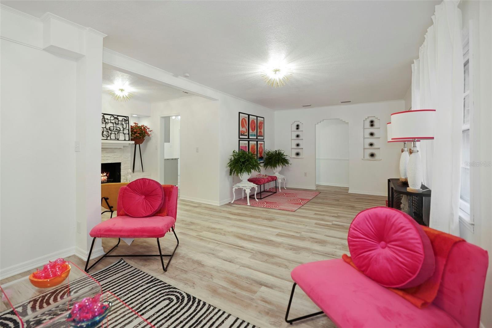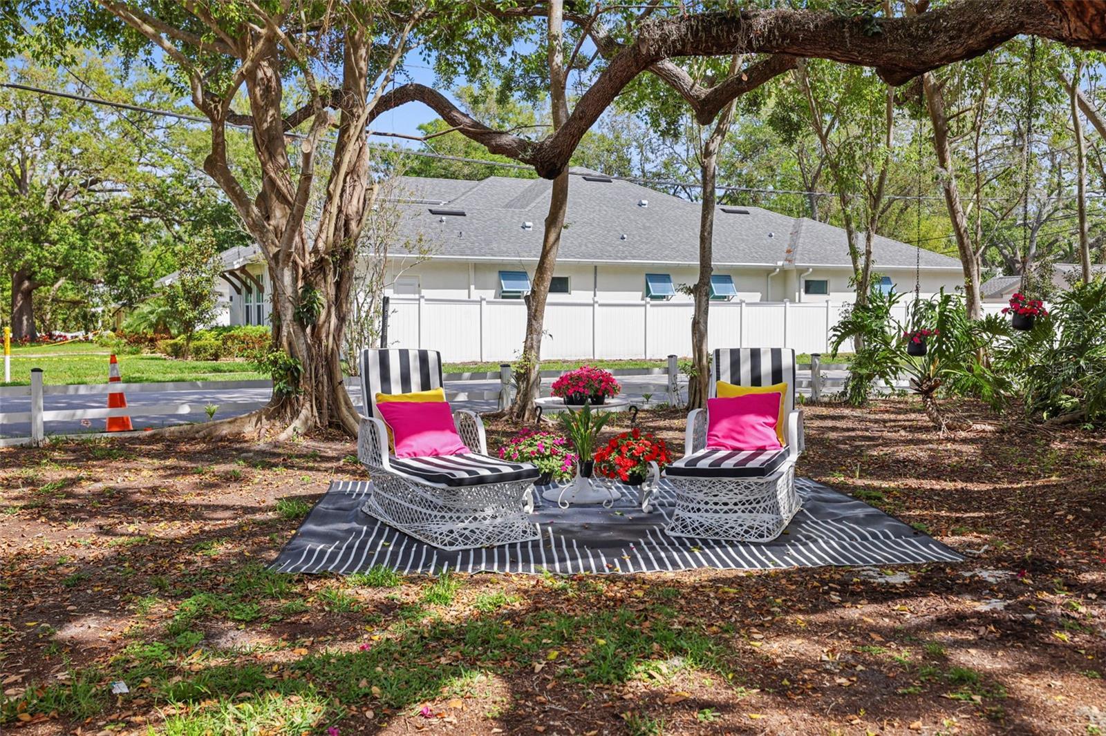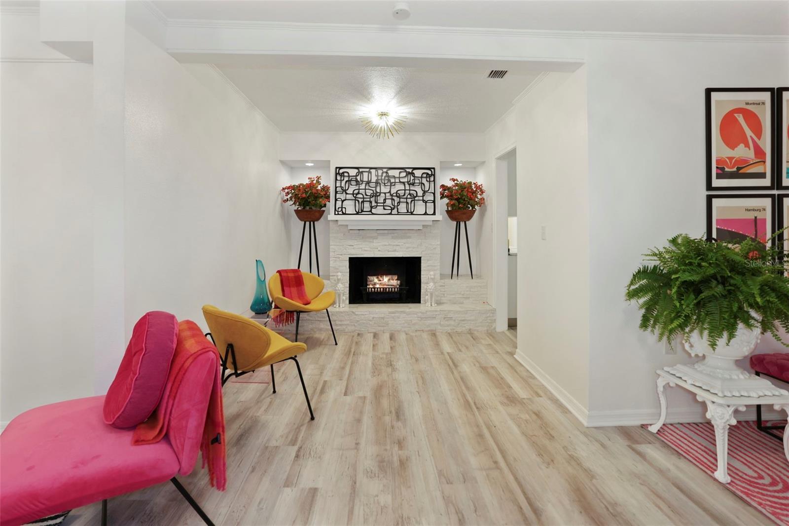 Welcome to your storybook home in the heart of Downtown Dunedin! Perfectly positioned on a picturesque brick-lined street at the corner of Milwaukee and Scotland, this enchanting 3-bedroom, 1.5-bath home sits on an oversized corner lot framed by majestic oak trees. The location couldn’t be more ideal—just a short stroll, bike ride, or golf cart cruise to everything that defines the Dunedin lifestyle: the marina, Pinellas Trail, parks, local breweries, boutiques, and world-class restaurants. Thoughtfully and tastefully remodeled, this home blends timeless charm with modern comfort. The heart of the home is the stunning new kitchen, featuring quartz countertops, crisp white shaker cabinets, stainless steel appliances, and designer lighting. Fresh paint, updated fixtures, and a warm, open floor plan invite you in. A cozy fireplace adds ambiance to the spacious living room, making it the perfect space for gathering and relaxing. To the right of the entry, a generous bedroom offers flexible use, while down the hall you’ll find two more bedrooms, including one with a convenient half bath. The main bath has been completely remodeled and has beautiful designer tile and finishes. The kitchen is ideally located at the center of the home, connecting a sunny eat-in nook—complete with a door that opens to a private side patio—and a formal dining area just off the living room. Need a quiet space to work or unwind? A dedicated office is tucked just off the living room. Step through to the screened-in lanai and take in the expansive backyard—an open canvas with plenty of room for a pool, garden, or anything your heart desires. With large closets, a 2024 A/C, and a 2018 roof, this home offers peace of mind and effortless living.Also not in a flood zone! Don’t miss your chance to experience the Dunedin lifestyle at its finest. Schedule your private showing today!