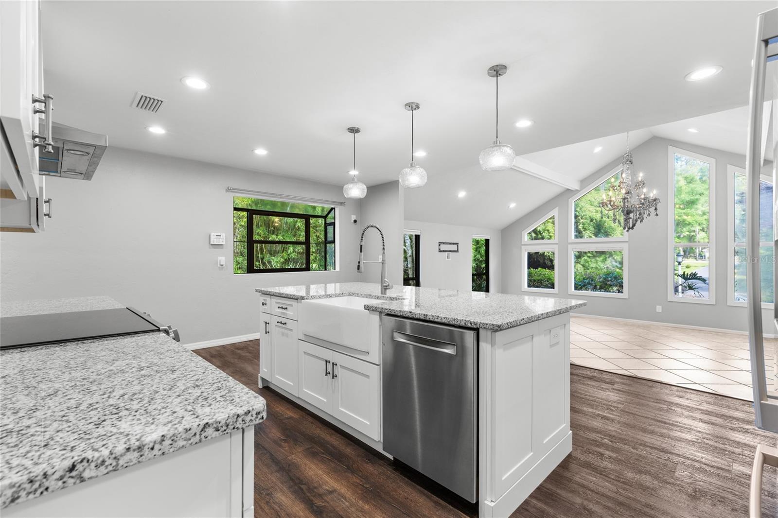 - Cathedral Ceiling(s), Ceiling Fans(s), Eat-in Kitchen, High Ceilings, Kitchen/Family Room Combo, Living Room/Dining Room Combo, Primary Bedroom Main Floor, Stone Counters, Vaulted Ceiling(s), Walk-In Closet(s)