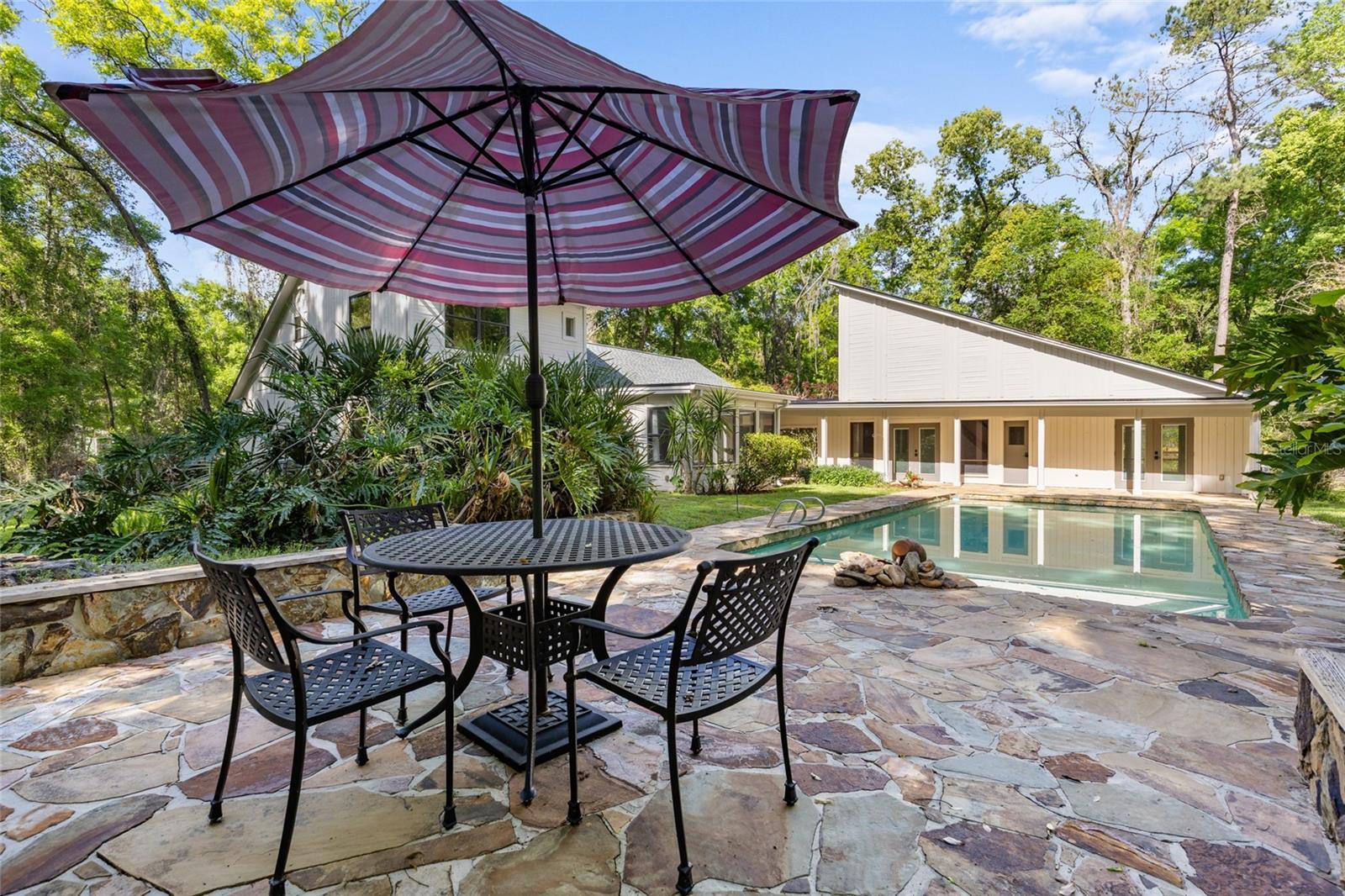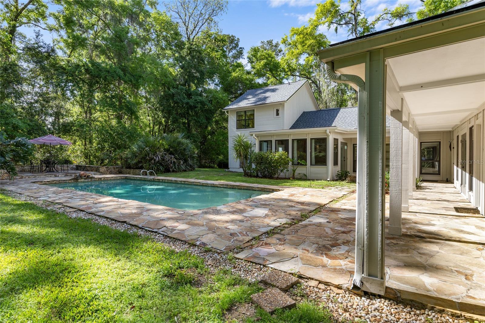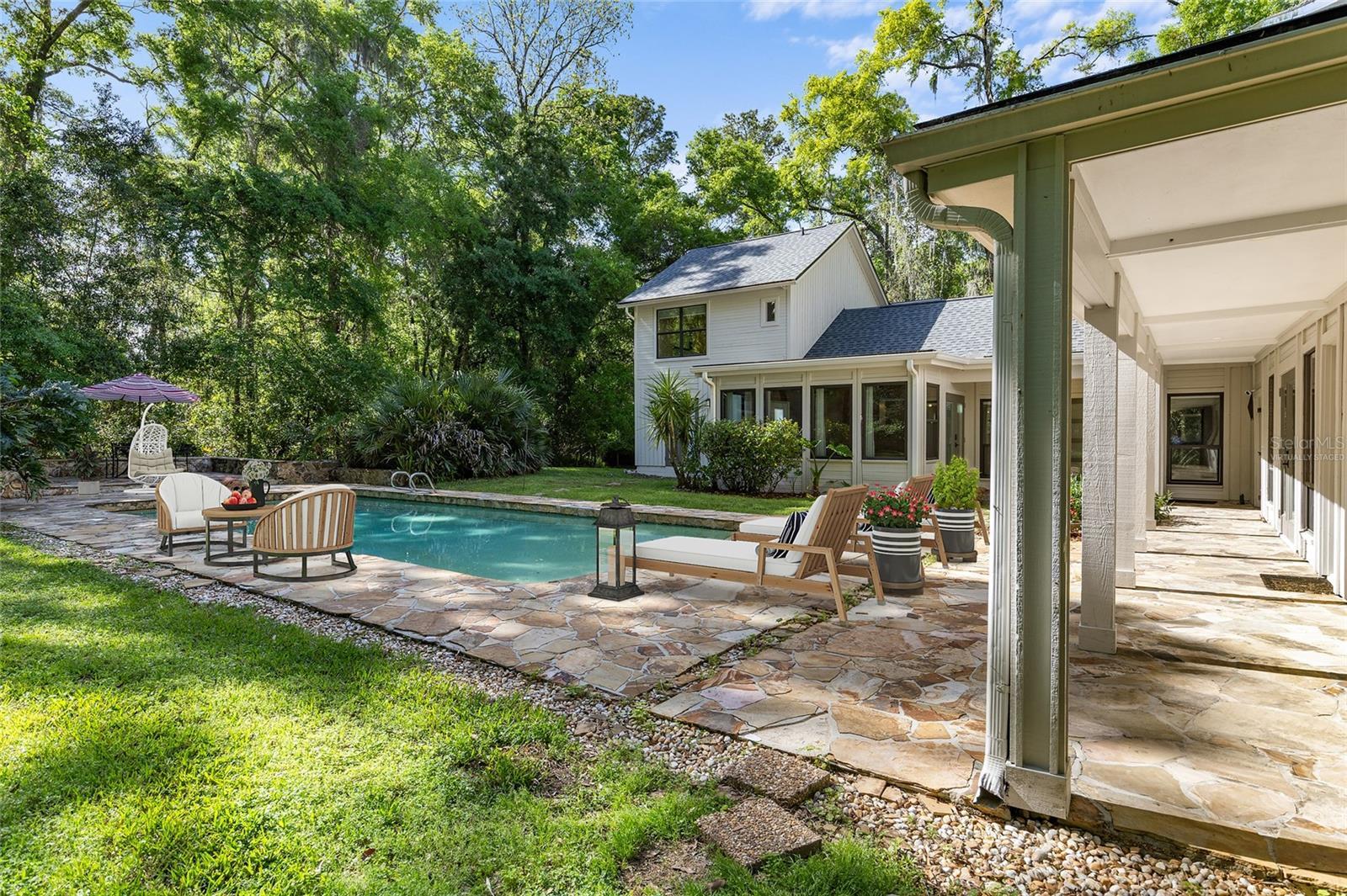 Under contract-accepting backup offers. This is the one you've been searching for! Set on nearly 2 acres of lush, natural beauty in the most desirable part of Southwest Gainesville, this stunning and architecturally unique property offers a distinctive blend of modern luxury amidst tranquil surroundings, making it ideal for those who appreciate both style and serenity. Like nothing available on the market, 1324 SW 98th Street gives its new owners unlimited options with both a main house and separate mother-in-law suite, in addition to a flagstone flanked swimming pool, oversized two-car garage, large greenhouse and koi pond. Enter through the residence's intricate wrought iron gate and you will feel like you've been transported to your own private compound that could have been the home of a famous artist, musician or writer. The main house spans more than 2,100 sqft and features a massive great room with elegantly updated and open kitchen, dining, and living room layout bathed in natural light and scenic views of the verdant grounds. The kitchen is a culinary delight, boasting fully updated stainless steel appliances, granite countertops, and a center island with breakfast bar. Enjoy two primary suites designed for ultimate comfort and privacy. The first-floor suite includes a fully renovated bath with double sinks, granite countertops, and a walk-in shower. Massive cedar walk-in closet! The upstairs suite boasts built-in bookshelves, another fully renovated bath and another walk-in closet. Additional amenities include a large interior laundry room with front-loading washer and dryer, a huge pantry closet, and a fully enclosed heated and cooled sunroom/den that overlooks the sparkling pool area, providing a perfect spot to relax and enjoy the surrounding natural splendor. Joined by a covered walkway, the mother-in-law suite provides another 800 sqft of living space with large bedroom overlooking the greenhouse, walk-in closet, and a full bath easily accessible from the pool, plus a generous separate living area with loft space. This incredible secondary dwelling is perfect for multigenerational housing and offers incredible versatility. It could be renovated to include a full kitchen or transformed into a gym, yoga studio, artist/music studio, or the perfect work-from-home office space. Alternatively, it could serve as an incredible pool house, ideal for hosting epic game day parties and entertaining guests. It can not be overstated that this truly unique property is a nature lover’s paradise, complete with a private greenhouse and a serene Koi Pond, offering a peaceful retreat right in your backyard. The oversized two-car garage provides ample storage and workshop space for all your needs. Fully fenced, the grounds ensure privacy and security amidst the lush landscape. Located just minutes from Haile Plantation, the Town of Tioga, and the top-rated schools in Southwest Gainesville, this home offers the perfect balance of seclusion and accessibility. Immerse yourself in the natural beauty and modern elegance of this one-of-a-kind property. Don’t miss the opportunity to make this stunning retreat your own! Watch the Video Tour at: https://youtu.be/fk7SsKqLAJE?si=wbagWV0nrO0i94Rq