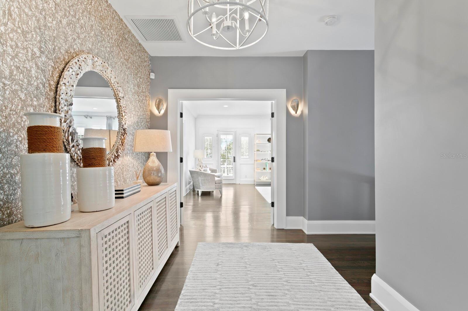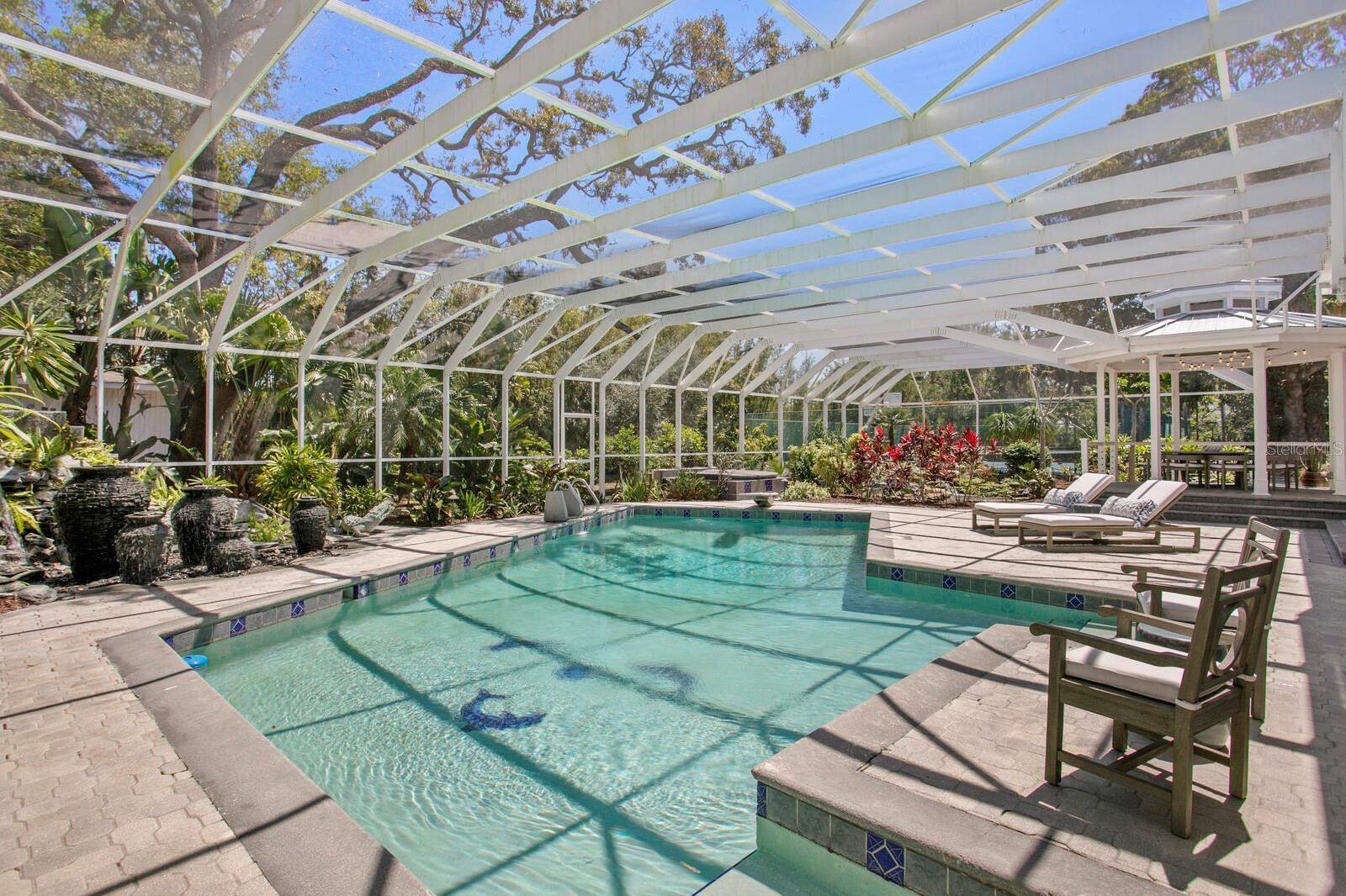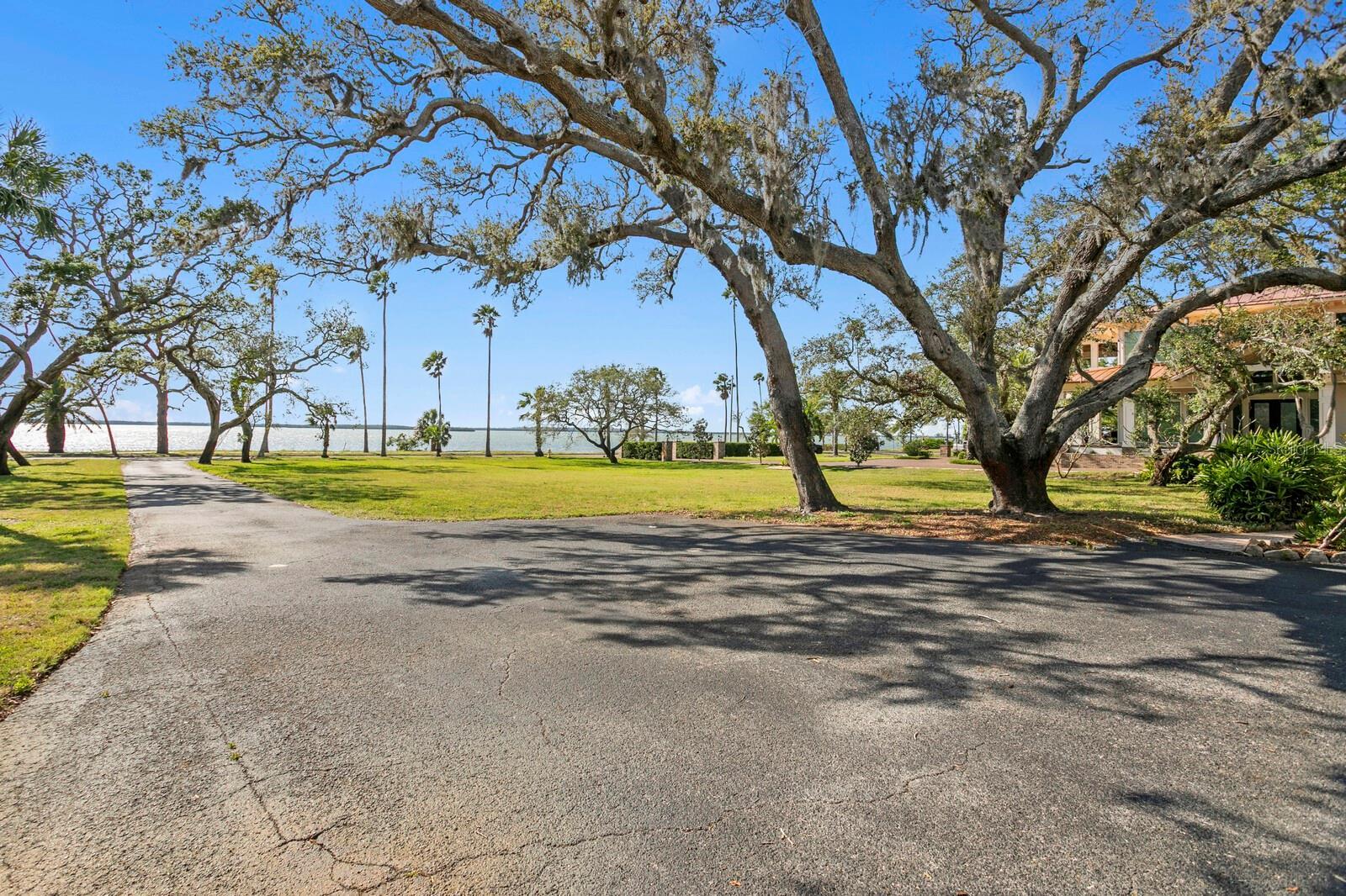 A rare opportunity awaits on the prestigious Edgewater coastline—4.9 acres of elevated coastal elegance spanning two expansive lots with over 226 feet of prime water frontage. This estate is the embodiment of timeless sophistication and enduring craftsmanship, seamlessly blending classic architecture with thoughtful, modern refinement. With a proven history of resilience—remaining untouched by the 2024 storms—it offers peace of mind and enduring value. Each parcel allows for Intracoastal Waterway access, with the option to add a private dock, further enhancing the estate’s waterfront appeal. From the moment of arrival, grandeur and serenity abound. A newly constructed TEK composite porch leads into a residence rich with character—restored original hardwoods, custom millwork, and layered textures create a setting that is both stately and warmly inviting. Multiple living spaces, each imbued with their own ambiance, include a formal music room and a sitting room—both anchored by wood-burning fireplaces—a wraparound-windowed dining room, and a cozy family den complete with custom built-ins and a rolling library ladder. At the heart of the home, the chef’s kitchen is a culinary showcase: six-burner Thermador range, dual Sub-Zero refrigeration, wine fridges, a warming drawer, and a large central island adorned with Swarovski crystal hardware. Underfoot, linen tile floors lead through to a light-filled family room where sliding glass doors open to panoramic water views, creating a seamless transition to the outdoor oasis. Whether hosting grand soirées or enjoying quiet mornings, the home’s built-in bar, casual dining nook, and expansive entertaining areas are thoughtfully designed to elevate every moment. Upstairs, a loft-style corridor with tobacco-printed wallpaper guides you to the guest bedrooms—each spacious and unique—a cork-accented bath, and an elevator that serves all floors for ultimate convenience. The west-facing primary suite is a private sanctuary, complete with fireplace, private sunset balcony, and a spa-caliber ensuite featuring a marble walk-in shower, soaker tub, crystal-inlaid mosaic tiling, and a bespoke dressing room with center island storage. Beyond the main home lies a gracious guest house—with three bedrooms, balconies, a prep kitchen, and its own Generac generator—perfectly suited for visitors or extended stays. A Game Room House offers endless entertainment with a full bar, bath, and ample room for games, while a custom office with floor-to-ceiling cabinetry and balcony provides a serene space for productivity. Outdoors, the estate transforms into a private coastal retreat: a lighted tennis court, koi pond with cascading waterfall, gazebo for al fresco dining, and a resort-style swimming pool with diving board all set within lushly landscaped grounds and gas lantern-lit ambiance. A fully outfitted garage with new laundry, full bath, gym area, and abundant storage completes the offering. With restored windows, natural gas service, and curated luxury finishes throughout, this home is not just a residence—it’s a legacy. With its elevation, privacy, iconic location, and unyielding beauty, it offers a once-in-a-generation opportunity to own a piece of the coast that’s truly irreplaceable. Come see this unique property blocks from the Historic Fenway and 1 mile to downtown Dunedin.