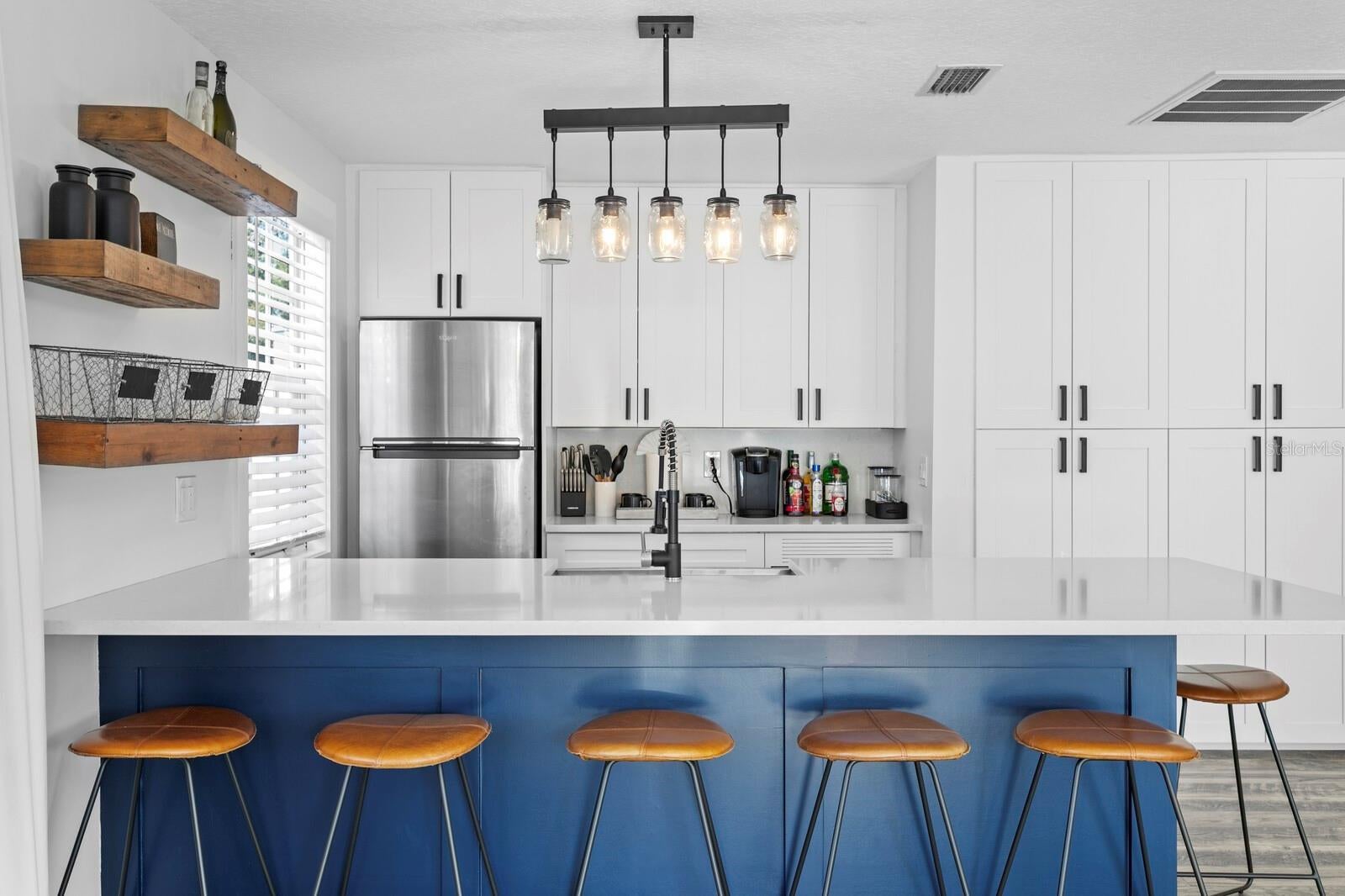 - Built-in Features, Ceiling Fans(s), Coffered Ceiling(s), Crown Molding, Dry Bar, Elevator, Kitchen/Family Room Combo, Open Floorplan, PrimaryBedroom Upstairs, Solid Surface Counters, Solid Wood Cabinets, Split Bedroom, Stone Counters, Thermostat, Tray Ceiling(s), Walk-In Closet(s), Window Treatments