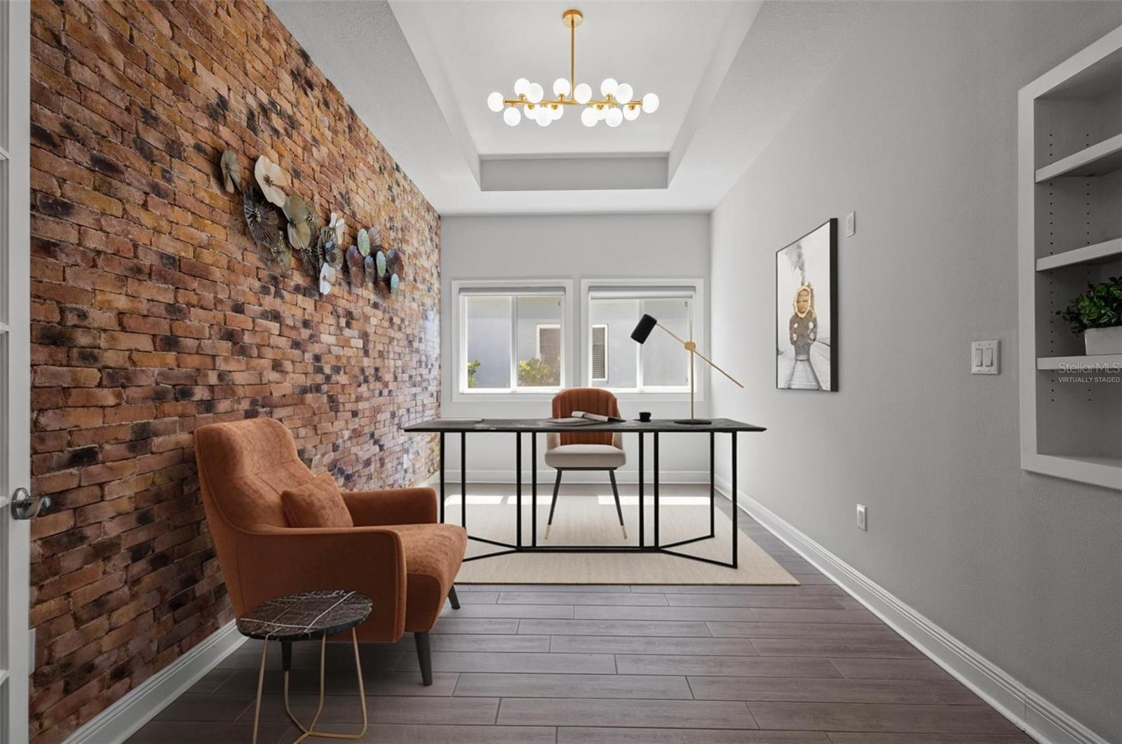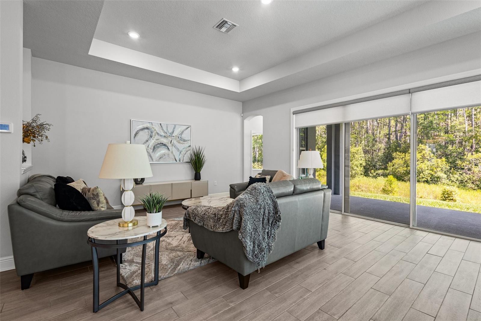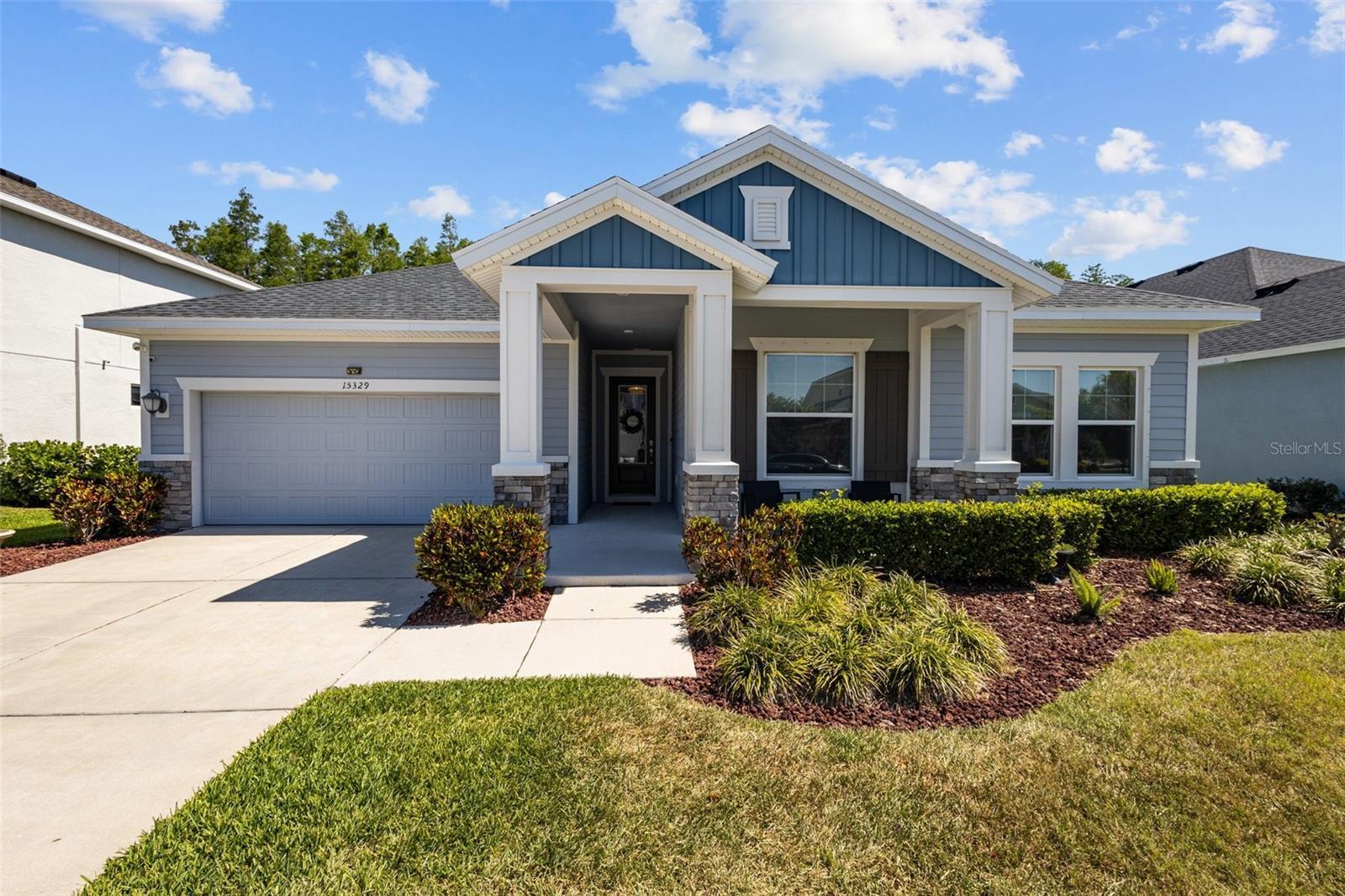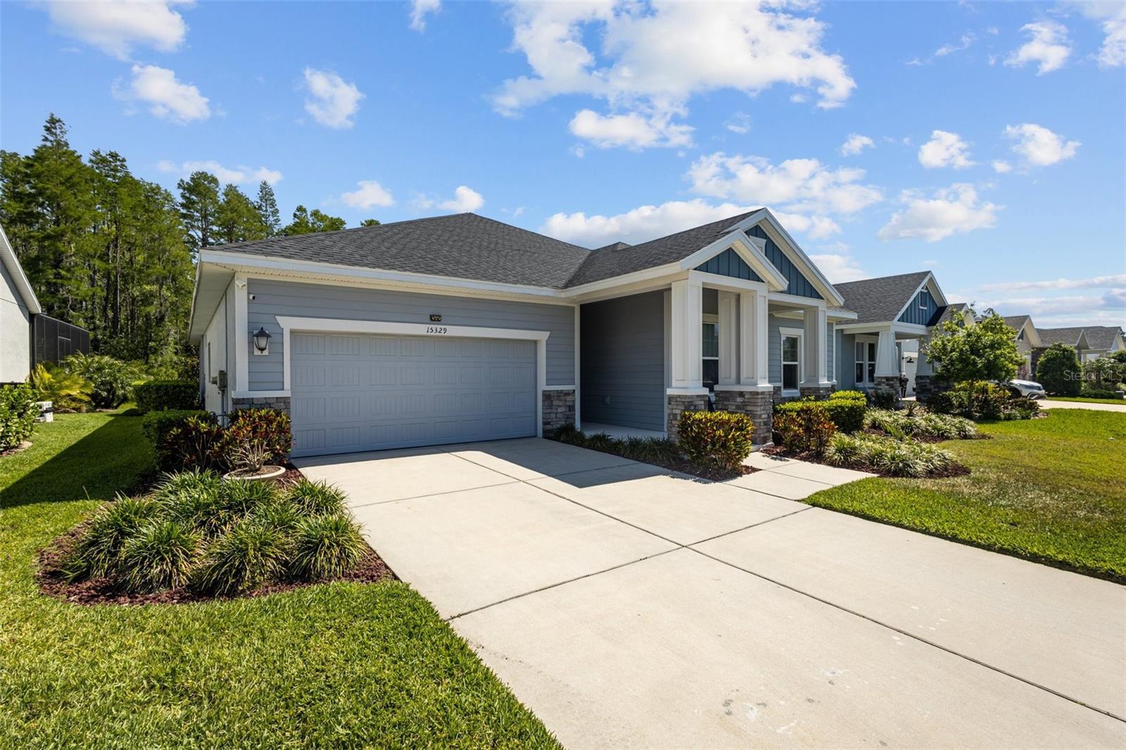 Under contract-accepting backup offers. One or more photo(s) has been virtually staged. Privacy and layout drive the experience in this single-story home set on a conservation lot with no rear neighbors in Asturia. Nearly 2,900 sq ft is arranged to keep daily living open and connected while maintaining separation for work, guests, and quiet spaces. Southwest-facing rear exposure brings consistent natural light and frames wooded conservation views through large glass sliders. Main living areas feature 12-foot ceilings and wide-plank wood-look tile. The kitchen functions as the center of the home with 42-inch cabinetry, quartz countertops, tile backsplash, stainless steel appliances, a gas range, and an oversized island suited for everyday use and entertaining. A built-in workspace near the kitchen provides a defined area for remote work or household organization. The great room connects directly to the dining area and a bright sitting nook overlooking the backyard and conservation. A dedicated home office at the front of the home includes French doors, a tray ceiling, brick accent wall, and custom lighting, offering flexibility for work or creative use. The primary suite is privately located at the rear and includes a spa-style bath with dual sinks, walk-in shower, and custom closet system. A guest suite with a full bath sits on a separate wing, while two additional bedrooms share a hall bath. A half bath and a spacious laundry room with built-in storage complete the interior layout. Outdoor living includes a covered veranda and fenced yard backing to protected conservation, providing privacy and sunset views. The 3-car tandem garage offers space for vehicles, storage, or workshop use and includes an EV charging outlet. Asturia community amenities include a clubhouse, resort-style pool, fitness center, dog park, playground, and miles of trails. Located approx. 1 mile from the Suncoast Trail and Suncoast Parkway access. Convenient to Publix Super Market at Starkey Ranch, Tampa International Airport, and MacDill Air Force Base.