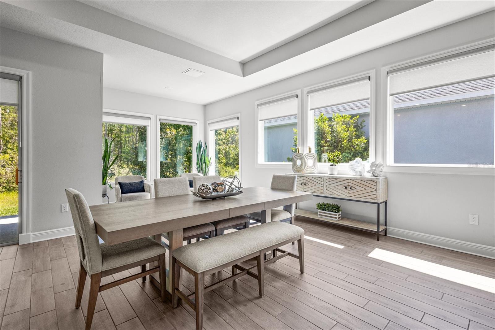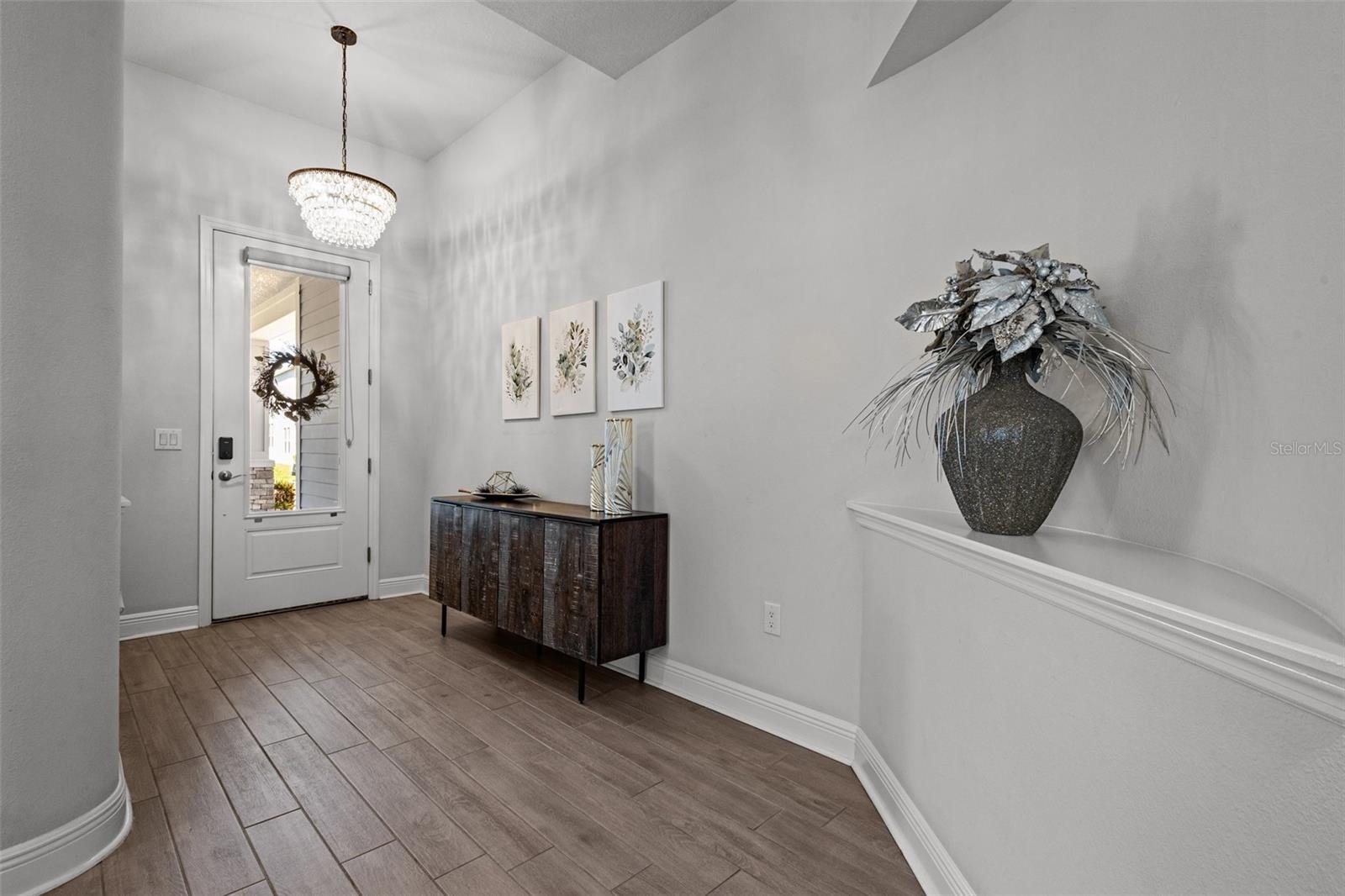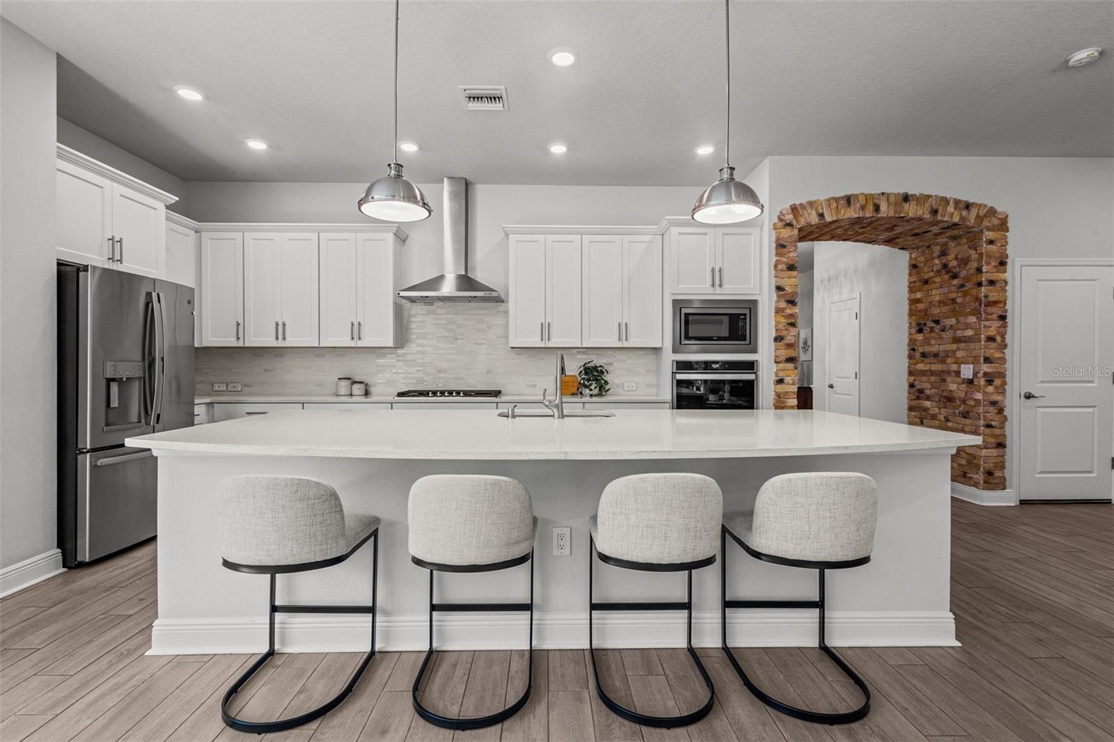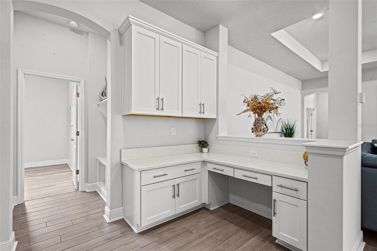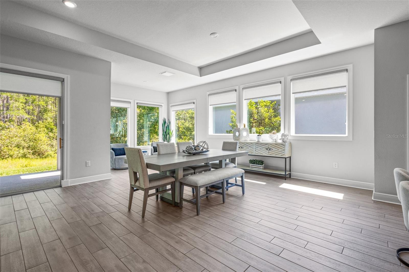 Under contract-accepting backup offers. One or more photo(s) has been virtually staged. Privacy and layout drive the experience in this single-story home set on a conservation lot with no rear neighbors in Asturia. Nearly 2,900 sq ft is arranged to keep daily living open and connected while maintaining separation for work, guests, and quiet spaces. Southwest-facing rear exposure brings consistent natural light and frames wooded conservation views through large glass sliders. Main living areas feature 12-foot ceilings and wide-plank wood-look tile. The kitchen functions as the center of the home with 42-inch cabinetry, quartz countertops, tile backsplash, stainless steel appliances, a gas range, and an oversized island suited for everyday use and entertaining. A built-in workspace near the kitchen provides a defined area for remote work or household organization. The great room connects directly to the dining area and a bright sitting nook overlooking the backyard and conservation. A dedicated home office at the front of the home includes French doors, a tray ceiling, brick accent wall, and custom lighting, offering flexibility for work or creative use. The primary suite is privately located at the rear and includes a spa-style bath with dual sinks, walk-in shower, and custom closet system. A guest suite with a full bath sits on a separate wing, while two additional bedrooms share a hall bath. A half bath and a spacious laundry room with built-in storage complete the interior layout. Outdoor living includes a covered veranda and fenced yard backing to protected conservation, providing privacy and sunset views. The 3-car tandem garage offers space for vehicles, storage, or workshop use and includes an EV charging outlet. Asturia community amenities include a clubhouse, resort-style pool, fitness center, dog park, playground, and miles of trails. Located approx. 1 mile from the Suncoast Trail and Suncoast Parkway access. Convenient to Publix Super Market at Starkey Ranch, Tampa International Airport, and MacDill Air Force Base.