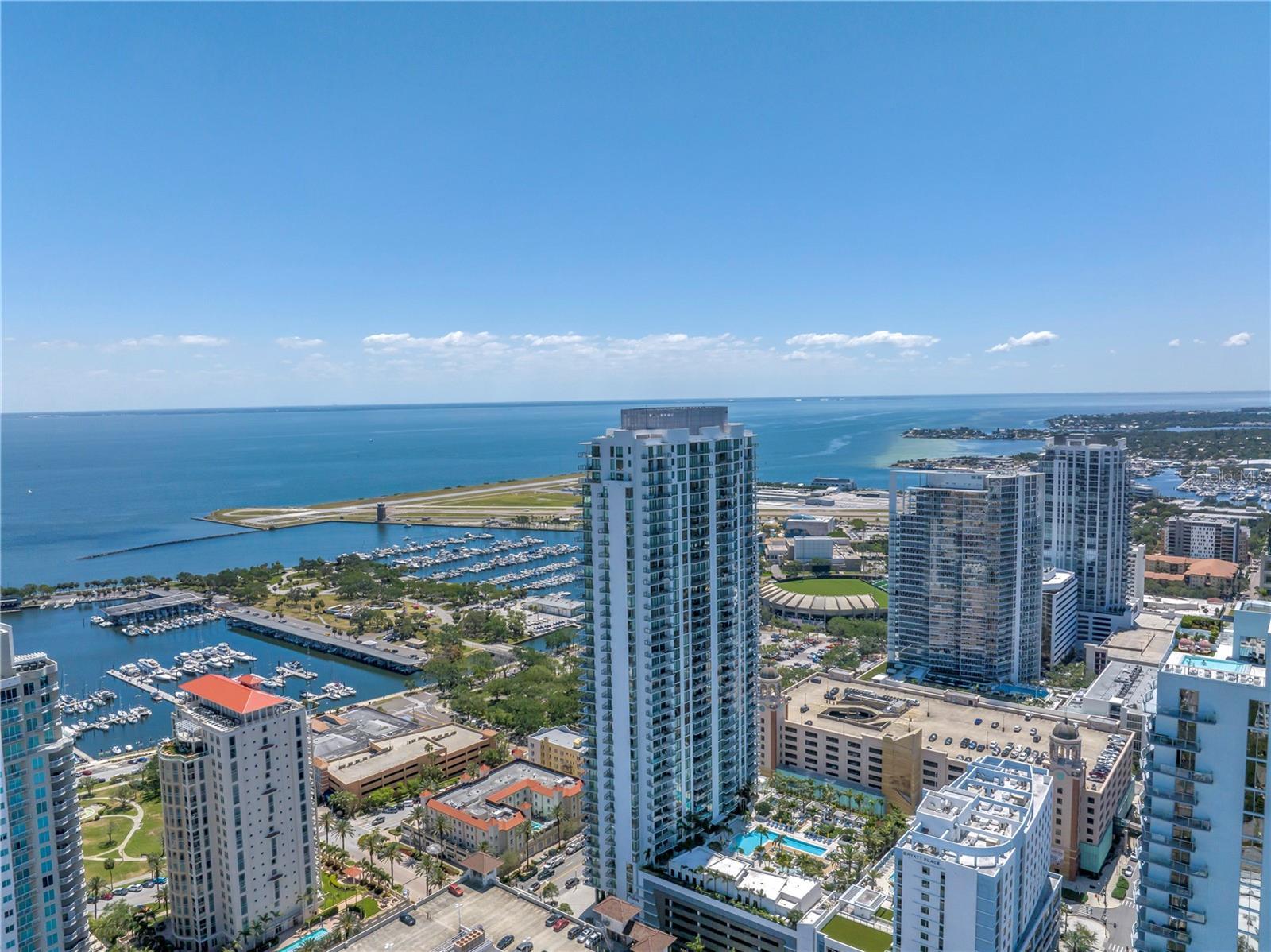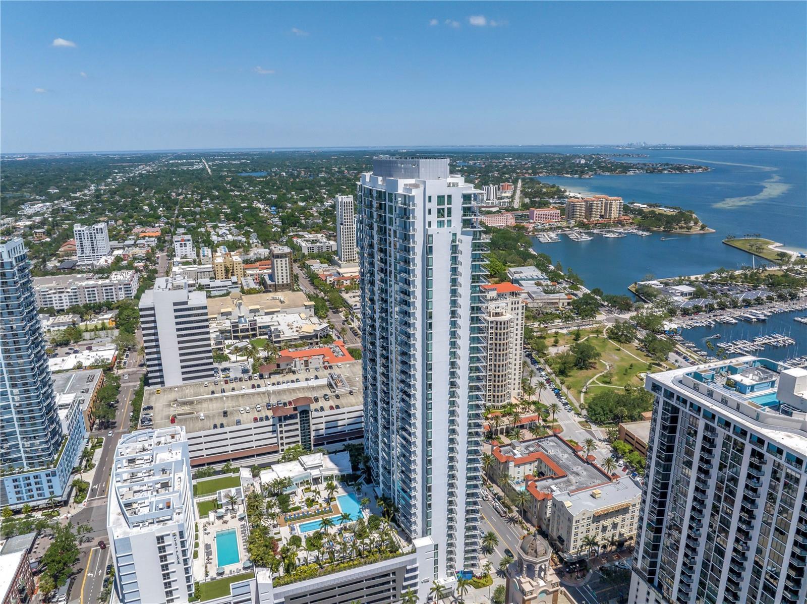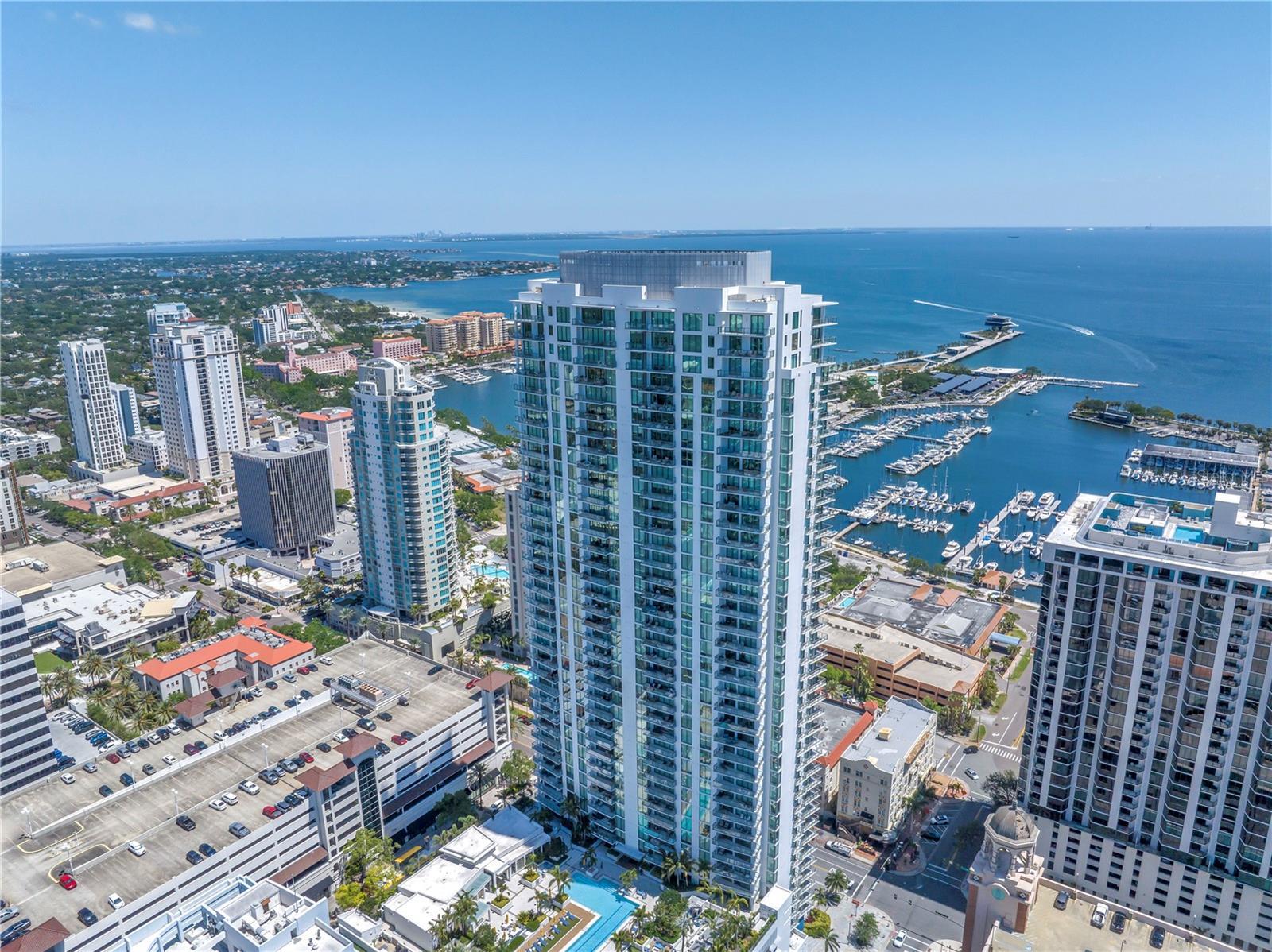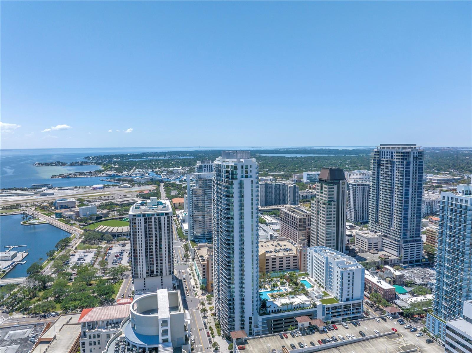 Step into a world of luxury the moment you open the door to this stunning 31st-floor residence. Immediately, your eyes are drawn across the spacious great room to the floor-to-ceiling sliding glass doors, framing sweeping panoramic views of Tampa Bay, downtown St. Pete and Albert Whitted Airport. This unit truly boasts one of the best views of any unit in Downtown St. Petersburg. Designed for both relaxation and entertaining, this 2-bedroom, 2.5-bath condo features a large multipurpose den, soaring 10-foot ceilings and an open-concept layout that flows effortlessly from space to space. The chef’s kitchen is a true showpiece, complete with high-end stainless steel appliances, flat-surface cooktop with hood, double built-in ovens, an oversized center island, and ample custom cabinetry; all finished with elegant European touches and quartz countertops. Just off the dining area, tucked quietly away, you’ll find the den. Perfect for a home office or reading nook, along with its own stylish half bath. The serene primary suite offers a private sanctuary, boasting floor-to-ceiling windows with one-touch electric shades, a large walk-in closet and a luxurious ensuite bath. The split-bedroom layout ensures privacy, with the guest suite positioned on the opposite side of the residence. Guests will enjoy their own spa-inspired bathroom and access to the expansive balcony through sliding glass doors. The oversized balcony is ideal for sipping your morning coffee as the sun rises or watching sailboats drift by and planes glide into Albert Whitted. Additional upgrades include rich 24”x24” Nuvo Calacatta Gris porcelain tile throughout, quiet electric blinds, two assigned garage parking spaces with electric car charger and a climate-controlled storage unit. Resort-style living continues on the impressive 7th-floor amenity deck. Enjoy a 75-foot lap pool, private cabanas, hot tub, multiple grilling areas, and an outdoor kitchen. Stay active in the 5,000 sq ft state-of-the-art fitness center or unwind in the club room overlooking the bay. Multiple lounges, co-working spaces, a game room, and concierge service complete the elevated lifestyle at ONE. Located in the heart of downtown St. Pete with incredible walkability, you’re just steps away from fine dining, boutique shopping, museums, galleries, theaters, the Pier, and endless entertainment. This is more than a residence, it's a lifestyle. Welcome home to ONE St. Petersburg!