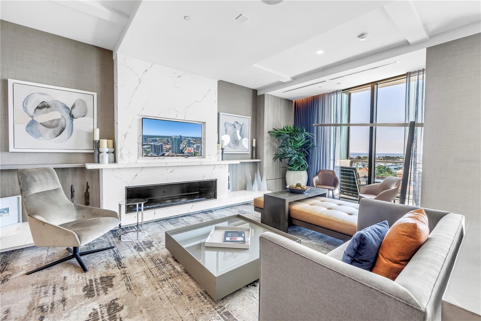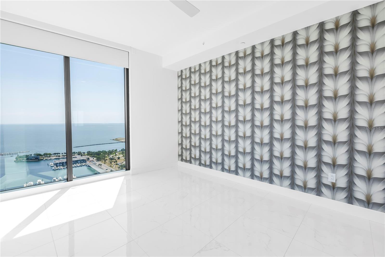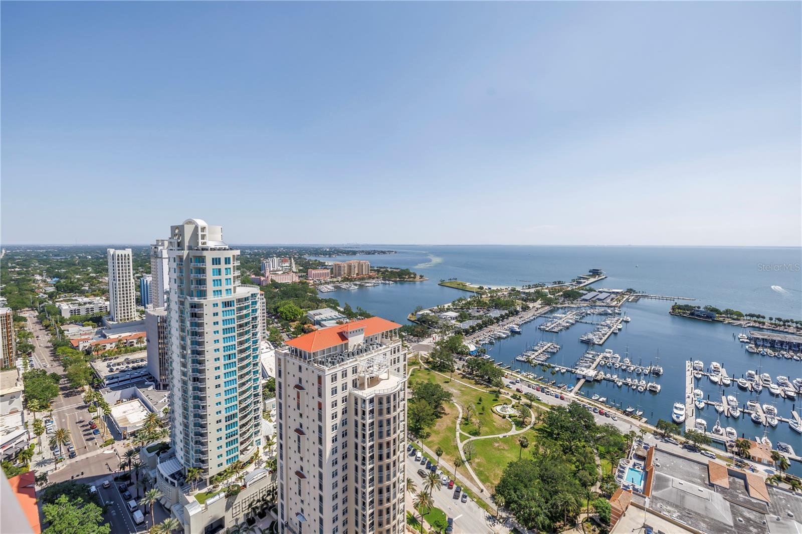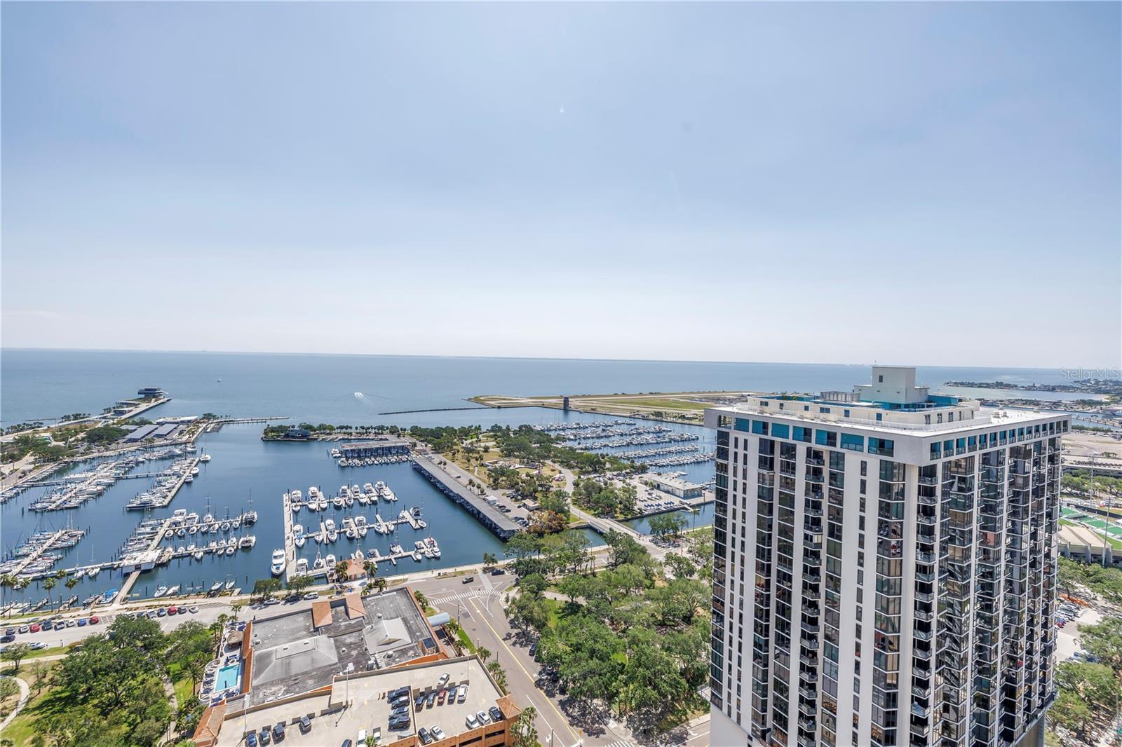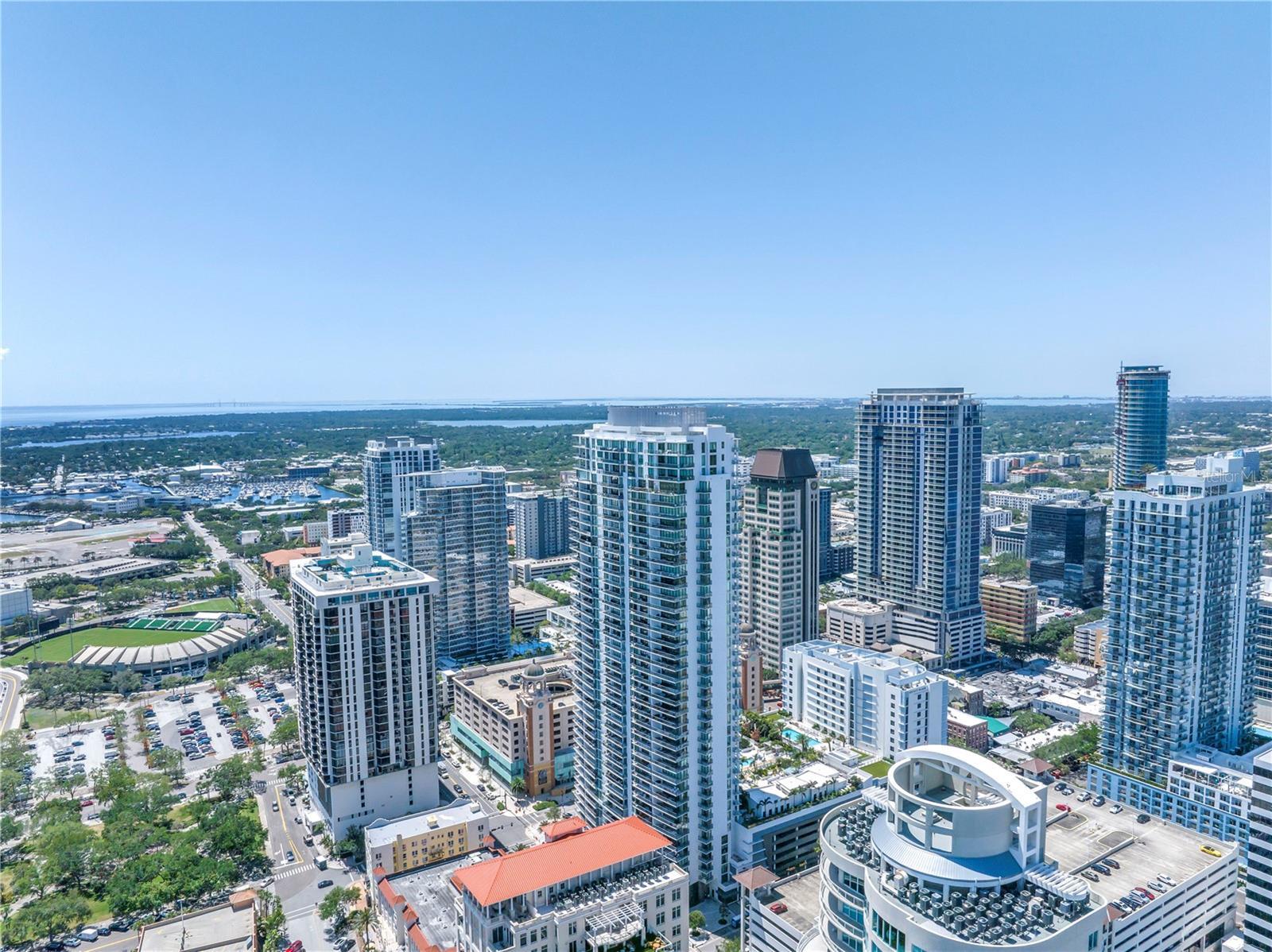Step into a world of luxury the moment you open the door to this stunning 31st-floor residence. Immediately, your eyes are drawn across the spacious great room to the floor-to-ceiling sliding glass doors, framing sweeping panoramic views of Tampa Bay, downtown St. Pete and Albert Whitted Airport. This unit truly boasts one of the best views of any unit in Downtown St. Petersburg. Designed for both relaxation and entertaining, this 2-bedroom, 2.5-bath condo features a large multipurpose den, soaring 10-foot ceilings and an open-concept layout that flows effortlessly from space to space. The chef’s kitchen is a true showpiece, complete with high-end stainless steel appliances, flat-surface cooktop with hood, double built-in ovens, an oversized center island, and ample custom cabinetry; all finished with elegant European touches and quartz countertops. Just off the dining area, tucked quietly away, you’ll find the den. Perfect for a home office or reading nook, along with its own stylish half bath. The serene primary suite offers a private sanctuary, boasting floor-to-ceiling windows with one-touch electric shades, a large walk-in closet and a luxurious ensuite bath. The split-bedroom layout ensures privacy, with the guest suite positioned on the opposite side of the residence. Guests will enjoy their own spa-inspired bathroom and access to the expansive balcony through sliding glass doors. The oversized balcony is ideal for sipping your morning coffee as the sun rises or watching sailboats drift by and planes glide into Albert Whitted. Additional upgrades include rich 24”x24” Nuvo Calacatta Gris porcelain tile throughout, quiet electric blinds, two assigned garage parking spaces with electric car charger and a climate-controlled storage unit. Resort-style living continues on the impressive 7th-floor amenity deck. Enjoy a 75-foot lap pool, private cabanas, hot tub, multiple grilling areas, and an outdoor kitchen. Stay active in the 5,000 sq ft state-of-the-art fitness center or unwind in the club room overlooking the bay. Multiple lounges, co-working spaces, a game room, and concierge service complete the elevated lifestyle at ONE. Located in the heart of downtown St. Pete with incredible walkability, you’re just steps away from fine dining, boutique shopping, museums, galleries, theaters, the Pier, and endless entertainment. This is more than a residence, it's a lifestyle. Welcome home to ONE St. Petersburg!