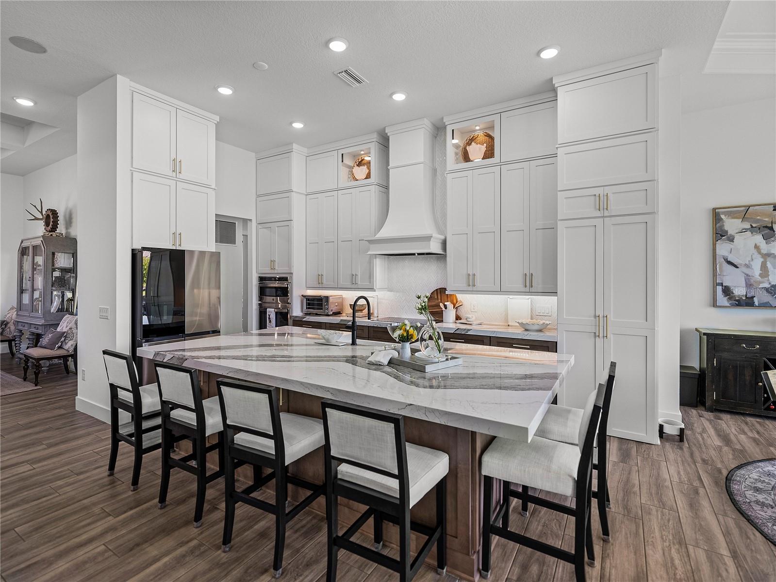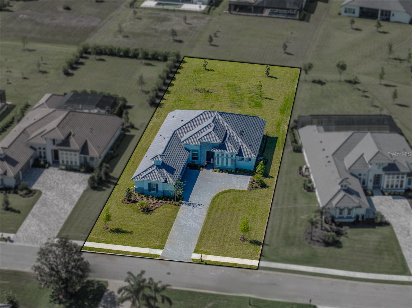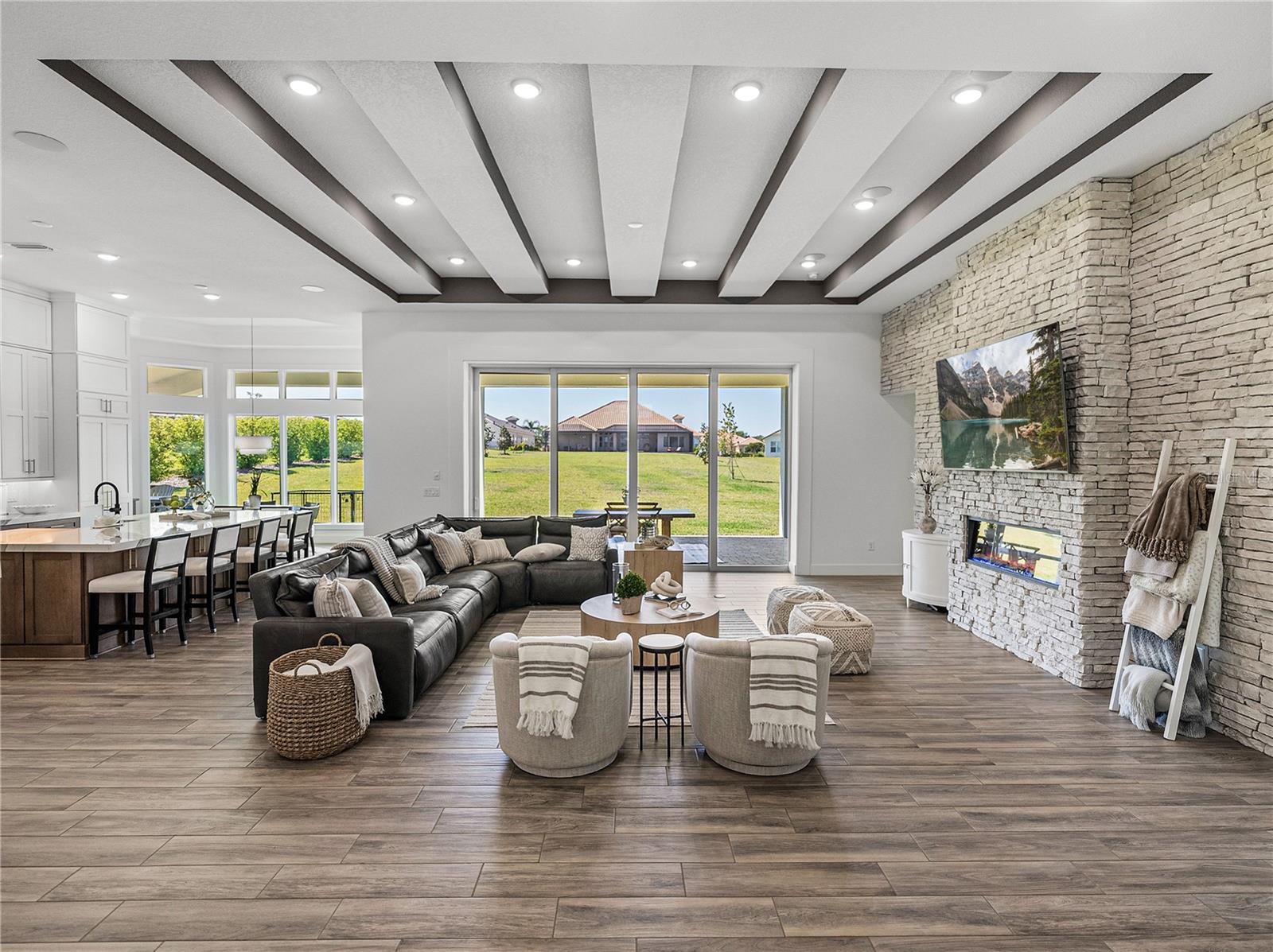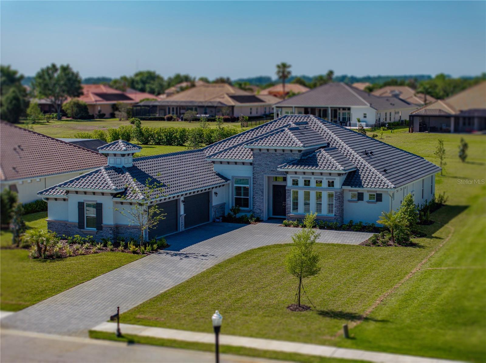 SELLER IS OFFERING UP TO $5,000. towards your LJ Golf Membership, or HOA Fees, or Closing Costs! Exquisite, elegant, and extraordinary, this stunning 2024-built luxury home in the desirable, gated community of Lake Jovita offers the ultimate Florida lifestyle. Perfectly positioned on nearly 3/4 of an acre, the striking exterior makes a lasting impression with manicured landscaping, stone accents, a long paver driveway with extended parking, and an oversized 4-car garage with sealed epoxy floors. A covered double-door entry welcomes you into the grand foyer, where the breathtaking interior unfolds. Soaring 12’ decorative ceilings accent nearly every room, including the foyer, dining, den, living room, kitchen nook, primary suite, and back porch- while long plank tile flooring, dark greige solid-core (6) interior doors, and plantation shutters throughout elevate the aesthetic. The expansive open floor plan is enhanced by prewired TV and internet stations in each room to keep cords hidden and the look seamless. The living room takes center stage, anchored by a statement electric fireplace set against a floor-to-ceiling stone feature wall, flanked by two well-placed floor outlets for flexible furniture placement. The kitchen is nothing short of spectacular, designed to inspire culinary works of art, with thick quartz countertops, an extended island offering wraparound seating for six, a separate ice maker, and glass display cabinets with dimmable lighting framing the beautifully elongated custom hood. Additional luxuries include under-cabinet lighting, pull-out shelving in all lower cabinets, and a hidden walk-in pantry with wooden shelves and outlets for small appliances. An elegant dining room with a tray ceiling offers seamless views of the living space- ideal for entertaining. Nearby, a dedicated office pairs beautifully with a conveniently located half bathroom upgraded with cabinetry, perfect for today’s work-from-home lifestyle. The primary suite is a private retreat with expansive sleeping quarters, two built-out walk-in closets with shelving, drawers, and charging outlets, and two recessed lights over the bed with dimmable switches at each nightstand. The ensuite bathroom is spa-inspired, with gorgeous tiled walls, a serene soaking tub, a custom walk-in shower, dual vanities with vessel sinks and stylish cabinetry, and built-in linen storage. Two guest bedrooms are thoughtfully located on the opposite side of the home, each with a walk-in closet and full ensuite bathroom. One guest bath includes an upgraded layout with an exterior door- perfect for a future pool bath. A full cabinet suite in the laundry room includes quartz countertops, a sink, a shelf over the washer/dryer with valet rods, and sliding shelves in all lower cabinets. An additional laundry sink in the garage and a second washer/dryer hookup add versatility. Other thoughtful touches include prewiring for patio ceiling fans, soffit outlets for Christmas lights, and enhanced recessed lighting throughout. Authentic Florida living awaits outdoors, where a covered porch- already plumbed for a summer kitchen- overlooks the expansive backyard, offering the ideal space to relax or entertain. Beyond the property, Lake Jovita provides an unparalleled lifestyle with two championship golf courses, a resort-style clubhouse, tennis and pickleball courts, dog parks, a fitness center, a one-third-mile walking and running loop with exercise stations, and more.