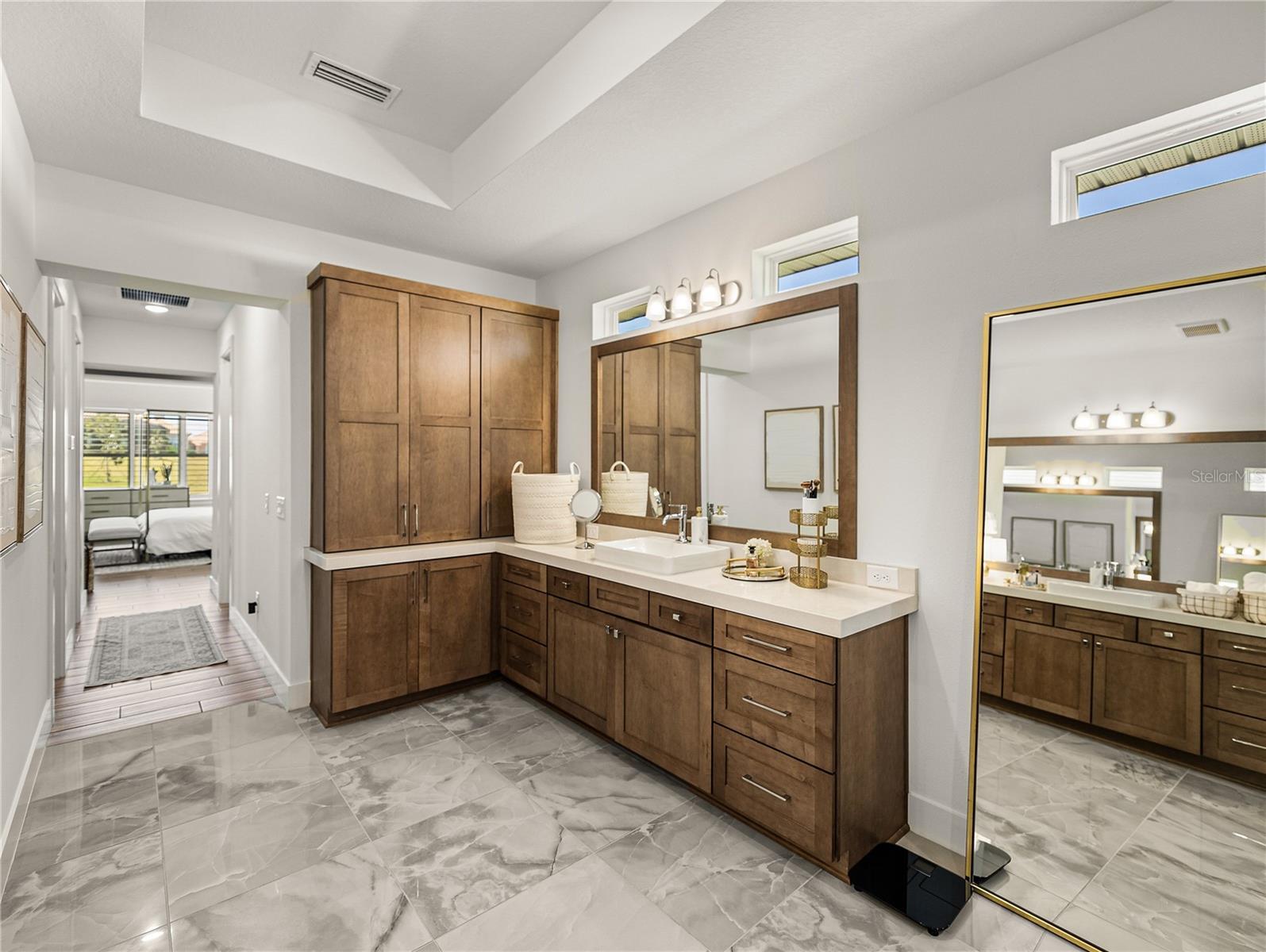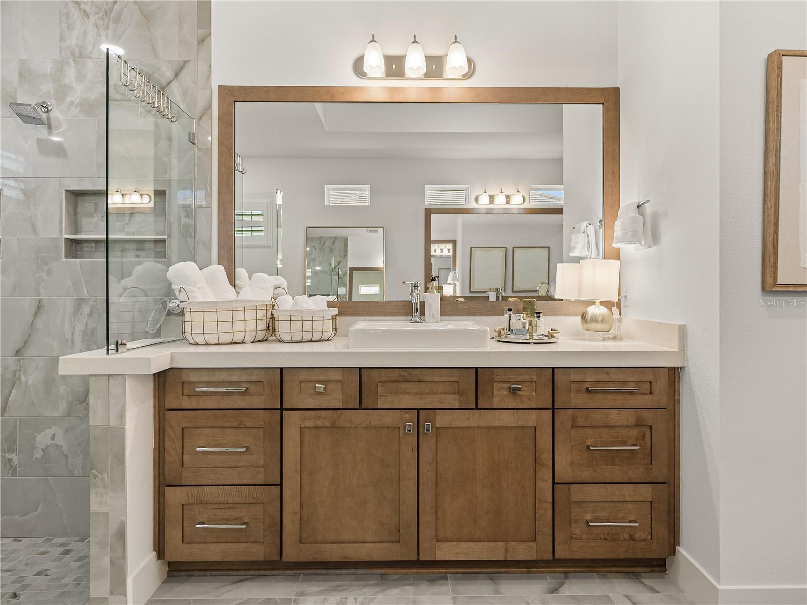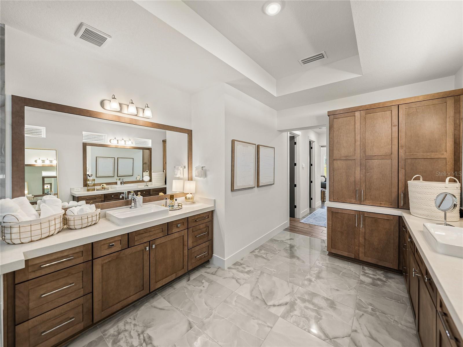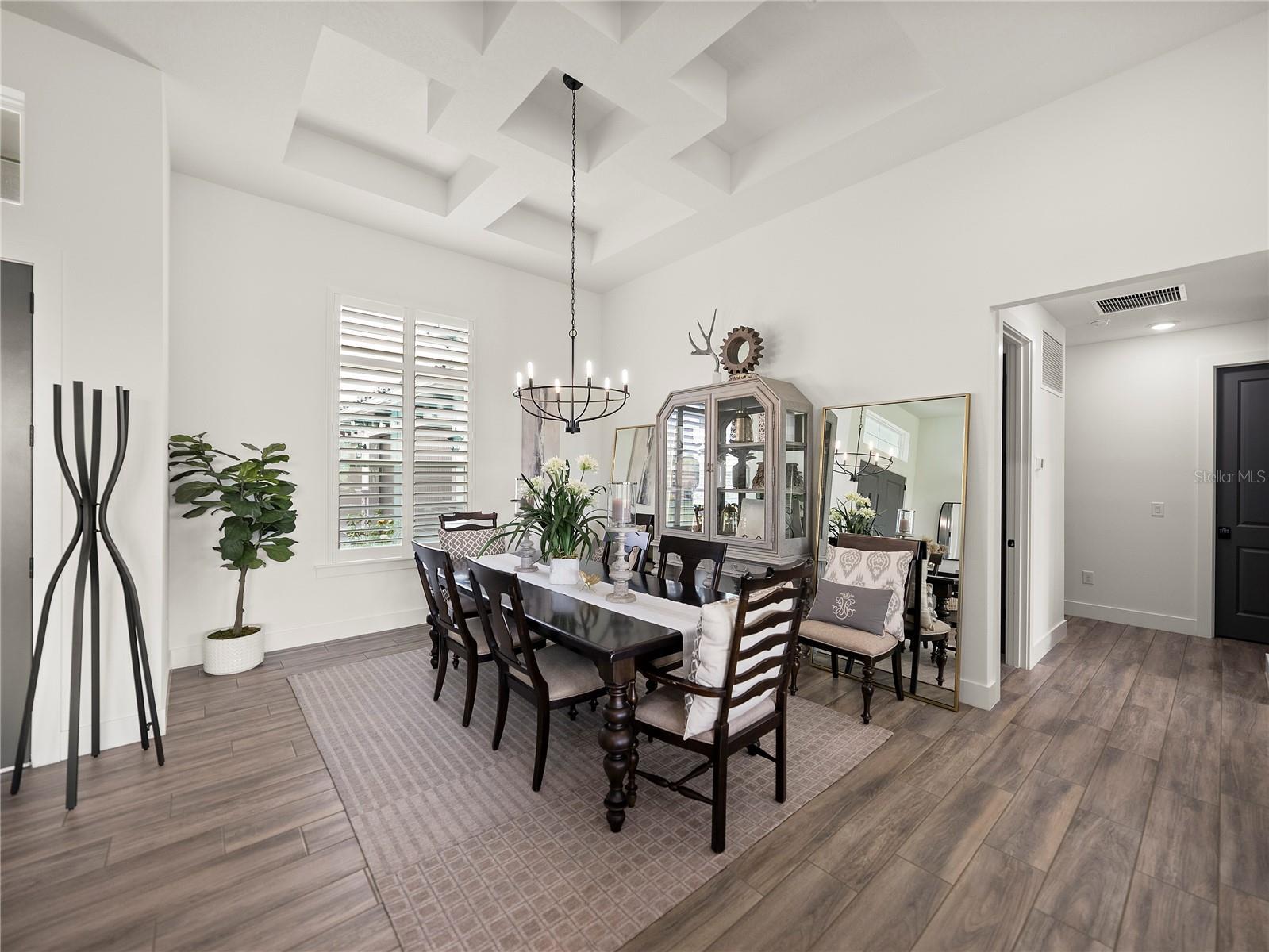 SELLER IS OFFERING UP TO $5,000. towards your LJ Golf Membership, or HOA Fees, or Closing Costs! Exquisite, elegant, and extraordinary, this stunning 2024-built luxury home in the desirable, gated community of Lake Jovita offers the ultimate Florida lifestyle. Perfectly positioned on nearly 3/4 of an acre, the striking exterior makes a lasting impression with manicured landscaping, stone accents, a long paver driveway with extended parking, and an oversized 4-car garage with sealed epoxy floors. A covered double-door entry welcomes you into the grand foyer, where the breathtaking interior unfolds. Soaring 12’ decorative ceilings accent nearly every room, including the foyer, dining, den, living room, kitchen nook, primary suite, and back porch- while long plank tile flooring, dark greige solid-core (6) interior doors, and plantation shutters throughout elevate the aesthetic. The expansive open floor plan is enhanced by prewired TV and internet stations in each room to keep cords hidden and the look seamless. The living room takes center stage, anchored by a statement electric fireplace set against a floor-to-ceiling stone feature wall, flanked by two well-placed floor outlets for flexible furniture placement. The kitchen is nothing short of spectacular, designed to inspire culinary works of art, with thick quartz countertops, an extended island offering wraparound seating for six, a separate ice maker, and glass display cabinets with dimmable lighting framing the beautifully elongated custom hood. Additional luxuries include under-cabinet lighting, pull-out shelving in all lower cabinets, and a hidden walk-in pantry with wooden shelves and outlets for small appliances. An elegant dining room with a tray ceiling offers seamless views of the living space- ideal for entertaining. Nearby, a dedicated office pairs beautifully with a conveniently located half bathroom upgraded with cabinetry, perfect for today’s work-from-home lifestyle. The primary suite is a private retreat with expansive sleeping quarters, two built-out walk-in closets with shelving, drawers, and charging outlets, and two recessed lights over the bed with dimmable switches at each nightstand. The ensuite bathroom is spa-inspired, with gorgeous tiled walls, a serene soaking tub, a custom walk-in shower, dual vanities with vessel sinks and stylish cabinetry, and built-in linen storage. Two guest bedrooms are thoughtfully located on the opposite side of the home, each with a walk-in closet and full ensuite bathroom. One guest bath includes an upgraded layout with an exterior door- perfect for a future pool bath. A full cabinet suite in the laundry room includes quartz countertops, a sink, a shelf over the washer/dryer with valet rods, and sliding shelves in all lower cabinets. An additional laundry sink in the garage and a second washer/dryer hookup add versatility. Other thoughtful touches include prewiring for patio ceiling fans, soffit outlets for Christmas lights, and enhanced recessed lighting throughout. Authentic Florida living awaits outdoors, where a covered porch- already plumbed for a summer kitchen- overlooks the expansive backyard, offering the ideal space to relax or entertain. Beyond the property, Lake Jovita provides an unparalleled lifestyle with two championship golf courses, a resort-style clubhouse, tennis and pickleball courts, dog parks, a fitness center, a one-third-mile walking and running loop with exercise stations, and more.