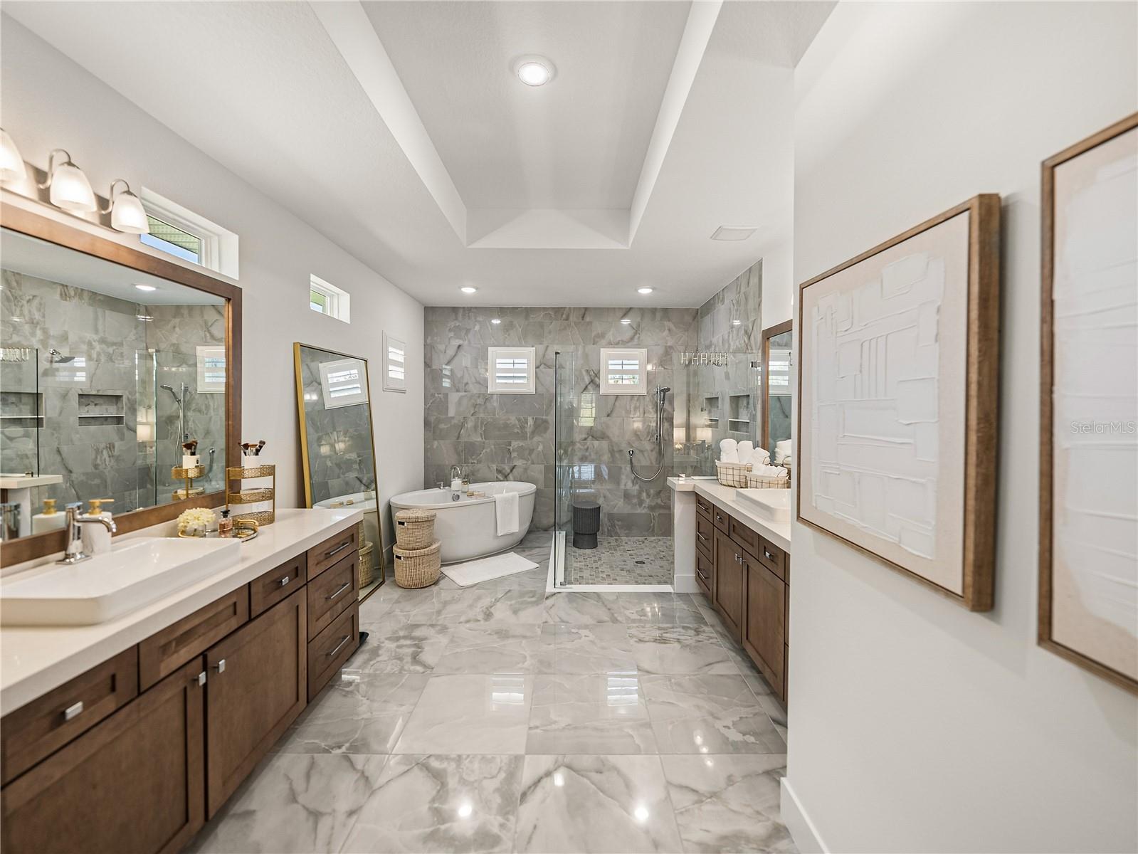 - Ceiling Fans(s), Crown Molding, Eat-in Kitchen, High Ceilings, Living Room/Dining Room Combo, Open Floorplan, Primary Bedroom Main Floor, Solid Wood Cabinets, Split Bedroom, Stone Counters, Tray Ceiling(s), Walk-In Closet(s)