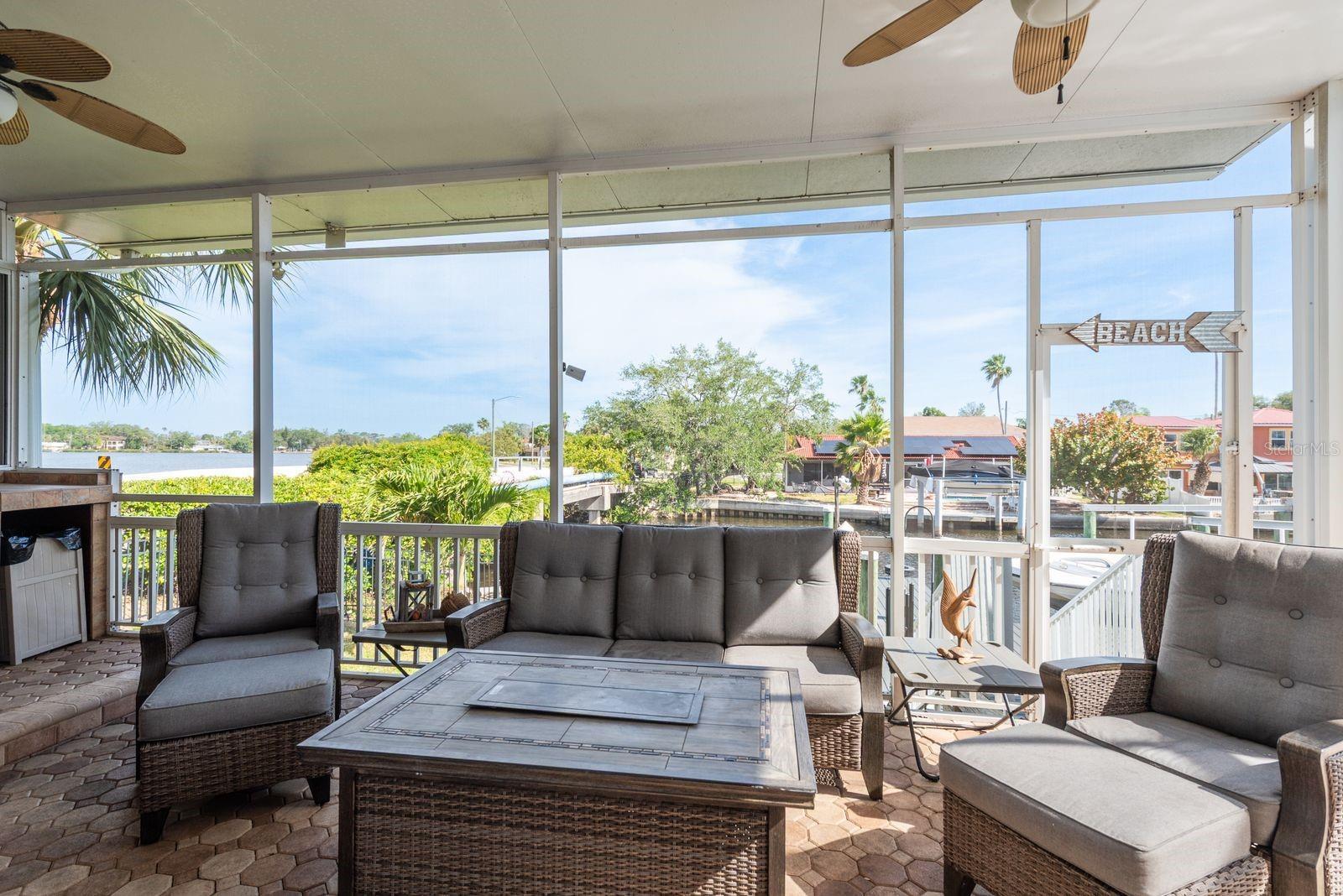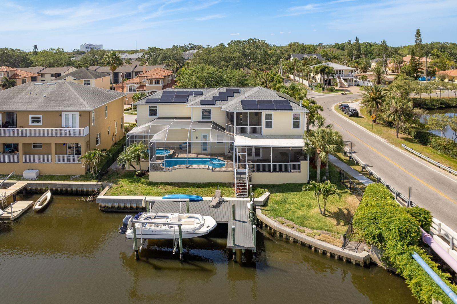 Welcome to your dream waterfront home nestled in beautiful Tarpon Springs. This coastal-inspired residence offers 3,154 square feet of thoughtfully designed living space with 4 bedrooms, 4 bathrooms, and a versatile study that could serve as a 5th bedroom. Enjoy breathtaking cross waterfront views of the Bayou and saltwater canal from nearly every room. The light-filled interior features plantation shutters, creating a bright, airy atmosphere with undeniable coastal charm. The gourmet kitchen is a chef's delight with rich wood cabinets, gleaming granite counters, and stainless steel appliances. A convenient serving/coffee bar adds functionality and elegance to the space. Plus an inviting living room with gas fireplace, spacious dining room, foyer, interior laundry room plus pool bathroom. Retreat to the elegant primary bedroom featuring its own gas fireplace and luxurious private bathroom with garden tub, separate shower, and dual vanities. A second bedroom with private bath provides perfect accommodations for guests or family members desiring their own sanctuary. Additional bedrooms are generous in size. Outdoor living reaches new heights with a screen-enclosed pool and spa, plus a spacious screen enclosed lanai featuring a complete outdoor kitchen—ideal for entertaining while enjoying spectacular water views. All you need is your boat to enjoy the oversized dock which includes water and electric hookups, a 10,000 lbs. boat lift, and a new concrete seawall cap. Offering a short ride to the Gulf waters. Recent upgrades include solar panels (2021) and a new roof (2021), combining style with energy efficiency. The second-floor screen-enclosed lanai with built-in gas fireplace offers another stunning vantage point for enjoying those tranquil water views. Outdoor activities are unlimited as there is something for everyone, whether you enjoy wandering through the quaint fishing village of nearby Tarpon Springs "The Sponge Docks" or savoring eclectic eateries, browsing charming shops, strolling the beaches of Fred Howard Park /Sunset Beach or venturing out on the water for fishing or a sunset cruise. Tarpon Springs is within easy proximity to Tampa International Airport and is located within the Tampa Bay area! Do not miss viewing the home!