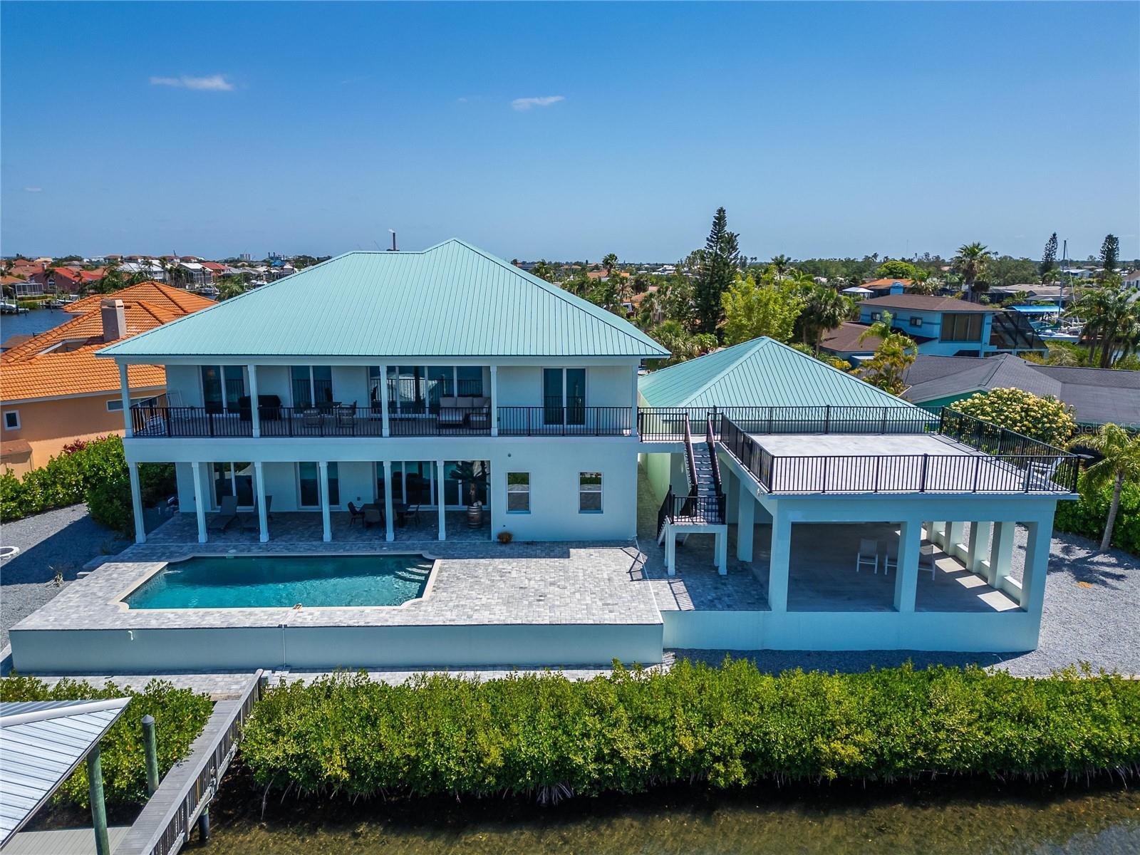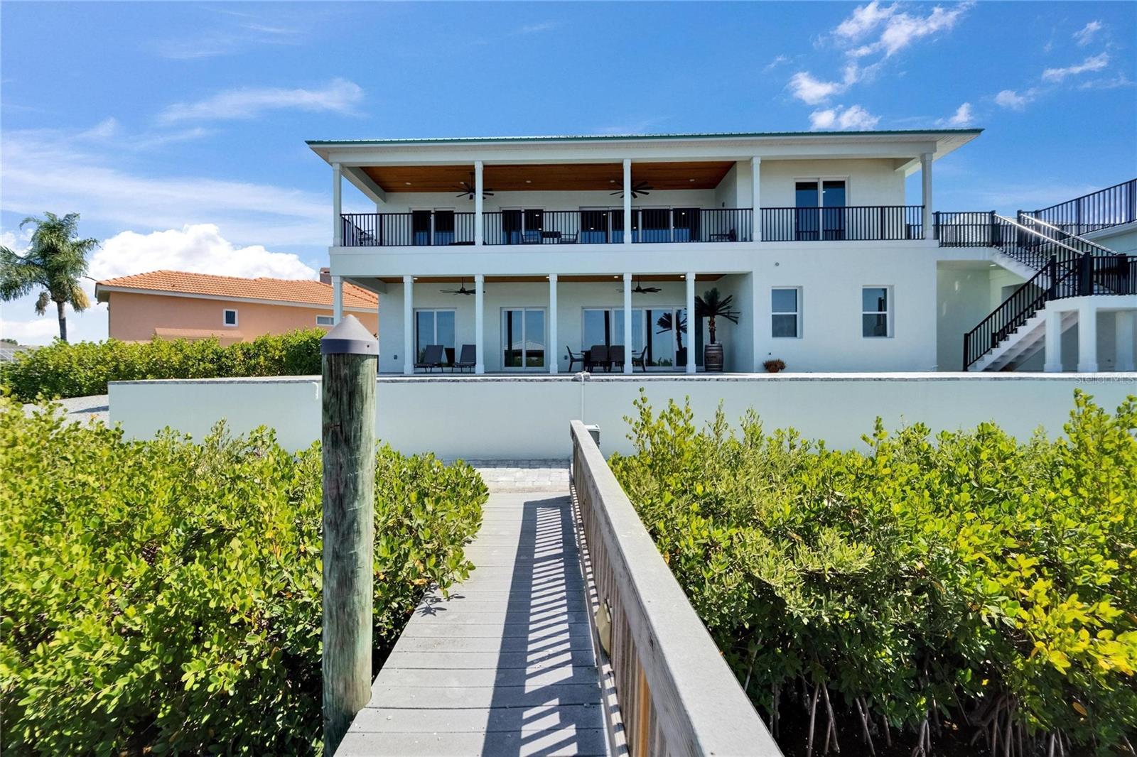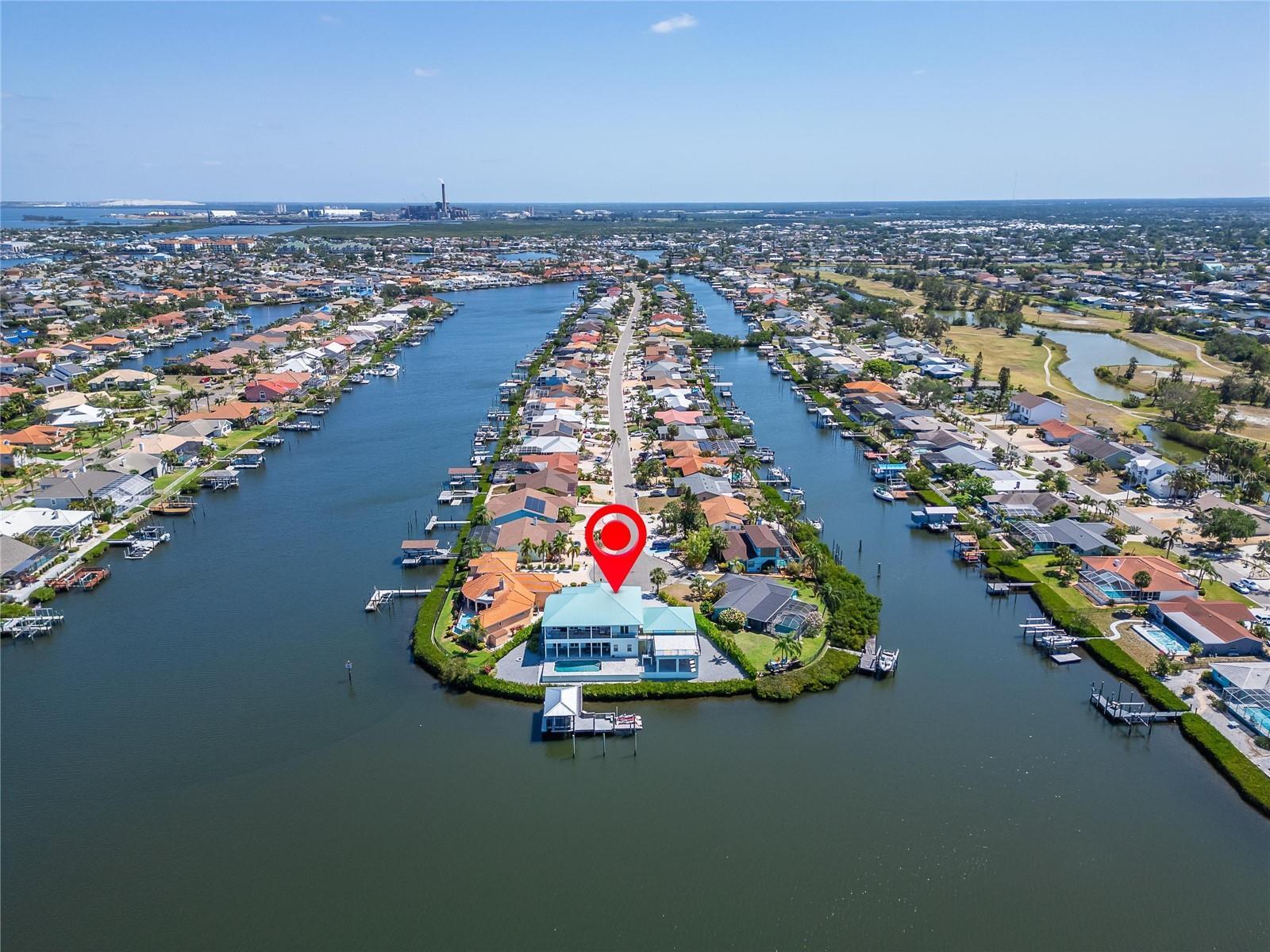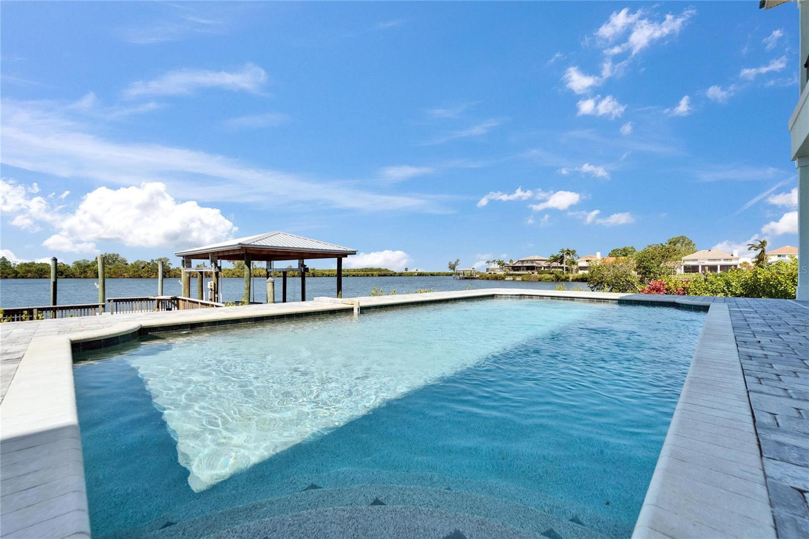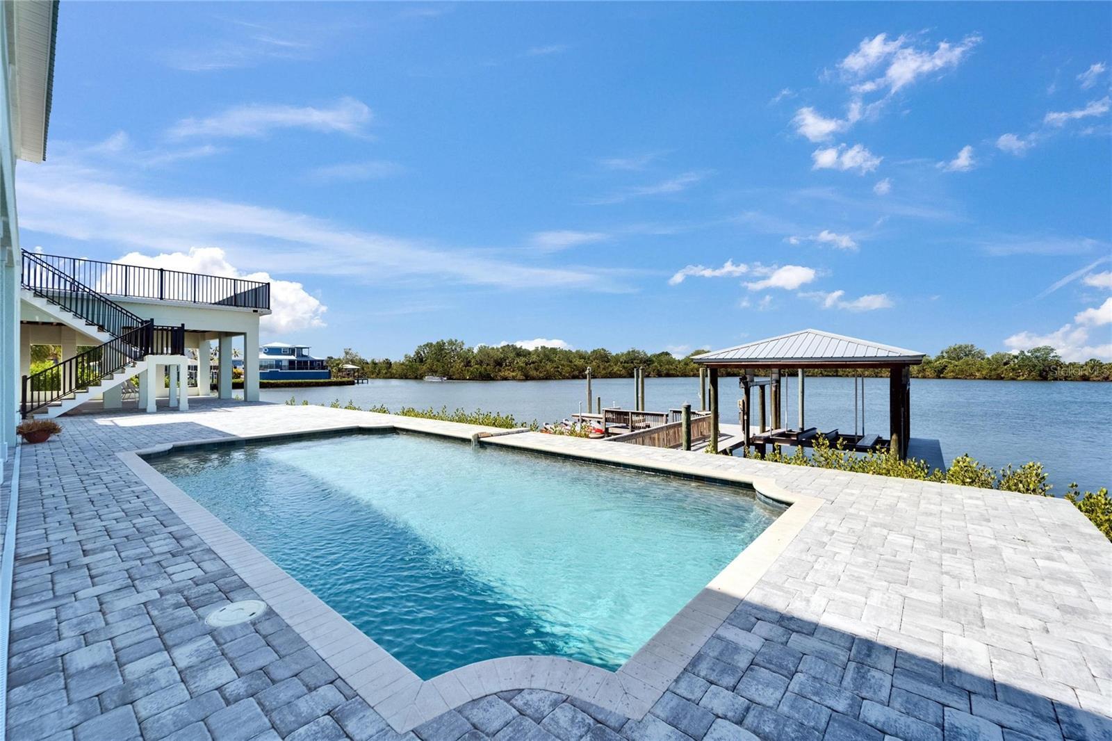 935 Chipaway Drive in Apollo Beach is a true one-of-a-kind waterfront gem. This 2023 custom-built home sits at the very end of a quiet cul-de-sac with 133 feet of shoreline and incredible direct views of Tampa Bay and the St. Pete skyline. It faces west, giving you the best sunset views around. The location is unbeatable and very rare, sitting at the widest part of any canal in Apollo Beach with open water right out your back door. Manatees, dolphins, and stingrays are regular visitors. The home offers 4,704 square feet of living space, plus an additional 934 square feet of heated and cooled garage space, all under one roof. As you step through the double front doors, you are greeted with wide-open water views of the canal and Tampa Bay beyond from almost every room. There is no carpet anywhere — just strong, durable luxury vinyl plank floors. The main living area is bright and open, with a spacious kitchen featuring upgraded appliances, pull-out drawers, lots of storage, and a large waterfall quartz island with seating for four. The layout includes three bedrooms on the main living floor, each with its own private bath, plus a full office that could easily become a fourth bedroom. The primary bedroom has water views, a walk-in closet with built-in storage, dual sinks, and a glass walk-in shower. Downstairs, there is another bedroom with a full bath, perfect for an in-law suite or extra living space. The first level is a blank canvas ready for your creativity — tall ceilings, a private entrance, and about 2,800 additional square feet of potential. Build out another living unit, add a game room, media room, gym, or more bedrooms — the options are endless. This space also offers breathtaking views of the deep, wide canal and the mangroves across the water. The heated and cooled garages are oversized with tall ceilings and epoxy floors, easily fitting up to six vehicles, boats, RVs, or work trucks. Outside, you’ll find two huge covered outdoor areas next to the fully renovated saltwater pool — the perfect spot for a future outdoor kitchen or Florida room. Two oversized balconies, one covered and one open, give you even more space to relax and enjoy the sunsets and water views. The brand-new dock, built in 2023, includes a 16,000-pound lift, a floating dock, and open dock space for a yacht or sailboat. The home is built strong with, a metal roof, hurricane-rated windows and doors, and sits at a high elevation with no storm damage from recent hurricanes. There’s no HOA or CDD, and short-term rentals are allowed, making this a perfect full-time home, second home, or investment opportunity.
