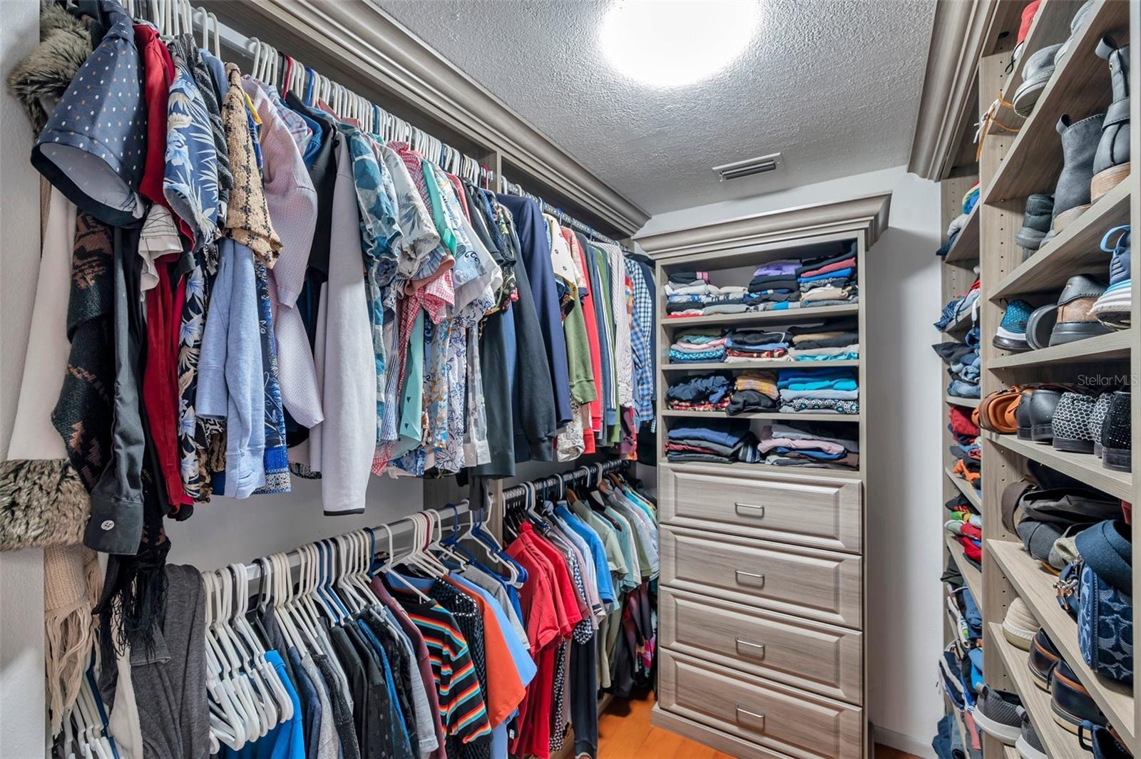 - Solid Wood Cabinets, Window Treatments, Ceiling Fans(s), Crown Molding, Eat-in Kitchen, High Ceilings, Living Room/Dining Room Combo, Primary Bedroom Main Floor, Open Floorplan, Split Bedroom, Stone Counters, Walk-In Closet(s)