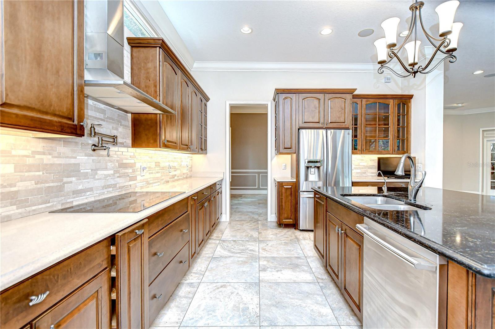 Welcome to Arbor Reserve Estates—a prestigious gated community in the heart of Valrico, featuring just 33 custom homes. This exceptional 4,500 sq ft residence was thoughtfully designed with flexibility and entertaining in mind. From the moment you arrive, the impressive curb appeal sets the tone, with stacked stone accents, tropical landscaping, and a travertine walkway that welcomes you home. Inside, you’ll find a private home office adorned with elegant wall molding, a formal dining room, and a sprawling great room featuring French door sliders to the lanai and an integrated built-in speaker system, perfect for seamless entertaining. Custom plantation shutters and tasteful upgrades are found throughout the entire home, adding luxury and attention to detail at every turn. The chef’s kitchen is a true showstopper—equipped with built-in appliances, including a wall oven, convection microwave, warming drawer, pot filler, and a large center island with bar seating—offering ample prep and storage space. A standout feature of this home is the versatile in-law wing, complete with a private entrance, spacious bedroom, full bath, personal living room with lanai access, and a bonus room with a wet bar—ideal for guests, multigenerational living, or even a private retreat. A convenient half bath is also located downstairs for visiting guests. Upstairs, take the elevator or stairs to find a large loft with a second wet bar connecting the additional bedrooms. The primary suite is a luxurious haven, featuring a tray ceiling, oversized closet ready for a custom build-out, and a spa-like en-suite with a soaking tub, separate shower, and dual vanities. Two additional upstairs bedrooms share a full bath, and for added convenience, there’s a large laundry room upstairs and an additional laundry closet downstairs. Elegant porcelain tile and wood flooring flow throughout the main level, enhancing the home’s warm and sophisticated atmosphere. Step outside to your private oasis—beautiful travertine surrounds a pool within an expansive screened lanai. With only one neighbor and a serene pond next door, this home offers both privacy and a peaceful connection to nature. A three-car garage with built-in storage shelves adds functionality, while the home’s location is second to none—close to top-rated schools, medical facilities, restaurants, shopping, and with easy access to Tampa, Orlando, and Florida’s beautiful beaches. This extraordinary home combines luxury, comfort, and thoughtful design—a true gem in Arbor Reserve Estates.