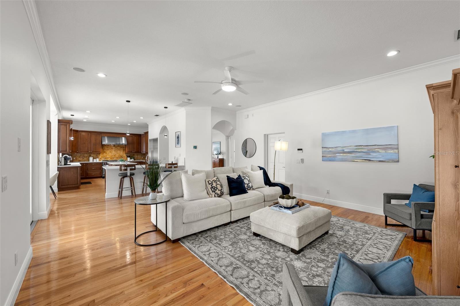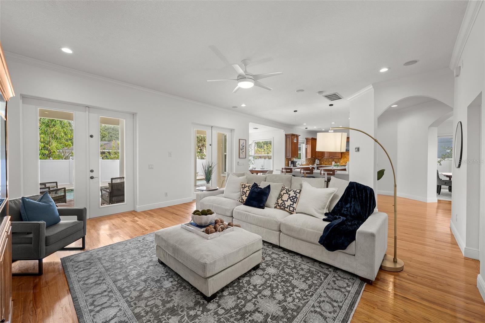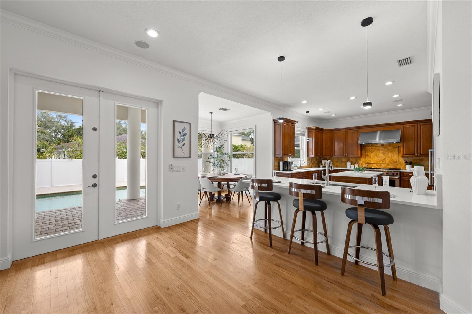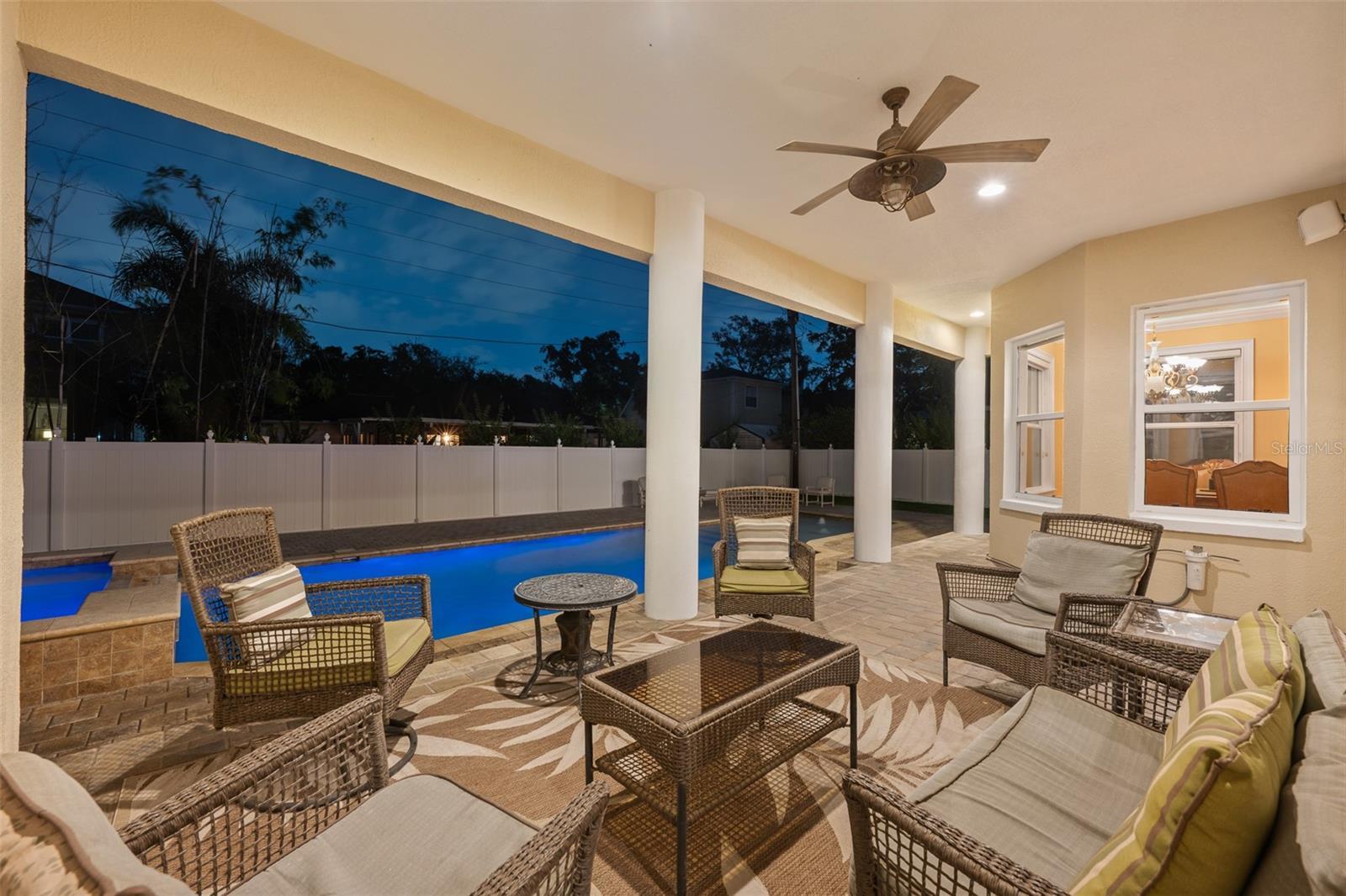 This elegant 5-bedroom, 4.5-bath residence in South Tampa's exclusive Sunset Park offers significant updates that include a 2018 roof and 2025 HVAC air ducts, fresh paint, new countertops, new fixtures, new sconces, and much more ensuring modern comfort and peace of mind. Upon entry, a two-story, pillar-framed entrance reveals a grand foyer featuring 22-foot ceilings, a 30-light motorized chandelier, and arched window. The gourmet kitchen, fully customized in 2016, is equipped with a 4-foot Wolf gas range, Thermador refrigerator, granite island, and a window-lined breakfast nook with abundant natural light and pool views. A wet bar, complete with a wine refrigerator and R/O system, complements the sophisticated living room, which features French doors opening to the lanai. The formal dining room is appointed with crown molding and built-in speakers, while the family room offers a gas fireplace, cathedral ceilings, and a sizable arched window. Outdoor amenities include a covered lanai with recessed lighting and a ceiling fan, leading to the saltwater pool with a zero-entry tanning ledge and a raised hot tub. The expansive primary suite features a double-door entry, slanted tray ceilings, transom windows, and a large walk-in closet with adjustable built-ins. Its en-suite bathroom includes a jetted soaking tub, a spacious glass walk-in shower, and dual granite vanities with ample storage. Two guest bedrooms share a Jack and Jill bath, and a fourth guest bedroom includes a built-in closet and large window. The media room, accessible via a double-door entrance, features a granite wet bar, providing an ideal space for entertainment. An upstairs laundry room with a utility sink enhances convenience. Further notable features include hardwood floors, crown molding, white vinyl fencing with double gates, a three-zoned HVAC system, and two gas water heaters. Located on a quiet, upscale street within the desirable Plant High School district, this home offers convenient access to parks, shopping, dining, community amenities, and major transportation routes. We invite you to schedule a private showing to experience this exceptional property.