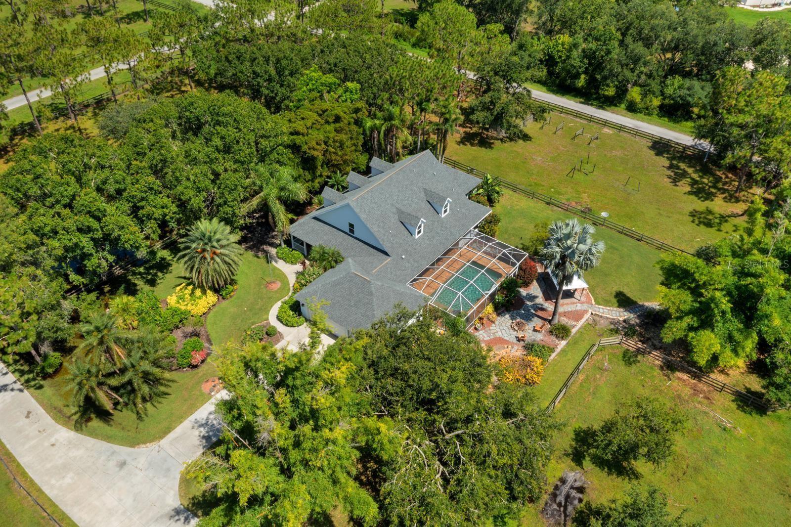 Experience luxury, privacy, and peace of mind in this stunning 5 bedroom 4 bathroom estate crafted by renowned builder Roland Yoder, set on over 9 wooded acres in Panther Ridge. Featuring 4,111 SF of living space, this custom home includes a remodeled kitchen with bamboo cabinets, granite counters, and stainless appliances, a luxurious first-floor primary suite, oak floors, and impact-rated doors/windows throughout. Recent upgrades ($300K+) include a new roof (30-yr warranty), HVAC, water heater, septic, pool pump, propane tanks, and more. Enjoy resort-style outdoor living with a heated pool/spa with travertine tiles, summer kitchen, travertine deck, fire pit, tiki hut, tropical gardens, and two massive outbuildings: a 6-stall concrete block barn with a metal roof and hurricane ties, as well as an oversized workshop. Plenty of space for the whole family and your four legged friends. Fully fenced with 4 pastures and access to 15 miles of trails, this rare property offers unmatched style, function, and storm resilience and is just minutes from Lakewood Ranch.