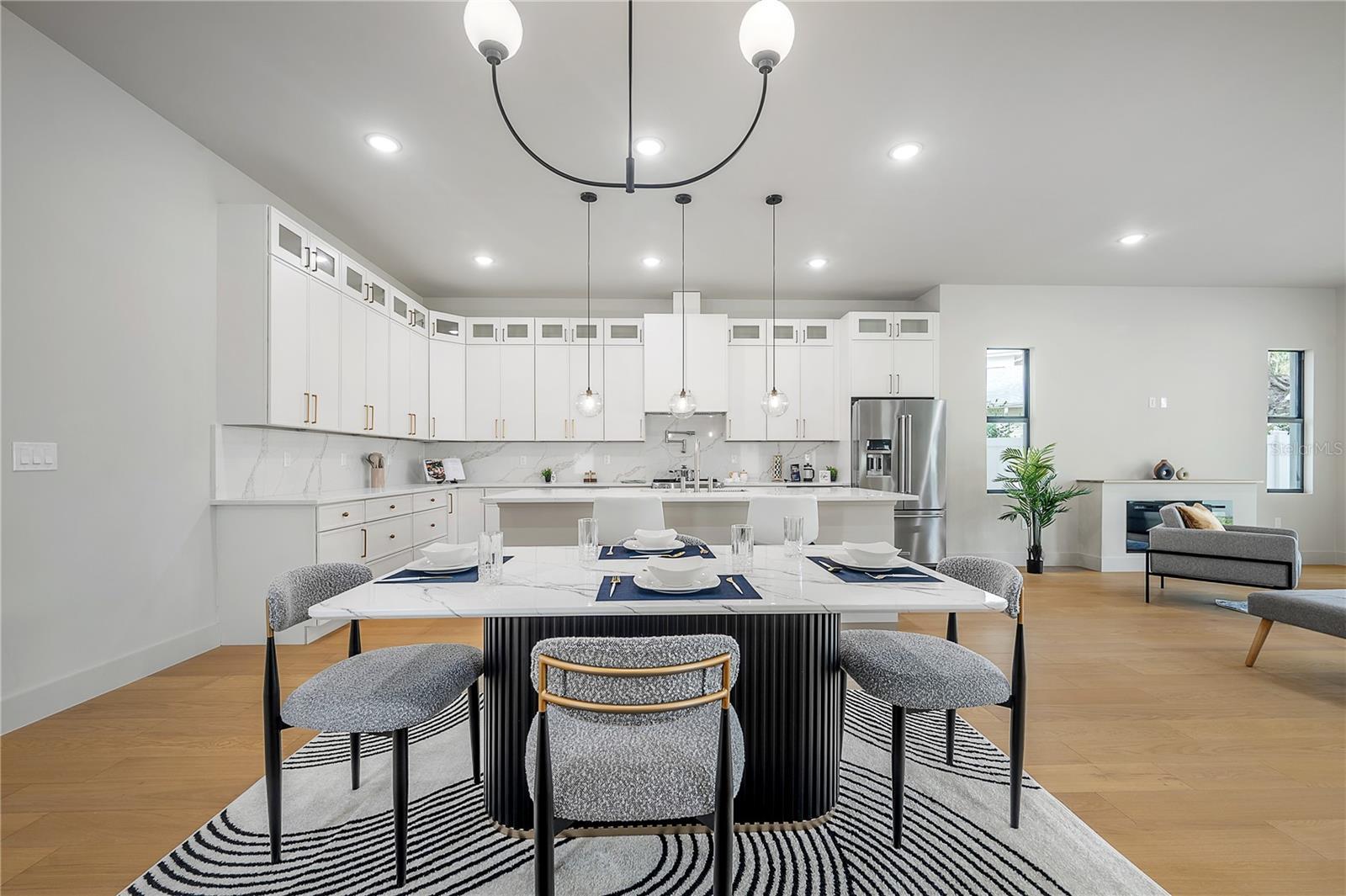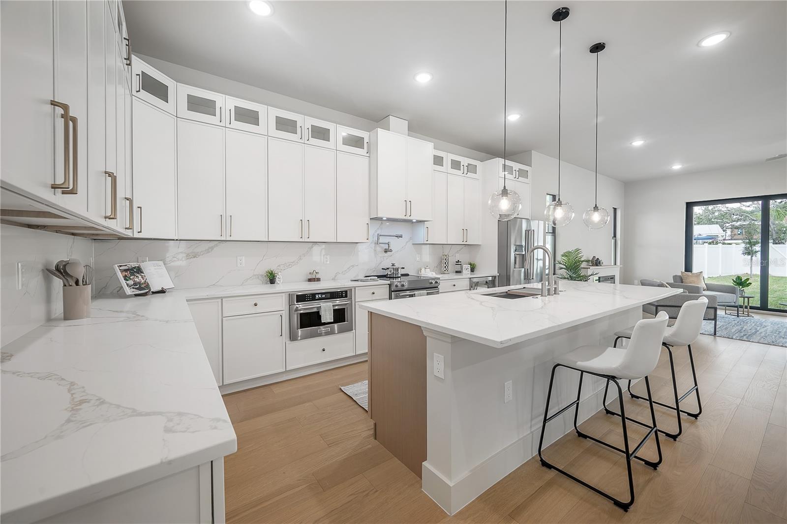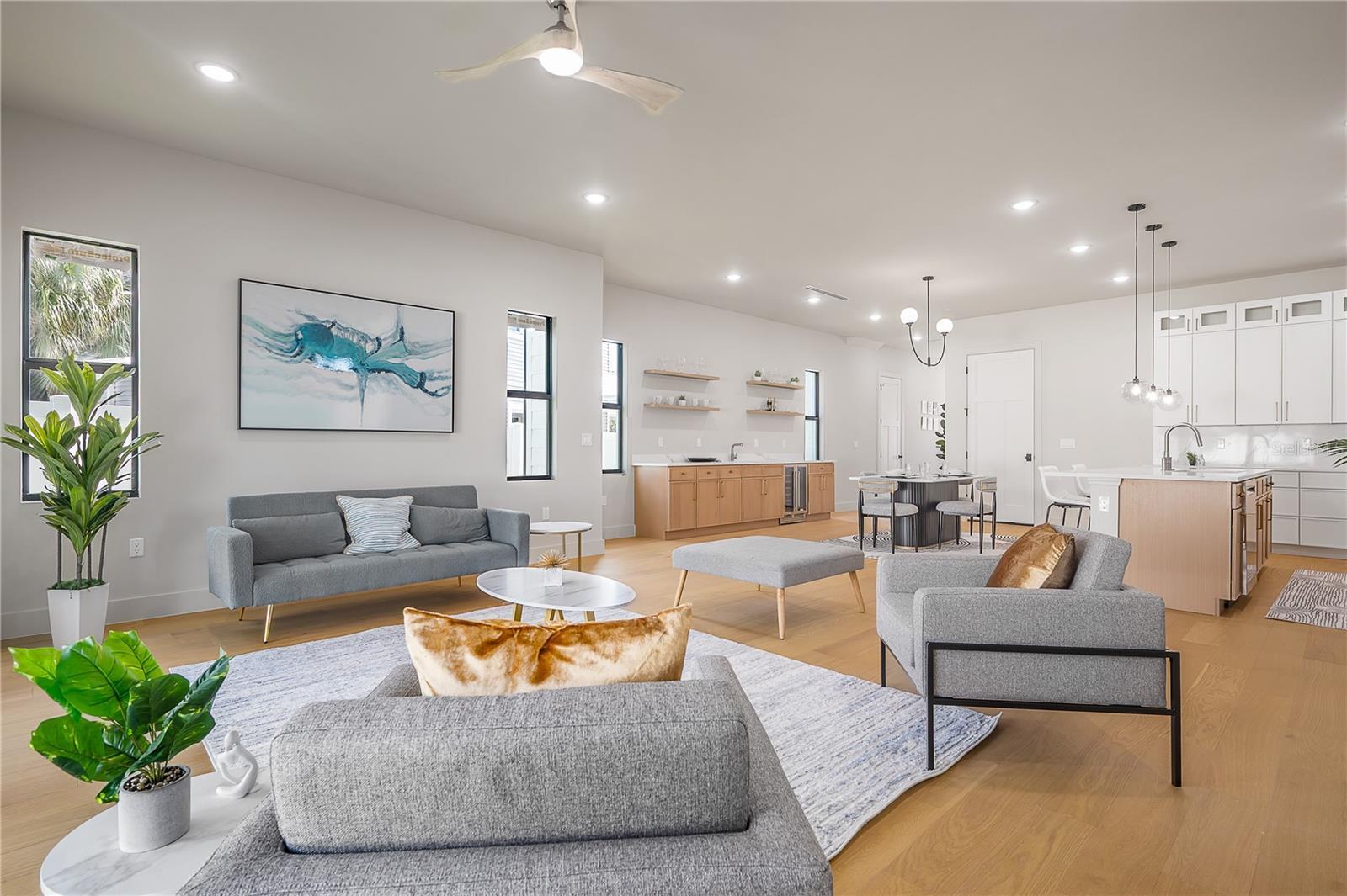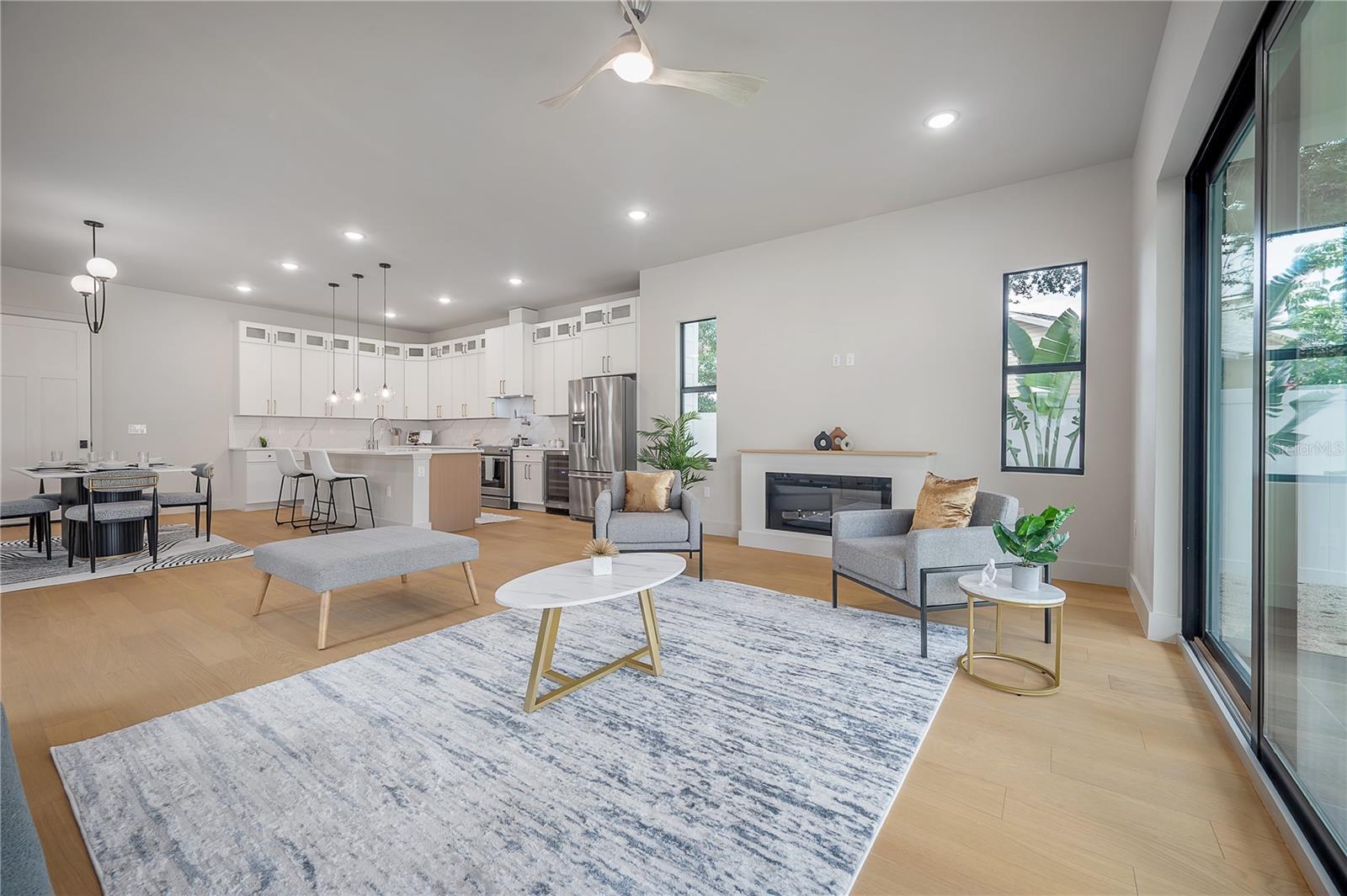 Step into your dream lifestyle with this stunning brand-new construction in the established neighborhood of Ridgewood Park. Just minutes from Downtown Tampa and walkable to Armature Works, this 5-bedroom, 4.5-bath modern masterpiece blends timeless Floridian charm with sleek, contemporary design. From the moment you arrive, the home’s curb appeal captivates with its chic exterior color palette, vibrant landscaping, and stylish balconies. Inside, soft natural light pours across engineered oak hardwood floors, enhancing a curated mix of Benjamin Moore designer hues that set an elegant, welcoming tone throughout. The open-concept main level is designed for both entertaining and daily living, featuring a spacious living area with a striking fireplace and a refined dining space complete with a built-in wet bar. At the heart of it all is a gourmet kitchen that will inspire your inner chef—showcasing custom cabinetry, premium hardware, a built-in beverage fridge, Calacatta Gold quartz countertops, and a massive island perfect for casual dining or weekend hosting. Upstairs, the second floor offers two bedrooms and a full guest bathroom, a full private guest suite, and the showstopping primary suite. This luxe retreat boasts a massive custom walk-in closet and a spa-like en suite with a dual-sink vanity and an enclosed wet room featuring a soaking tub—an everyday escape. Ascend to the third floor, and you’ll find a space made for unforgettable moments. A huge recreation room opens to an expansive rooftop deck with breathtaking views of downtown Tampa, ideal for hosting under the stars or enjoying quiet mornings in the sun. A large bedroom and full bathroom on this level create flexible living options, perfect for guests or multigenerational households. With a thoughtful layout that includes a top-floor laundry room, ample storage throughout, a covered patio, and a two-car garage—all tucked behind a white vinyl privacy fence—this home delivers on every detail. Live moments from Tampa’s best dining, shopping, and entertainment, with quick access to I-275 and top local schools. This is more than a home—it’s your opportunity to live exceptionally. Schedule your showing today!