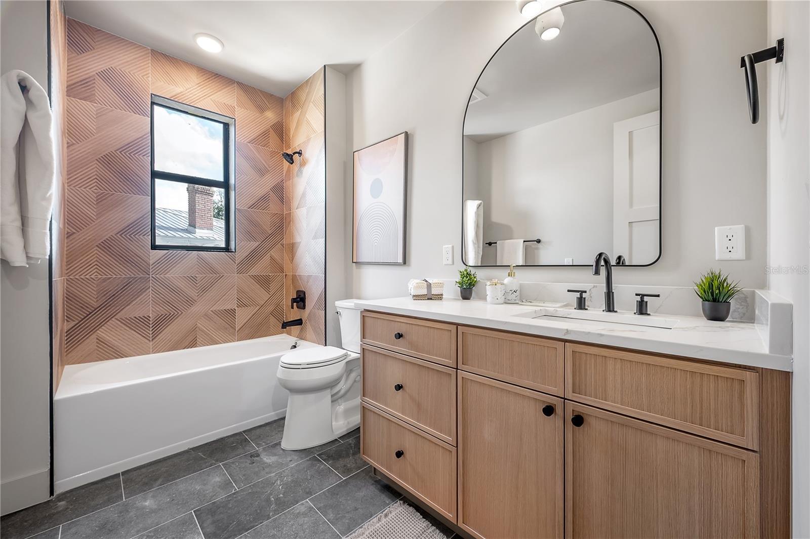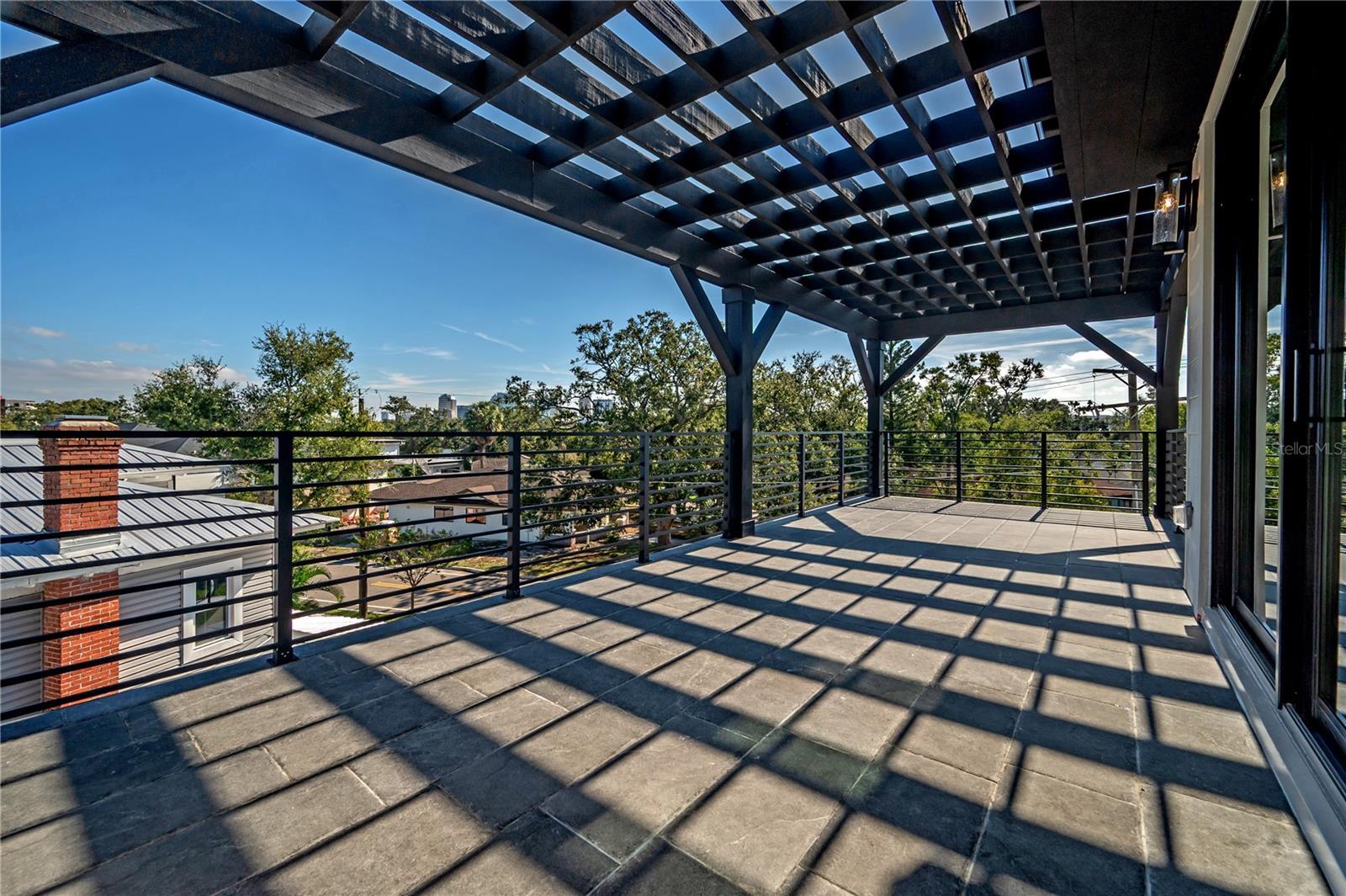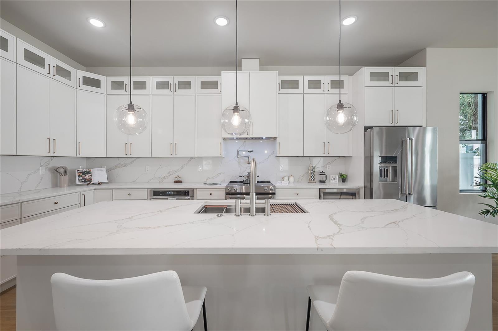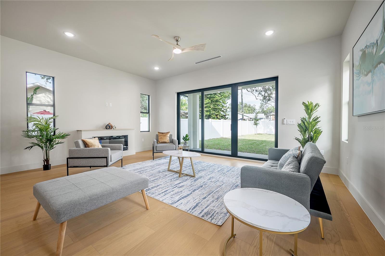 Step into your dream lifestyle with this stunning brand-new construction in the established neighborhood of Ridgewood Park. Just minutes from Downtown Tampa and walkable to Armature Works, this 5-bedroom, 4.5-bath modern masterpiece blends timeless Floridian charm with sleek, contemporary design. From the moment you arrive, the home’s curb appeal captivates with its chic exterior color palette, vibrant landscaping, and stylish balconies. Inside, soft natural light pours across engineered oak hardwood floors, enhancing a curated mix of Benjamin Moore designer hues that set an elegant, welcoming tone throughout. The open-concept main level is designed for both entertaining and daily living, featuring a spacious living area with a striking fireplace and a refined dining space complete with a built-in wet bar. At the heart of it all is a gourmet kitchen that will inspire your inner chef—showcasing custom cabinetry, premium hardware, a built-in beverage fridge, Calacatta Gold quartz countertops, and a massive island perfect for casual dining or weekend hosting. Upstairs, the second floor offers two bedrooms and a full guest bathroom, a full private guest suite, and the showstopping primary suite. This luxe retreat boasts a massive custom walk-in closet and a spa-like en suite with a dual-sink vanity and an enclosed wet room featuring a soaking tub—an everyday escape. Ascend to the third floor, and you’ll find a space made for unforgettable moments. A huge recreation room opens to an expansive rooftop deck with breathtaking views of downtown Tampa, ideal for hosting under the stars or enjoying quiet mornings in the sun. A large bedroom and full bathroom on this level create flexible living options, perfect for guests or multigenerational households. With a thoughtful layout that includes a top-floor laundry room, ample storage throughout, a covered patio, and a two-car garage—all tucked behind a white vinyl privacy fence—this home delivers on every detail. Live moments from Tampa’s best dining, shopping, and entertainment, with quick access to I-275 and top local schools. This is more than a home—it’s your opportunity to live exceptionally. Schedule your showing today!