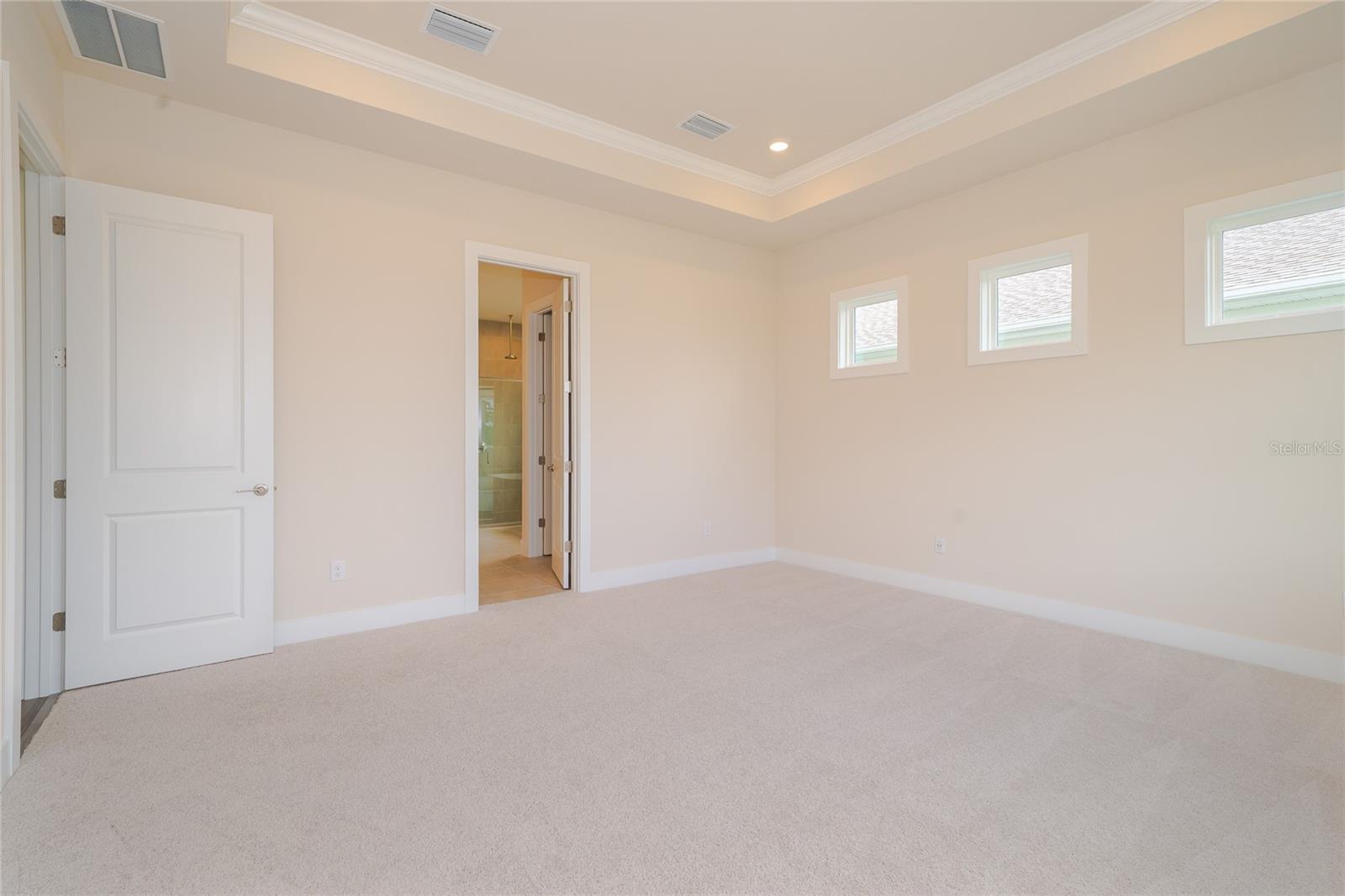 - Crown Molding, Eat-in Kitchen, High Ceilings, Open Floorplan, Primary Bedroom Main Floor, Solid Surface Counters, Split Bedroom, Stone Counters, Thermostat, Tray Ceiling(s), Walk-In Closet(s)