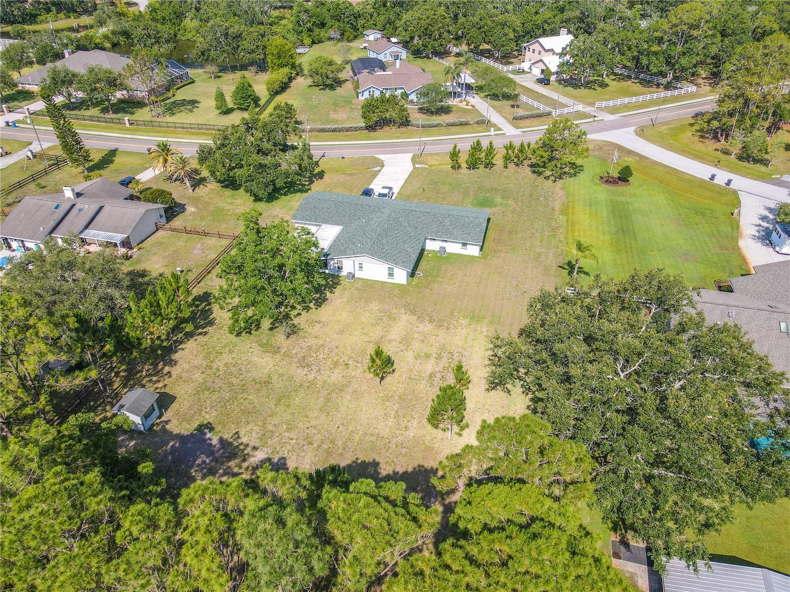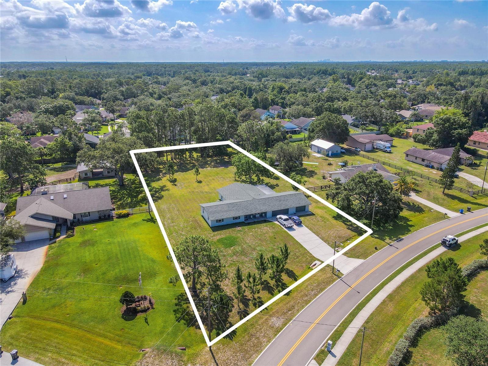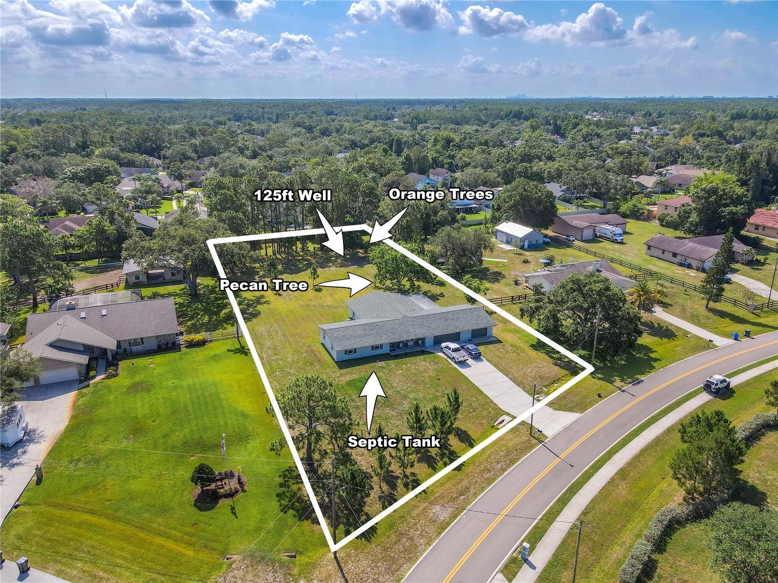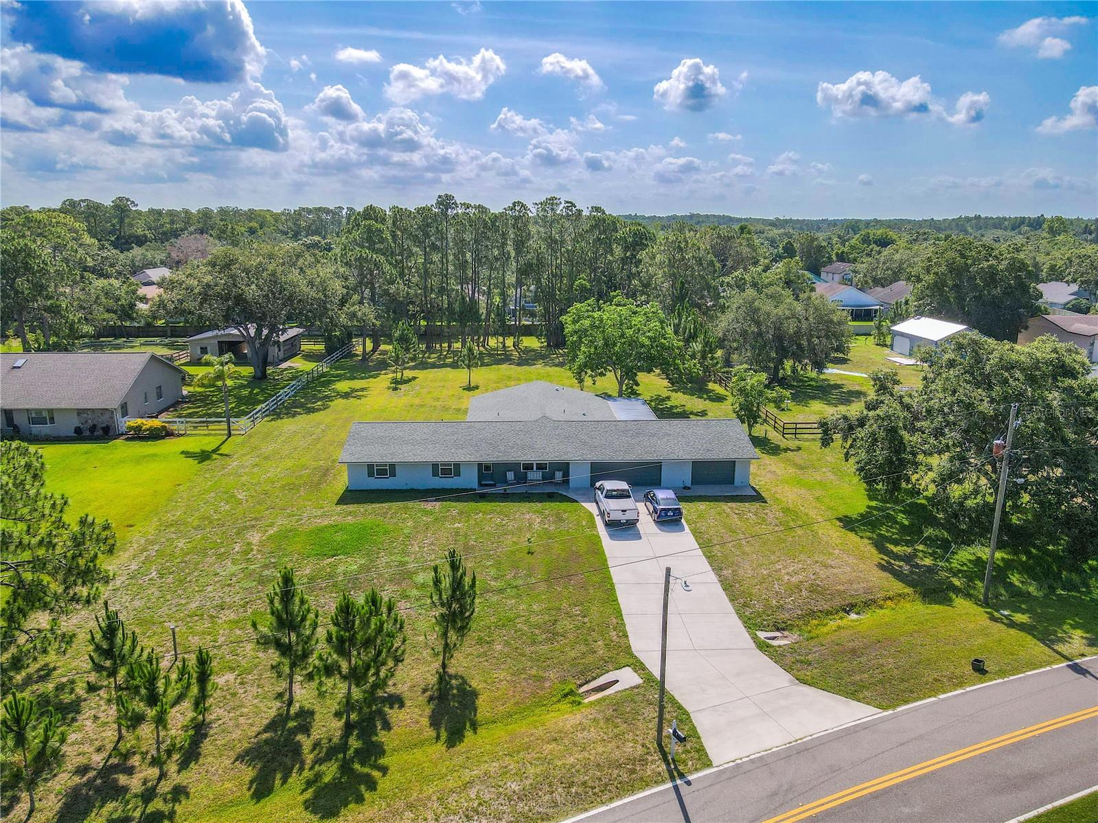 Welcome to your private slice of country living in Twin Branch Acres. This 5-bedroom, 3-bath home sits on one of the highest lots in the neighborhood—safe from the flooding of recent hurricanes—and offers the kind of space and flexibility you won’t often find this close to city conveniences. Set on an expansive lot with pecan and orange trees, birdhouses, and even seasonal visits from bluebirds, the property invites you to spread out and live the lifestyle you’ve been dreaming of. There’s room to bring your horses, park an RV, or design the barn, pool, or guest house you’ve always wanted. Or simply enjoy the land as your own garden oasis, with space to grow fresh vegetables right in your backyard. Designed with practicality in mind, this home keeps energy costs low—often half of what neighbors spend—thanks to efficient construction, ceiling height, and double-pane hurricane-impact windows. A 125-foot private well with pump and water tank makes irrigation simple, while a 2020 roof, 2019 A/C, and 2021 water heater add peace of mind. Inside, the bright and versatile layout offers room for both everyday living and entertaining. The spacious family room flows easily into the open-concept living, dining, and kitchen areas. French doors open to a large screened-in porch overlooking the backyard—a perfect spot to enjoy quiet mornings or watch the sunset. The kitchen is warm and functional with wood cabinetry, stainless-steel appliances, bar seating, and a pass-through to the dining area. A dedicated dining room with laminate flooring easily accommodates a large table for gatherings. The primary suite features three closets with built-in shelving and an ensuite bath with dual vanities and a walk-in shower. Four additional bedrooms provide flexibility for multi-generational living, guests, or home offices. One bedroom includes its own ensuite bath, while the others share a full bath with a tub/shower combo. Practical touches continue with an oversized 2-car garage that includes a tandem bay, laundry area with washer, dryer, and utility sink, plus space for storage or a workshop. A separate utility/work room provides even more functionality. Living in Twin Branch Acres means enjoying the unique charm of a true equestrian community with horse trails, large lots, and a peaceful rural feel—all just minutes from shopping, dining, Tampa Bay Downs, top-rated schools, and major commuter routes into Tampa and Pinellas. This is more than just a home—it’s a lifestyle of freedom, fresh air, and room to grow.