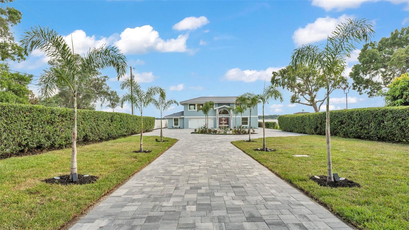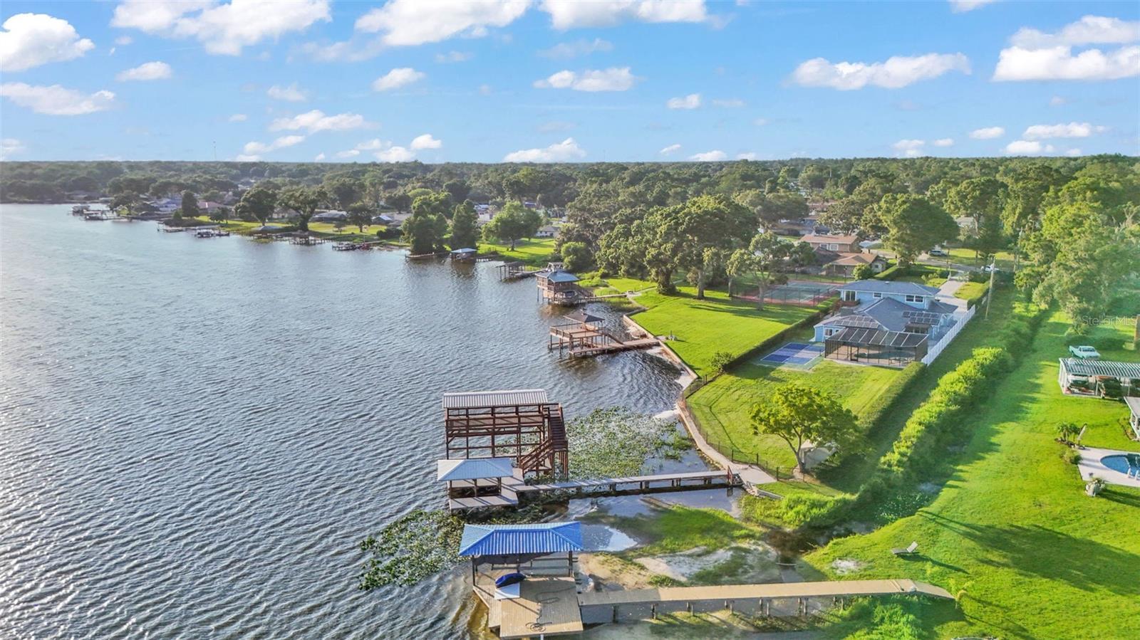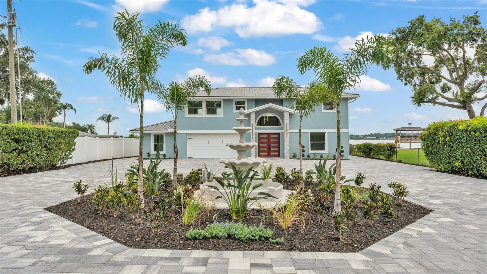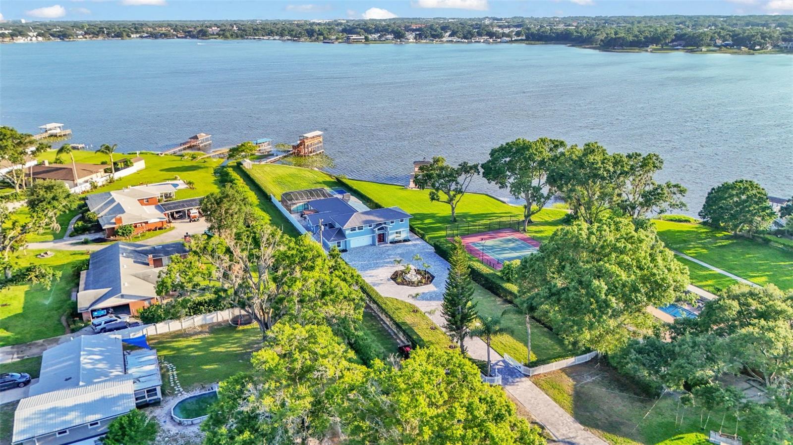 Welcome to 390 Windermere Drive, a stunning lakefront estate in the heart of Lakeland. Meticulously updated and designed with luxury in mind, this 5-bedroom, 6-bathroom residence offers over 3,500+- square feet of beautifully finished living space—perfect as a primary residence, vacation retreat, or investment property. It sits on just under 1 acre and is a private waterfront getaway. From the moment you arrive, this property makes a statement. A gated entrance opens to a custom brick driveway and landscaped island, framed by lush privacy hedges. A spacious two-car garage and separate golf cart garage provide ample storage for vehicles and recreational gear. Step inside to discover a bright, modern interior with high-end porcelain flooring, a dramatic custom staircase, and soaring ceilings. The open-concept kitchen and living area is an entertainer’s dream, featuring tray ceilings, elegant chandelier lighting, magazine-worthy finishes, and top-tier appliances. Adjacent is a formal dining area and additional dinette—ideal for prep or informal meals. The home offers three luxurious bedroom suites with private baths, a dedicated office, and a second-floor balcony with stunning lake views. Every detail has been thoughtfully curated, including recent updates to the roof, windows, doors, and systems throughout. The outdoor living space is nothing short of a private resort. Enjoy the screened-in heated pool, a dry sauna, and an outdoor bathroom—all under a covered lanai. Beyond the pool area, you'll find your own private sports complex with a pickleball court, fully fenced for added privacy. What truly sets this home apart is the two-level dock, complete with a boat lift, jet ski lift, and covered balcony overlooking beautiful Lake Gibson—perfect for sunset cocktails or early morning coffee. With 58 fully owned solar panels, this home offers energy efficiency you will appreciate. Located just minutes from I-4, top-rated schools, shopping, and dining, and an easy drive to both Tampa and Orlando, this home offers the best of lakefront living with modern convenience. Don’t miss the opportunity to own one of Lakeland most exceptional waterfront properties.